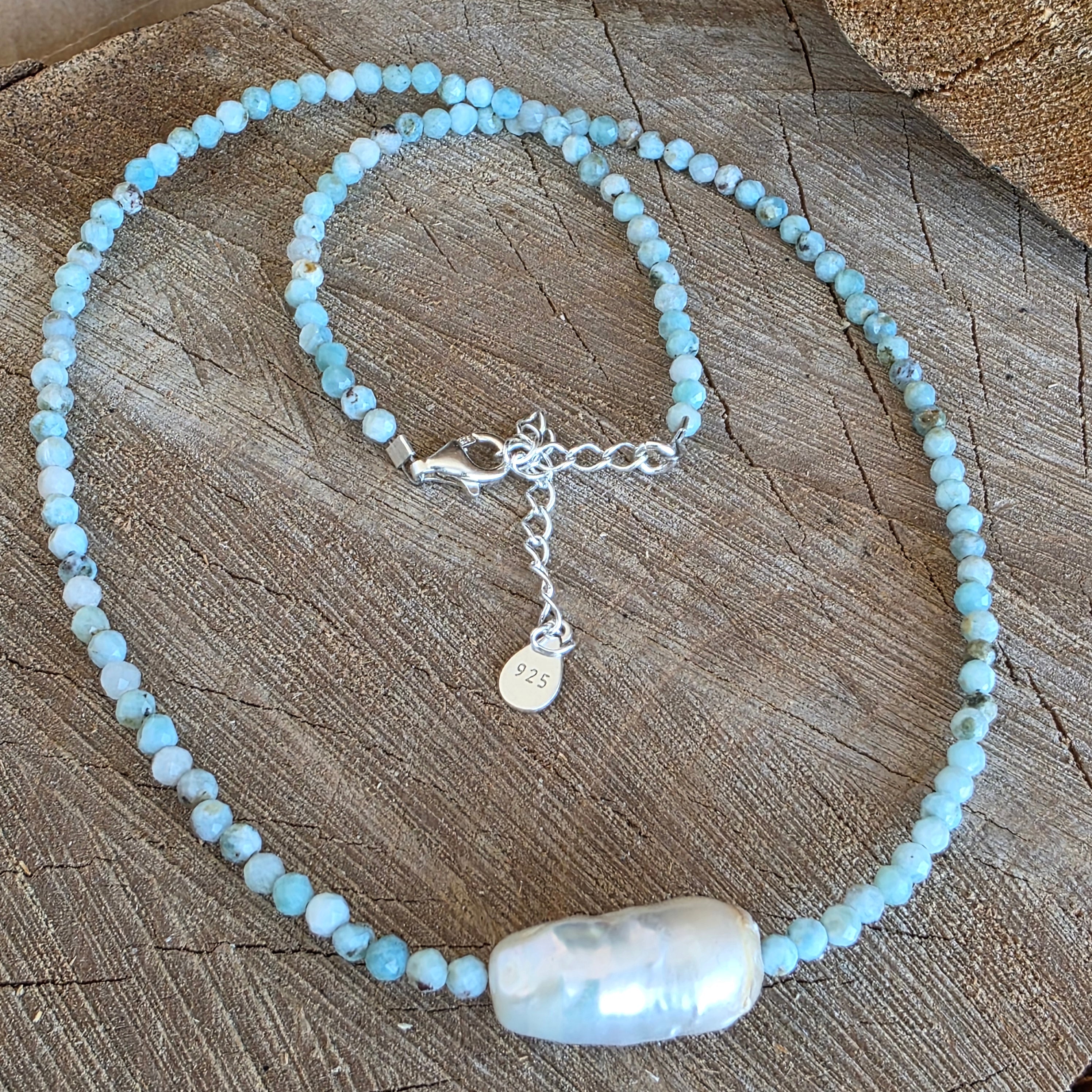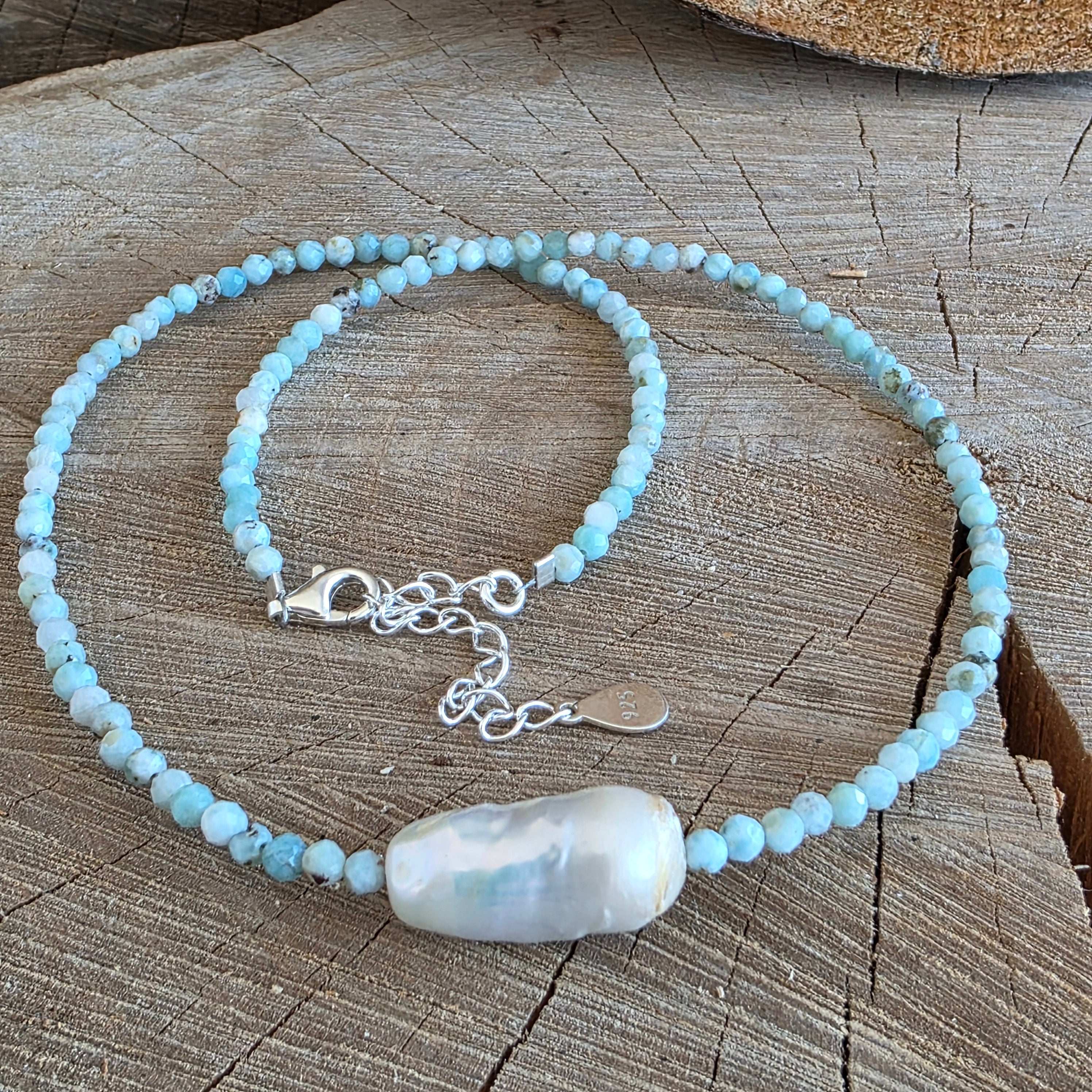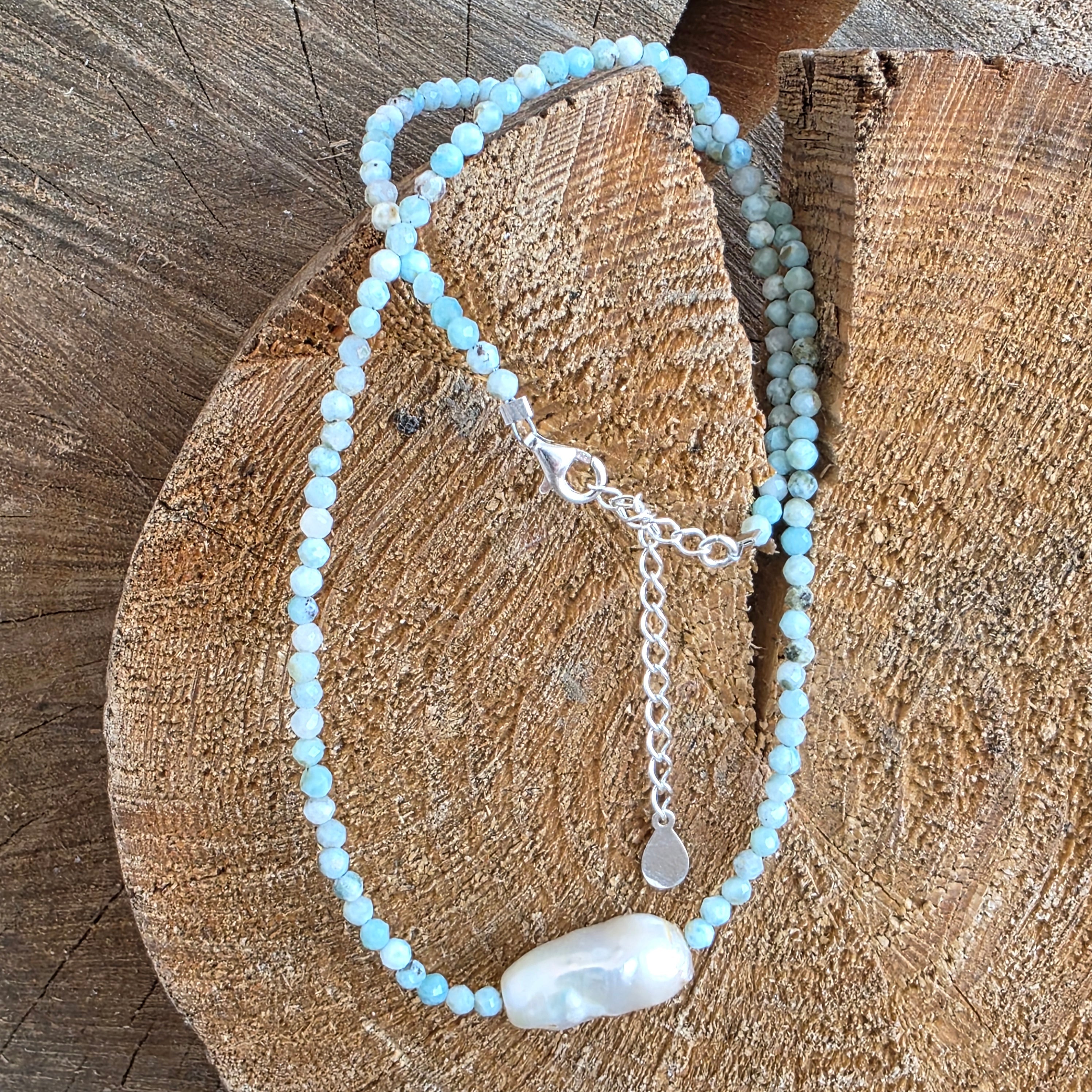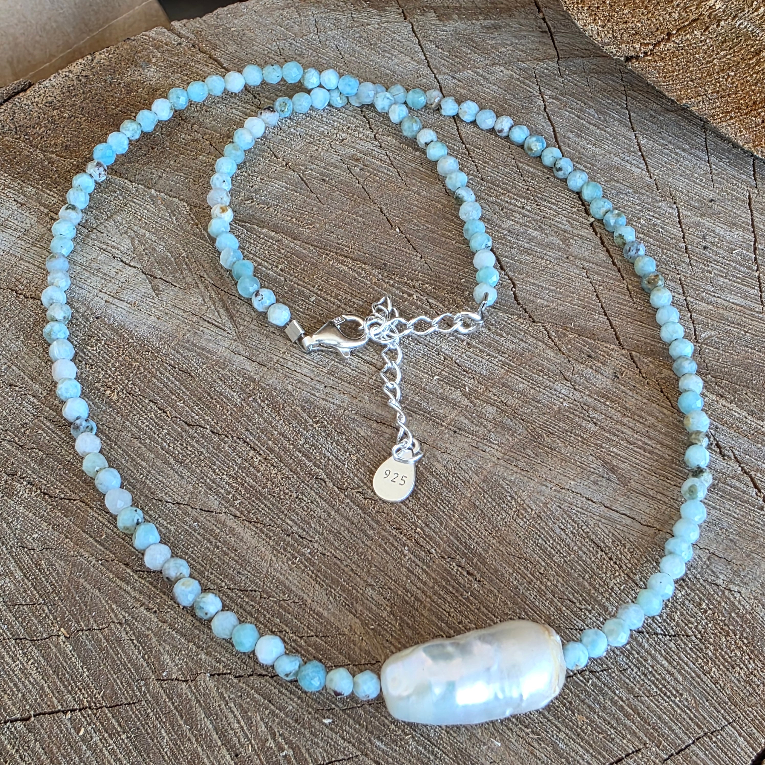 Egy világos és kifinomult nyaklánc, amely 3 mm-es csiszolt larimar gyöngyökből készült, kiegészítve egy 1,8 cm-es díszgyönggyel, amely diszkrét és kiegyensúlyozott hangsúlyként helyezkedik el. A larimar világoskék színe, tejes árnyalataival és finom hullámzásaival, a víz nyugalmát és a tér nyitottságát idézi, míg a gyöngyök finom, organikus kontrasztot adnak, amely mélységet és klasszikus eleganciát kölcsönöz az ékszernek. A finom csiszolás finoman ragyogja be a fényt, miközben könnyed és harmonikus megjelenést biztosít.
