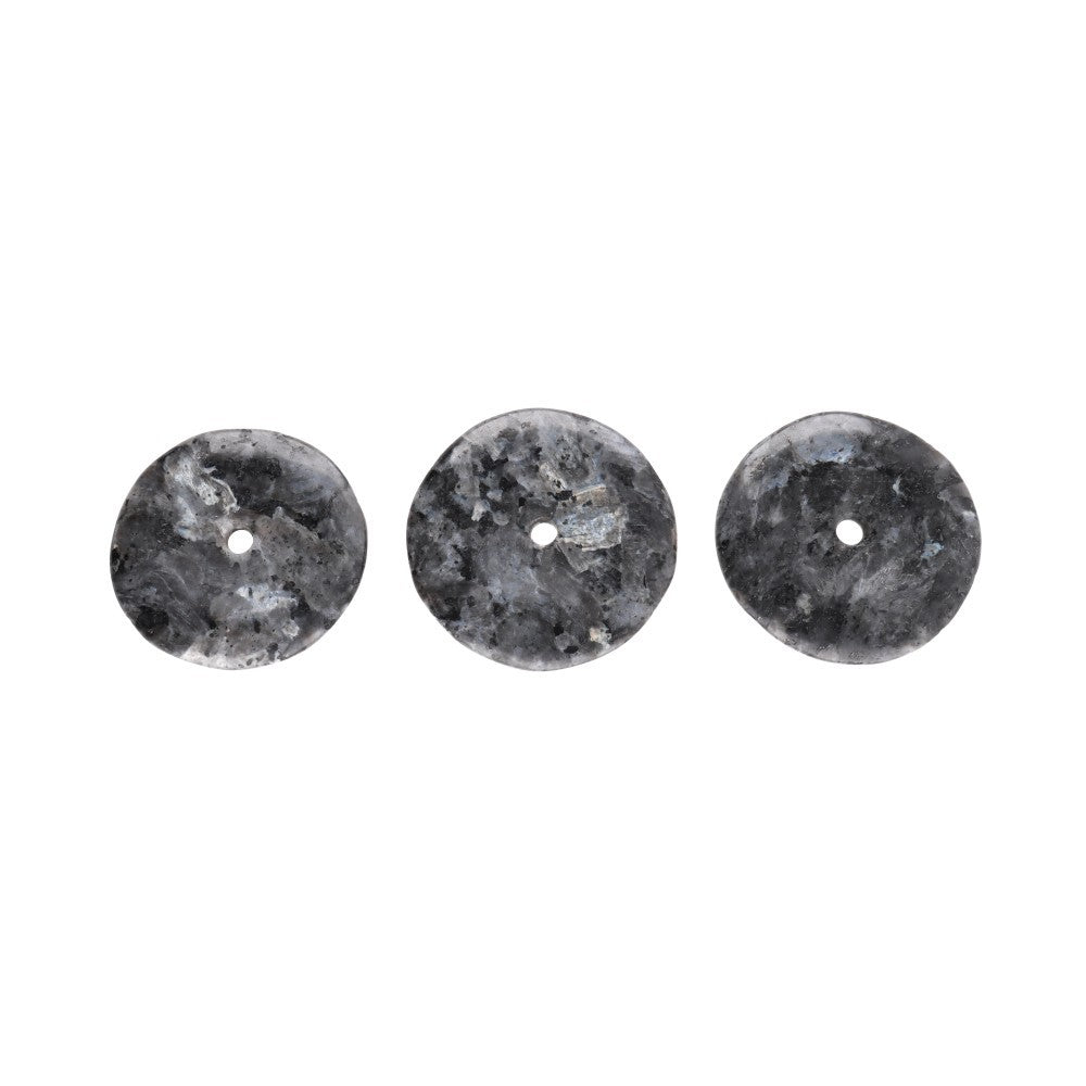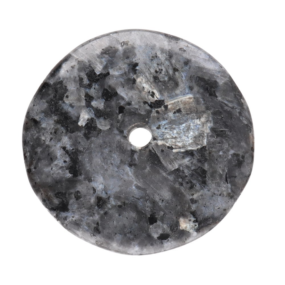 Az L méretű larvikit kő donut medálja a hold fényét a vízen tükröződő árnyalatokra emlékeztető ezüstös-kékes reflexeiről ismerhető fel.