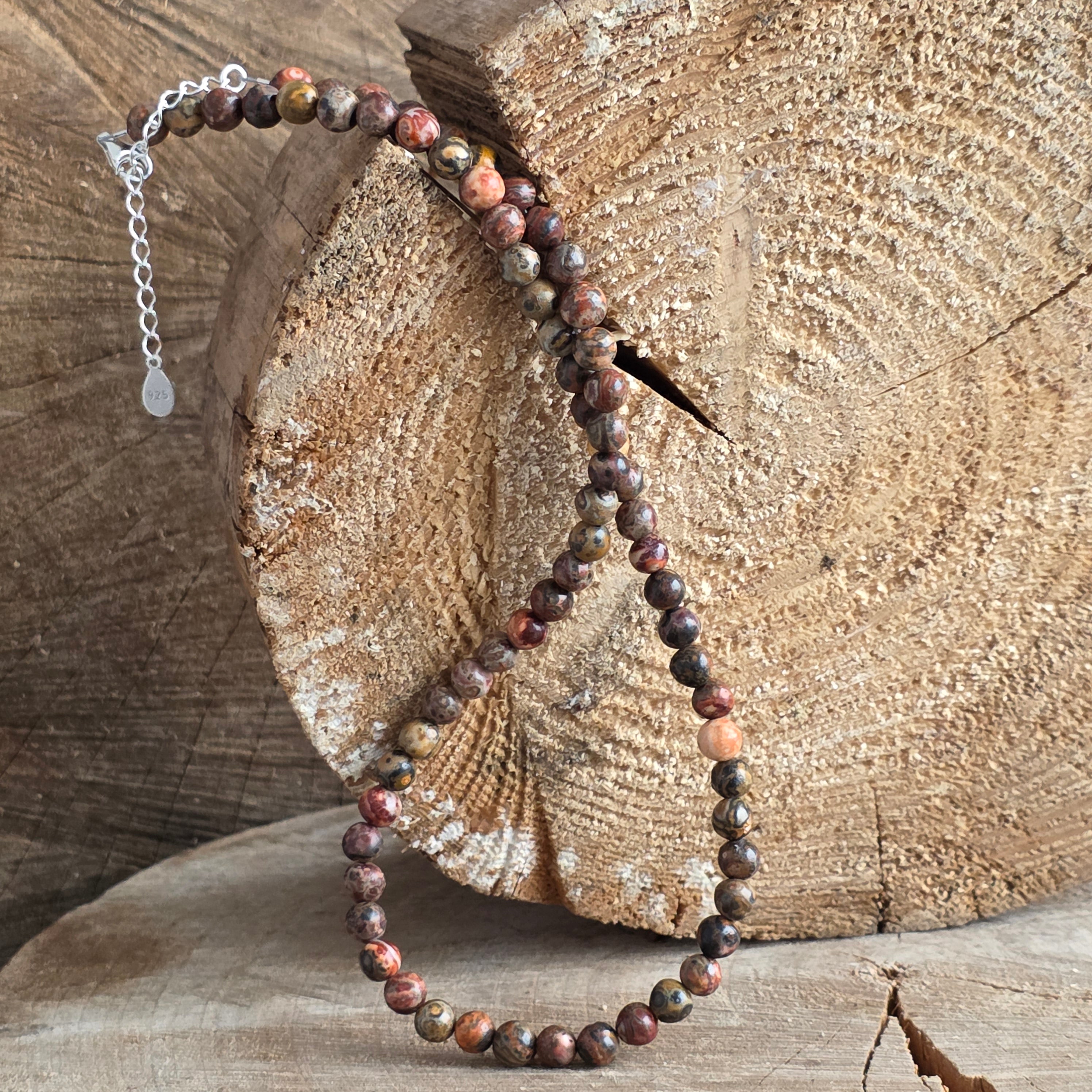 Egy nyaklánc, amely felszínre hozza a föld csendes erejét és a természet ösztönös eleganciáját. A 6 mm-es természetes leopárdjaspis élénk textúráival és meleg, földszínű tónusok kombinációjával tűnik ki, amelyek olyanok, mintha száraz, sziklás és élettel teli tájakból származnának. A sima gömb alak természetes folyékonyságot kölcsönöz az ékszernek, míg az ezüst időtlen kifinomultságot ad.