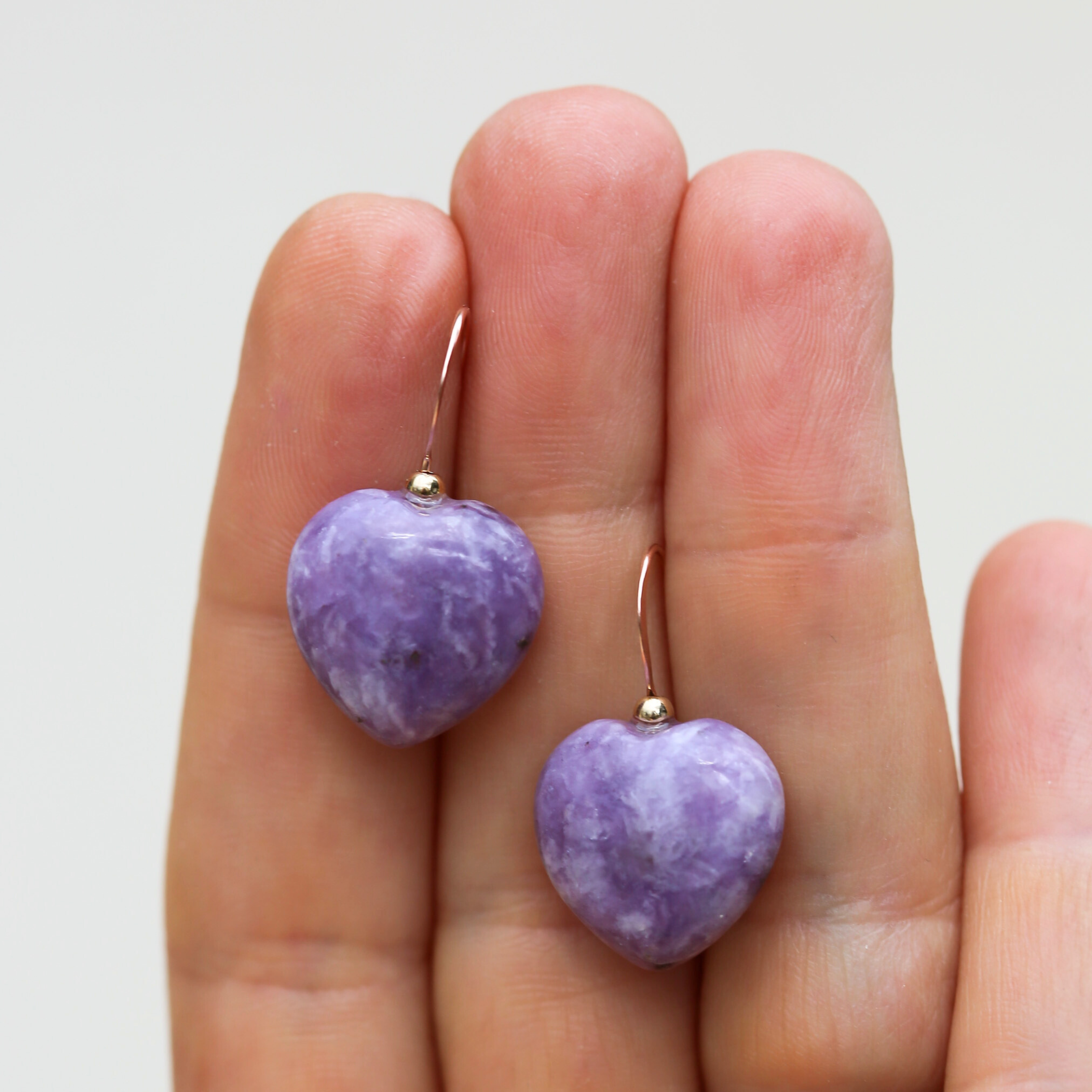Nyugodt, bársonyos lila árnyalatával a Hearts Lavender fülbevalók nyugtató és nőies hangulatot árasztanak. A lepidolit, amelyet gyengéd és kiegyensúlyozó energiájáról ismernek, a 14K arany meleg fényében még inkább érvényesül.