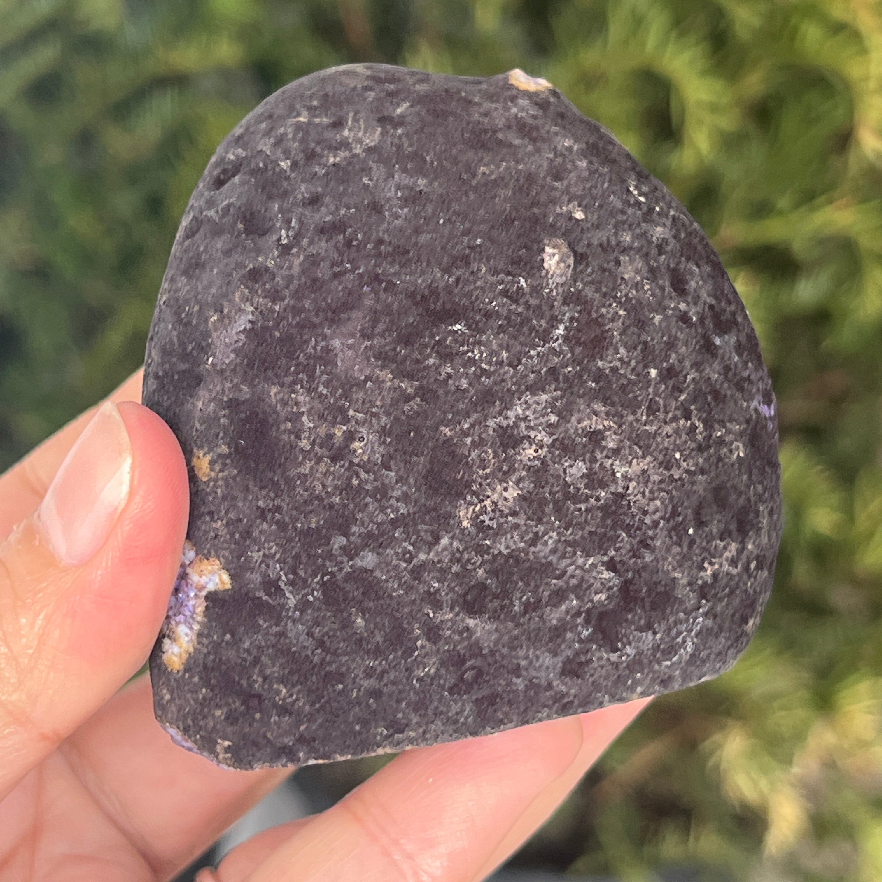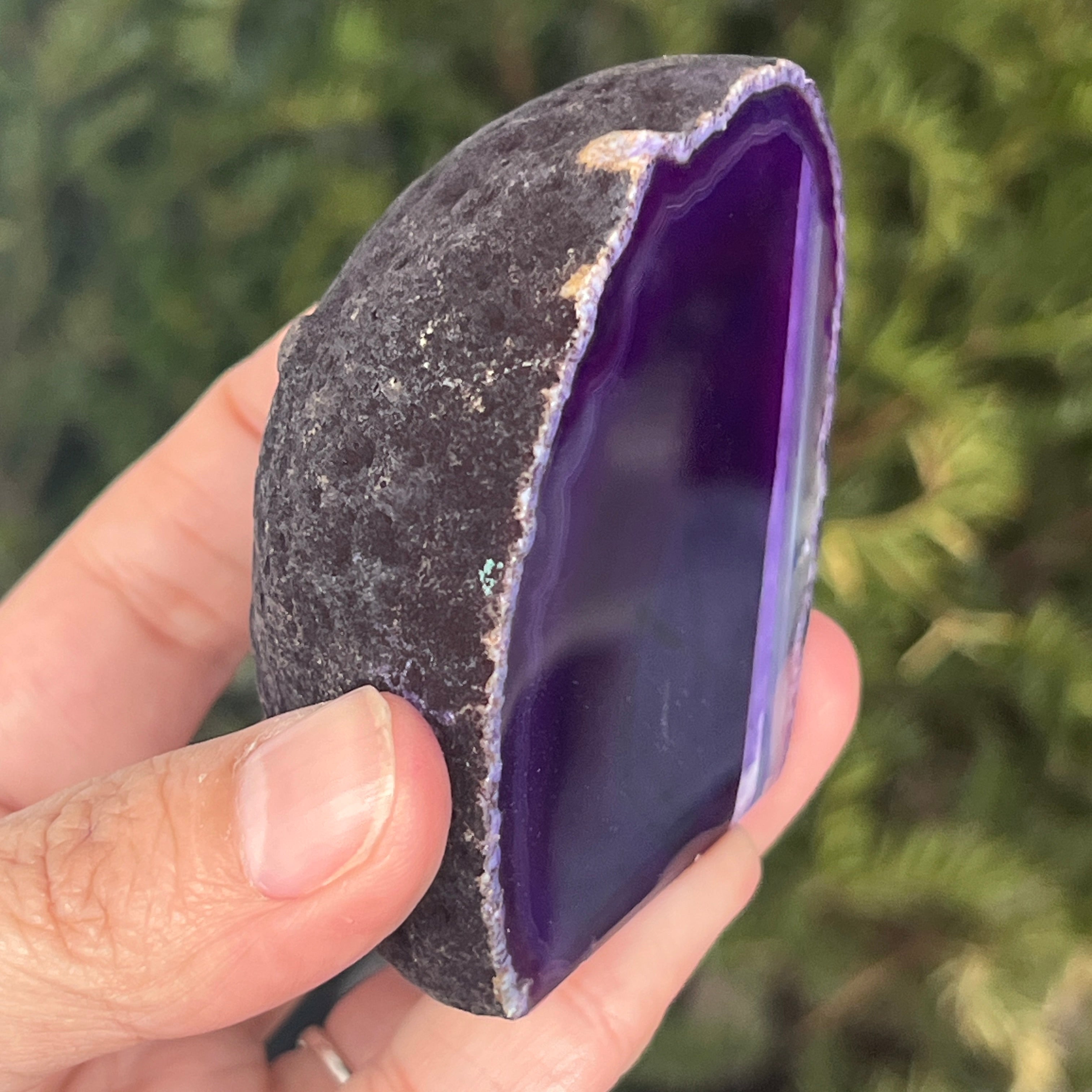 A lila achát a kalcedon egy változata, a kvarc egy mikrokrisztályos formája, amelyet a vulkáni kőzetek üregeiben kialakult rétegzett szerkezete jellemez. A violett szín kiemeli az ásvány finom sávjait és látványos kontrasztokat teremt. Mind esztétikai egyedisége, mind a nyugalomhoz, intuícióhoz és szellemi tisztasághoz kapcsolódó szimbolikája miatt kedvelt.