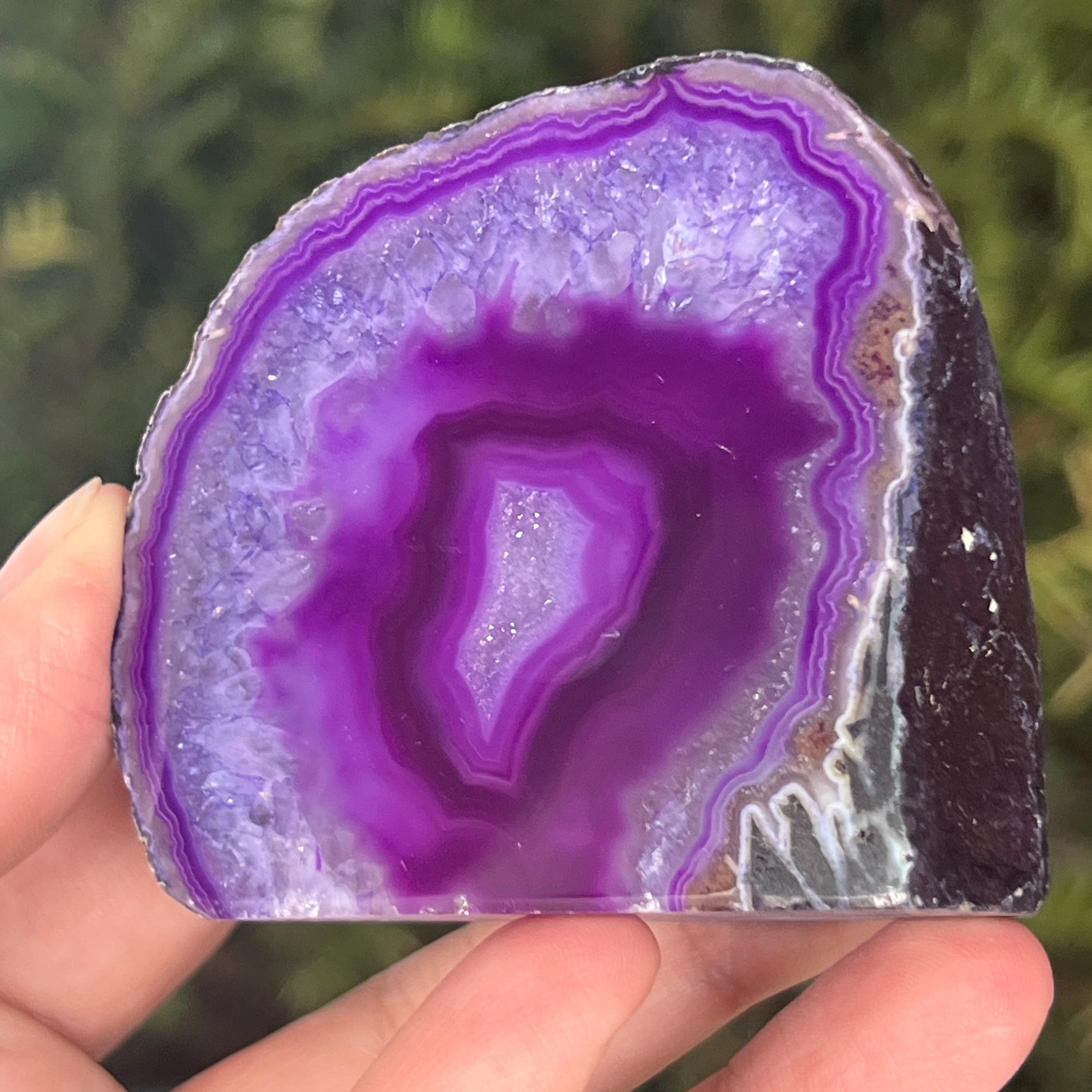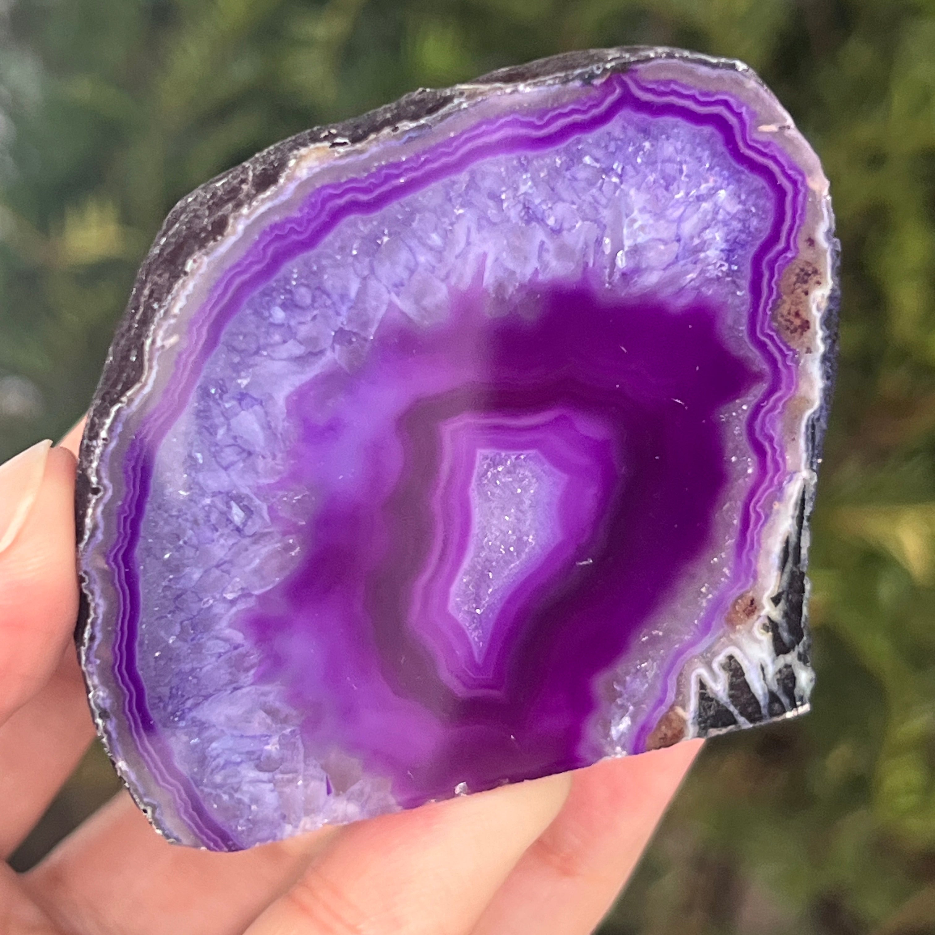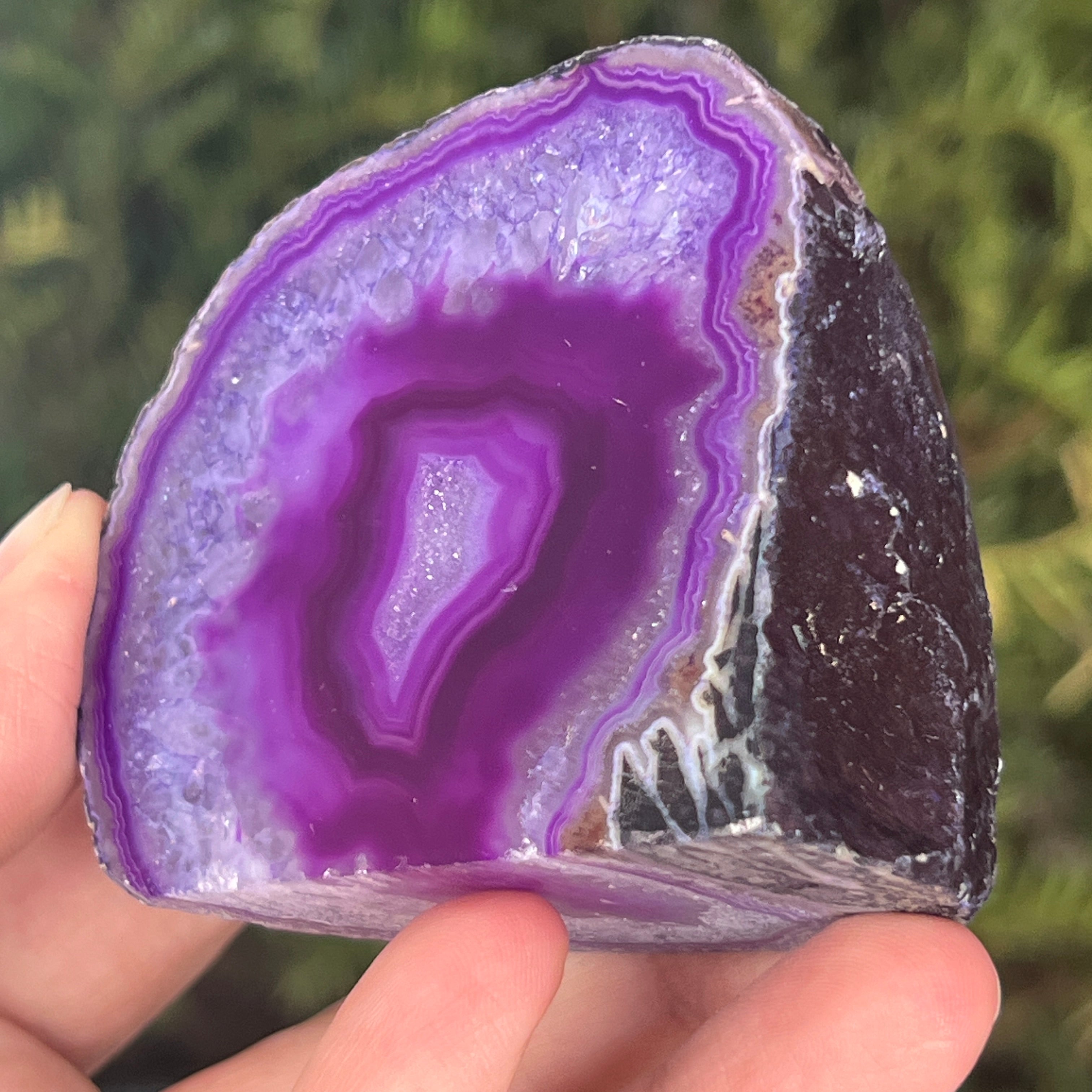 A lila achát a kalcedon egy változata, a kvarc egy mikrokrisztályos formája, melyet a vulkáni kőzetek üregeiben kialakult rétegzett szerkezete jellemez. A violett szín kiemeli az ásvány finom sávjait és látványos kontrasztokat teremt. Mind esztétikai egyedisége, mind a nyugalomhoz, intuícióhoz és szellemi tisztasághoz kapcsolódó szimbolikája miatt kedvelt.