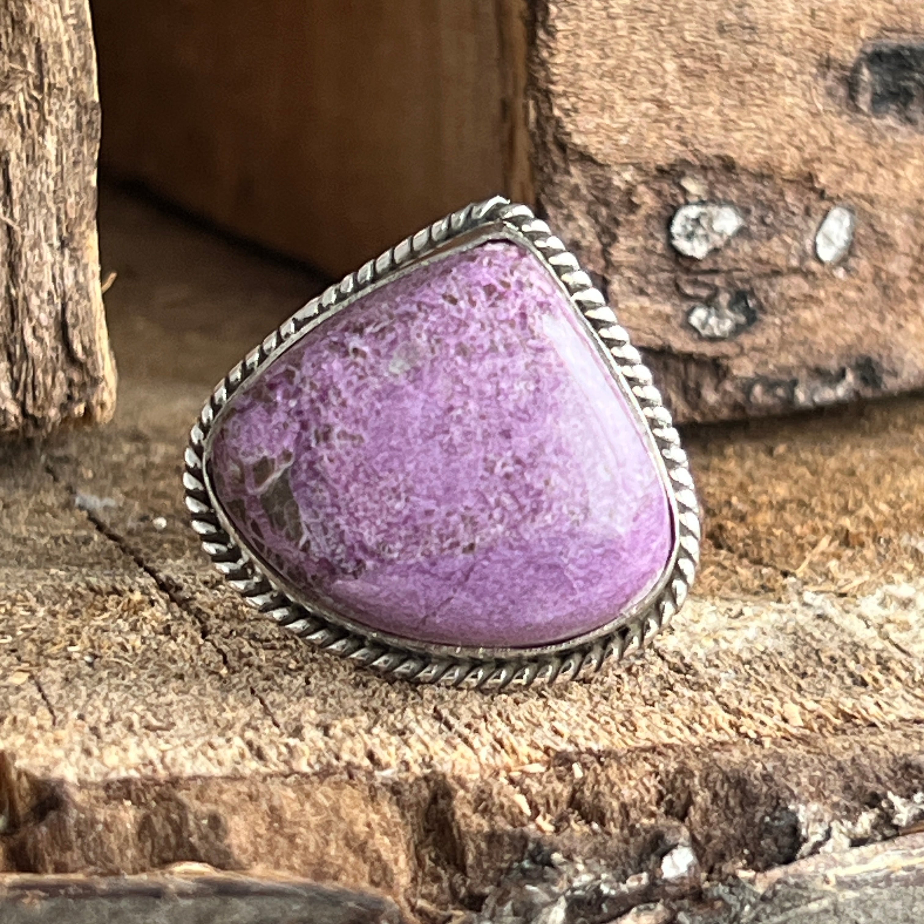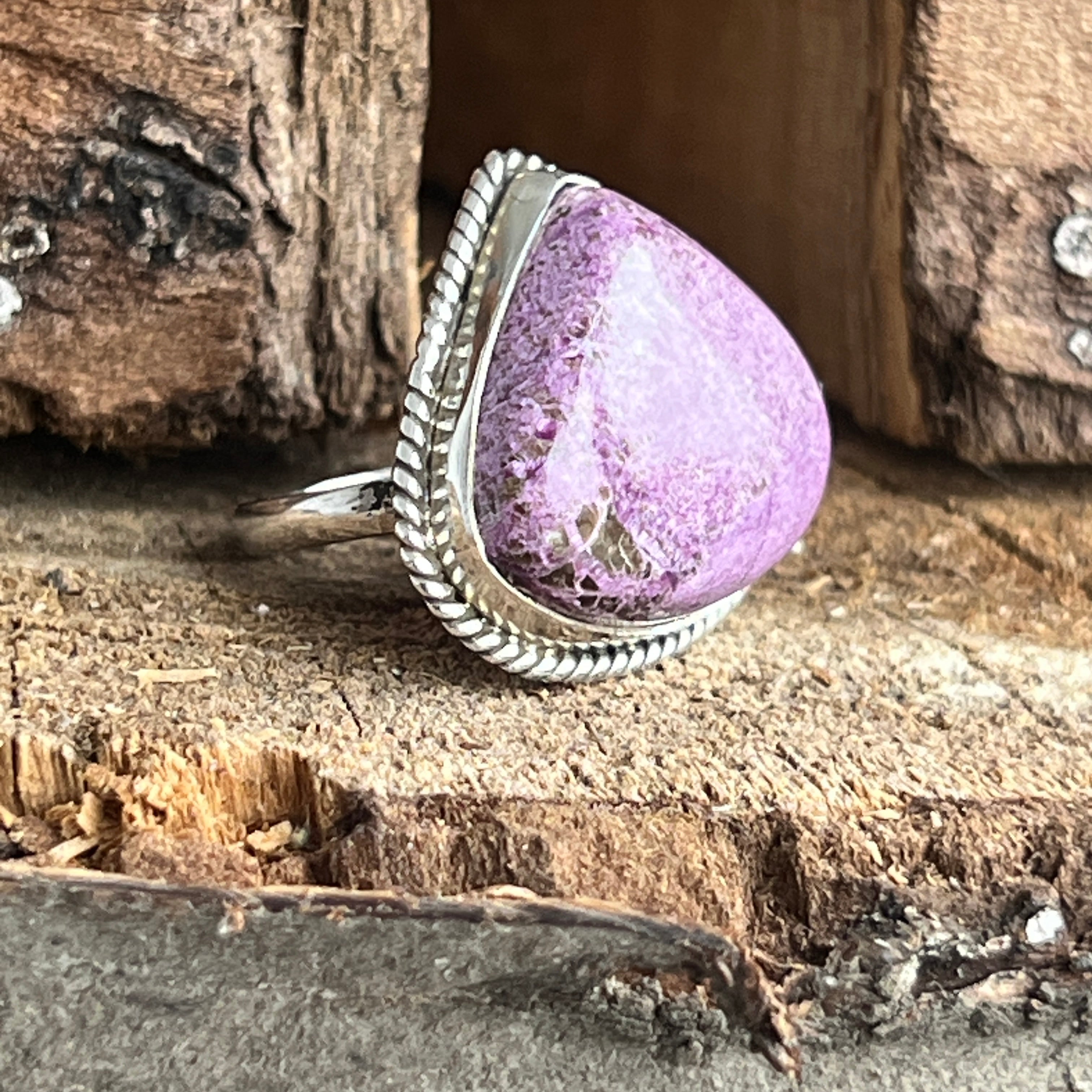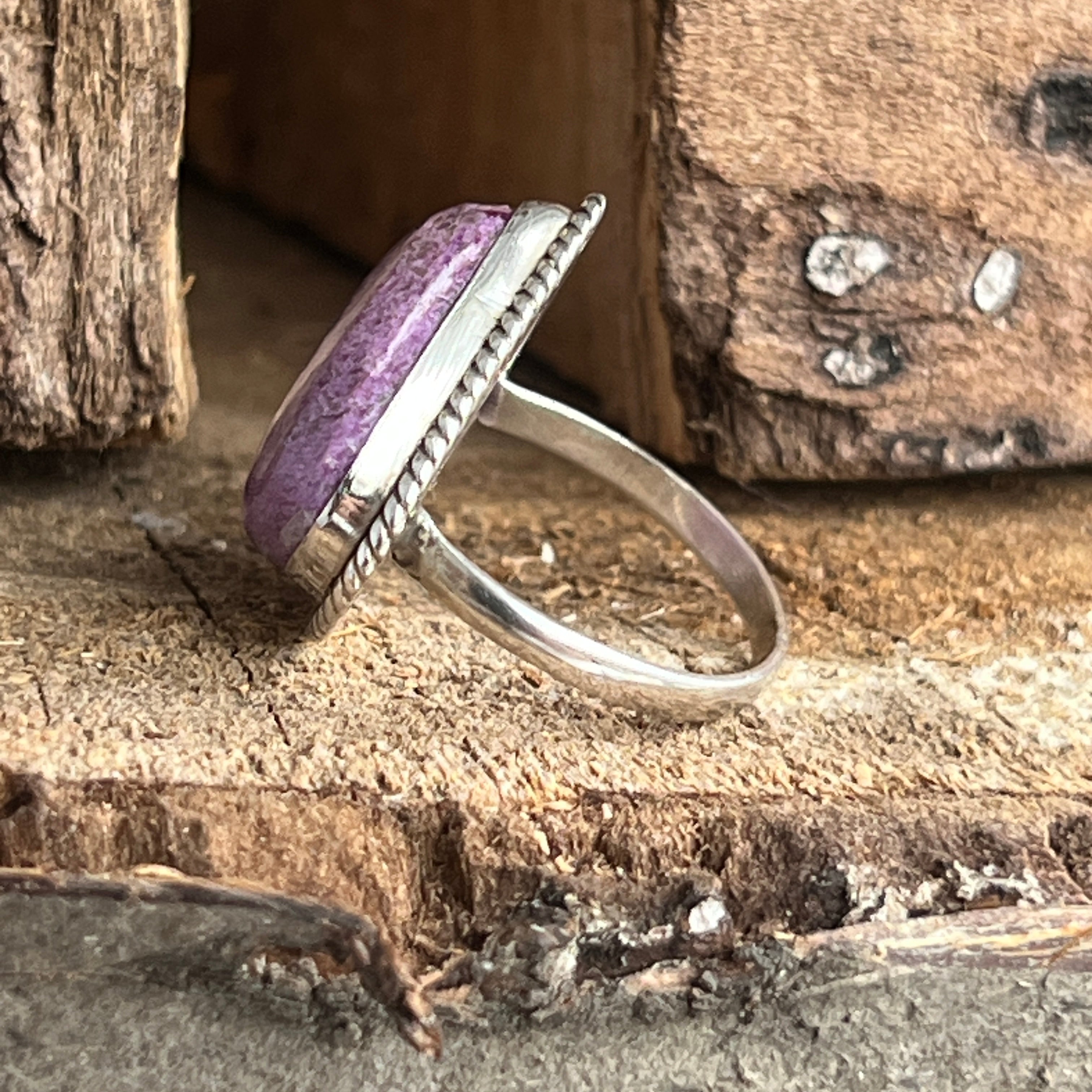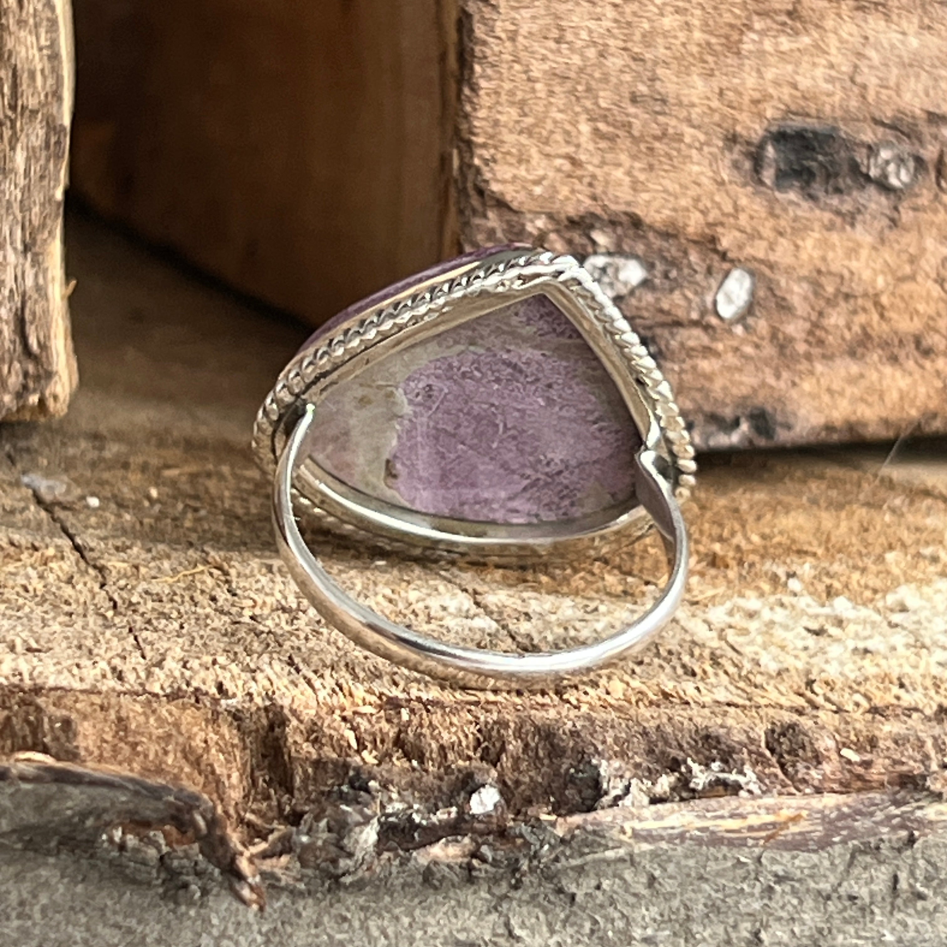 Elegáns és kifejező gyűrű, kézzel készített 925 ezüst és természetes kővel díszített Lila, mélylila árnyalataival és matt tükröződésekkel, amelyek erre a ritka kőre jellemzőek. A tervezés csavart drót finoman keretezi a követ, kiemelve nyers és autentikus textúráját.