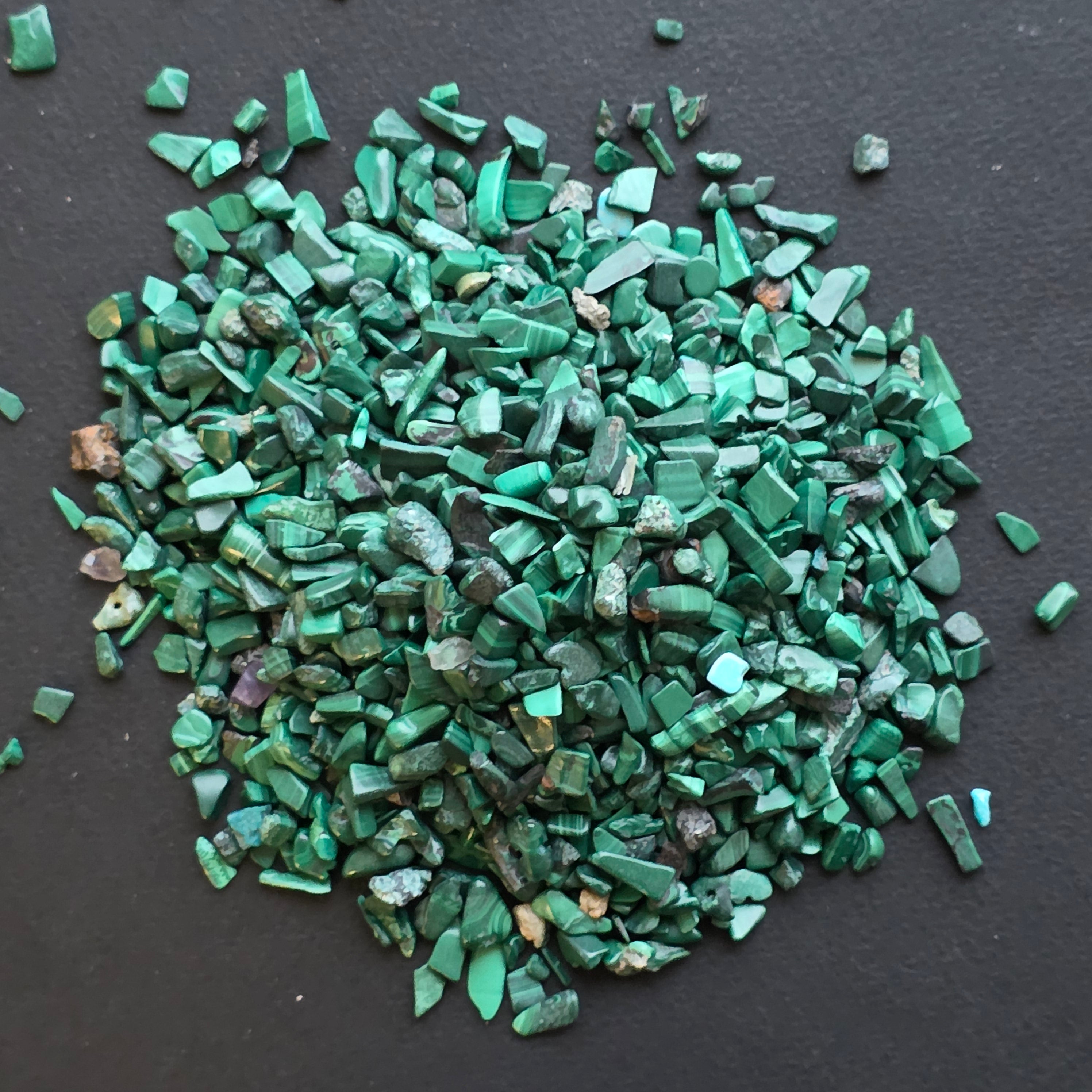 A malachit az egyik legismertebb zöld kő az ásványvilágban, híres koncentrikus sávjairól és a világos- és mély smaragdzöld között váltakozó színű hullámairól. Chips formájában természetes szépsége érintetlen marad: kis, élénk töredékek, organikus mintázatokkal és árnyalatváltozásokkal, mintha finoman festett rétegekből állnának.