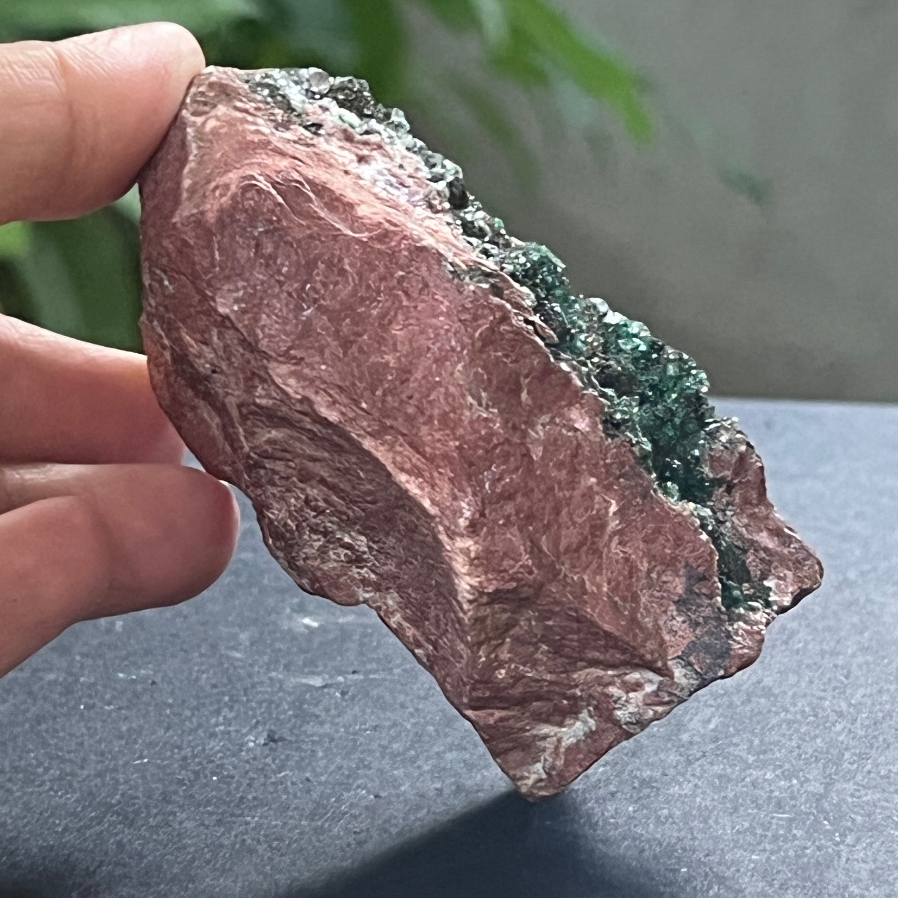 Egy ritka természetes alkimia darabja, ahol a dolomit finom fénye összefonódik a malachit intenzív zöldjével, mindezt egy erős réz alapban. Ez az autentikus klaszter magában hordozza a föld lassú történetét – egy találkozás a nyugalom, az átalakulás és az életerő között.