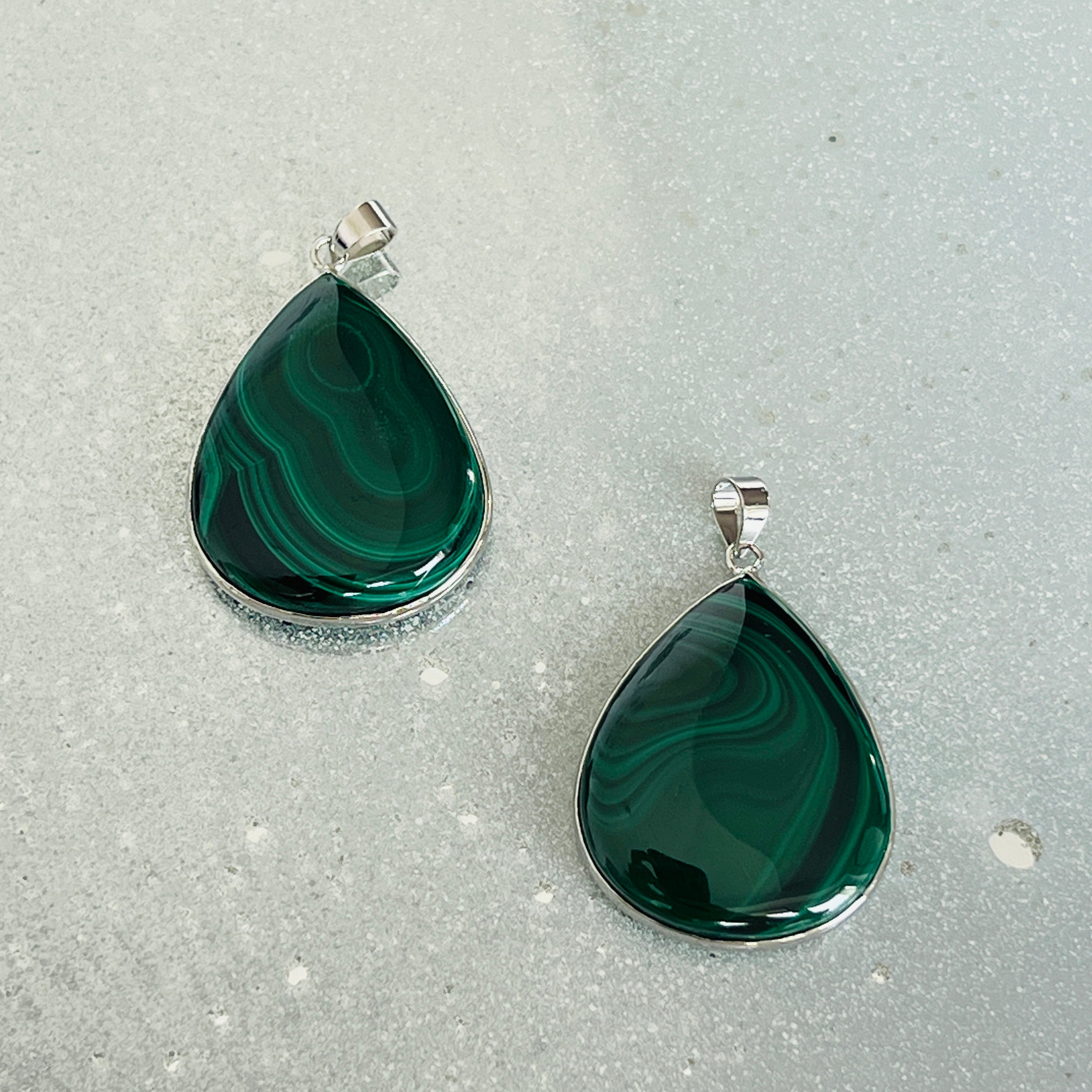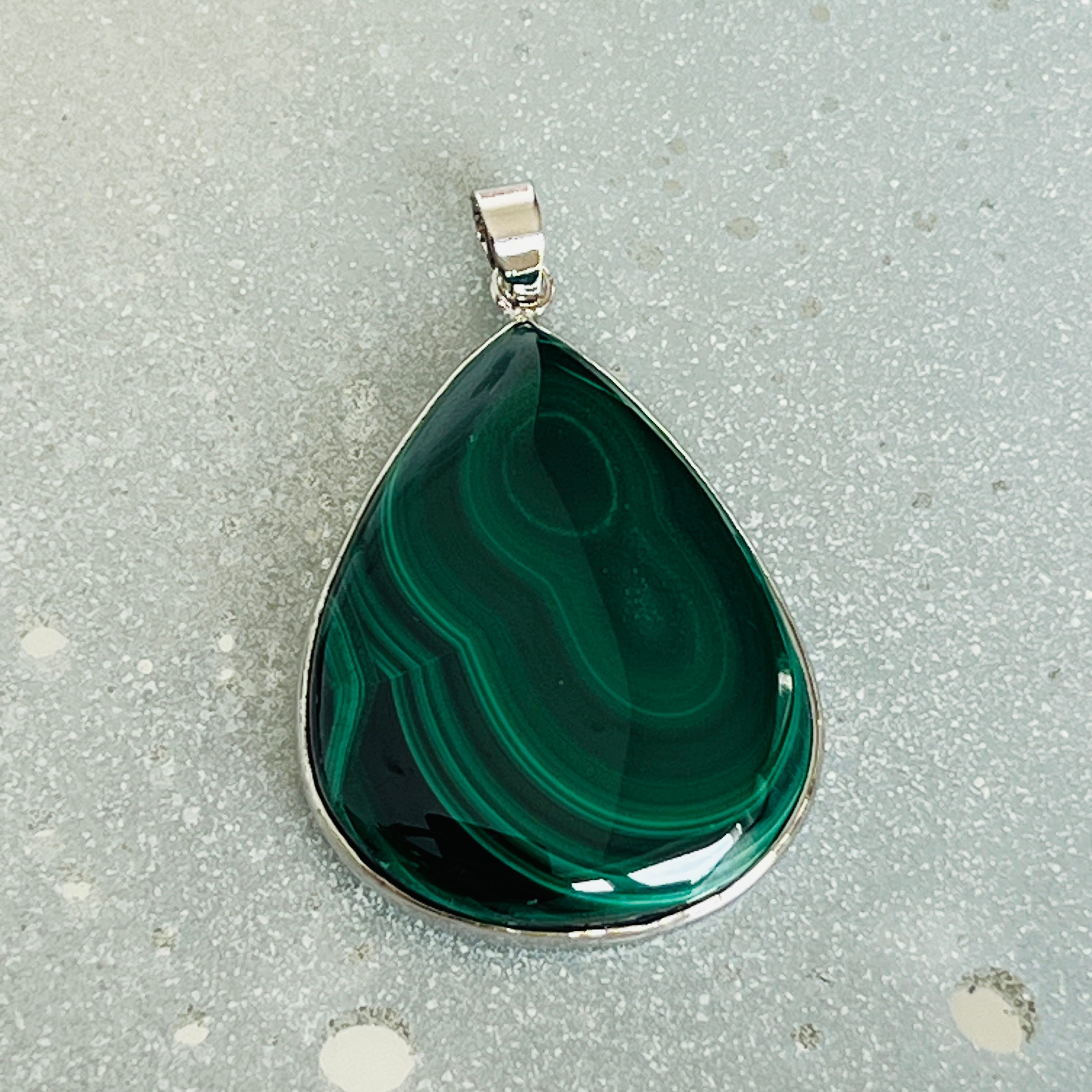 Egy kifejező malachit medál, csepp alakban, amely kiemeli ennek a kőnek a természetes szépségét egyedülálló mintázatával, koncentrikus zöld sávokkal.