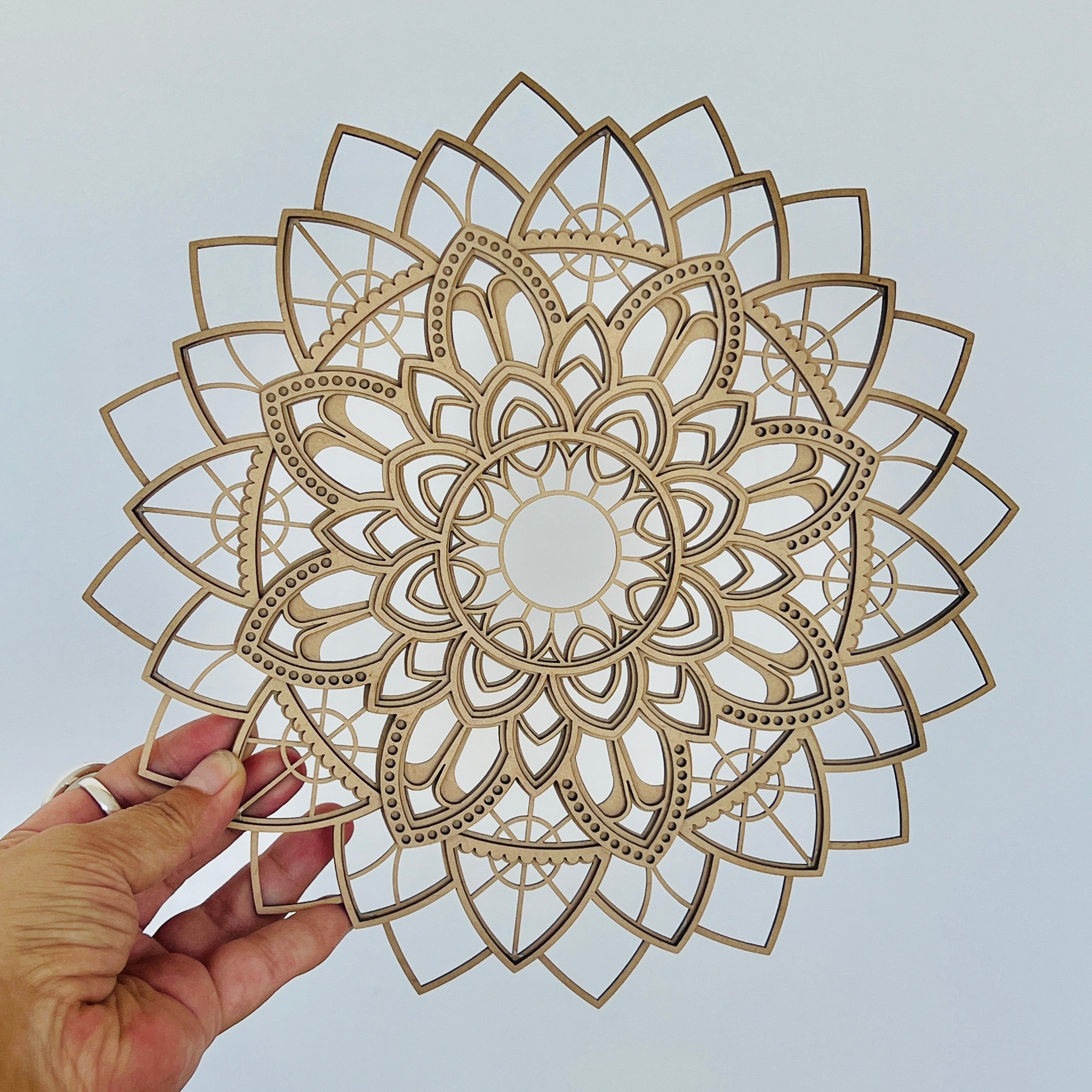 Ez a faragasztott MDF-ből lézervágott falimandala tökéletes egyensúlyt hoz teredbe az esztétika és a szakrális szimbolizmusközött. Több réteg egymásra helyezésével a dekoráció látványos háromdimenziós hatástkap, bármely falat vizuális látványossággá változtatva.