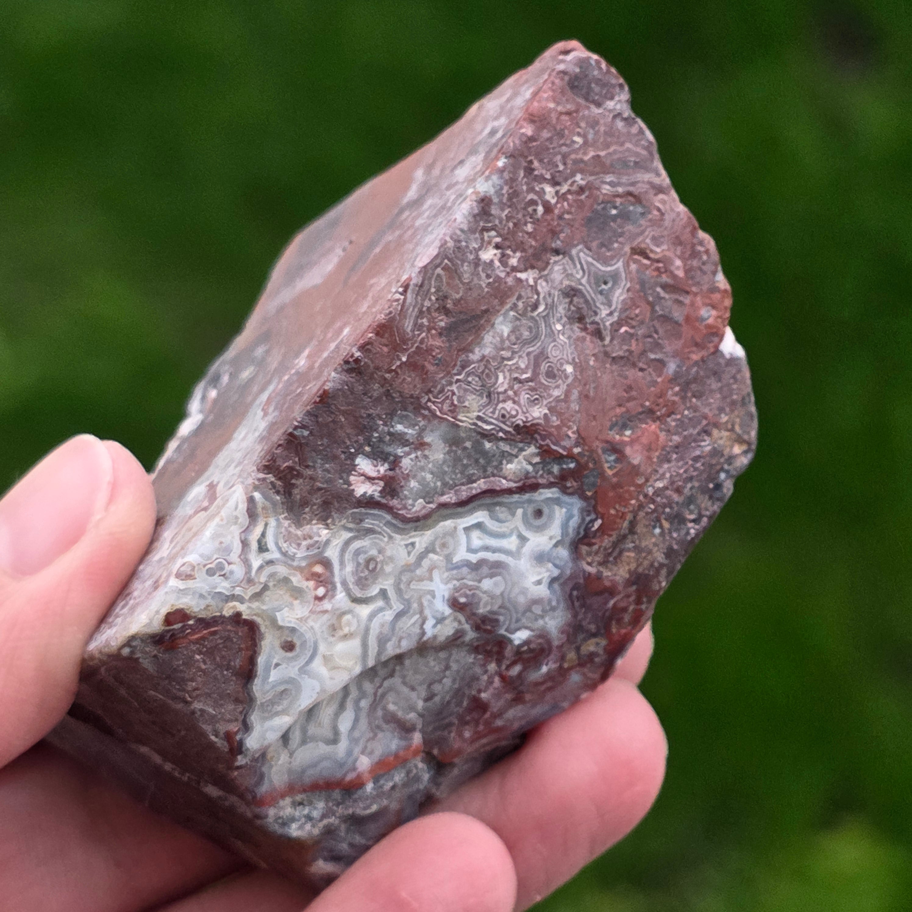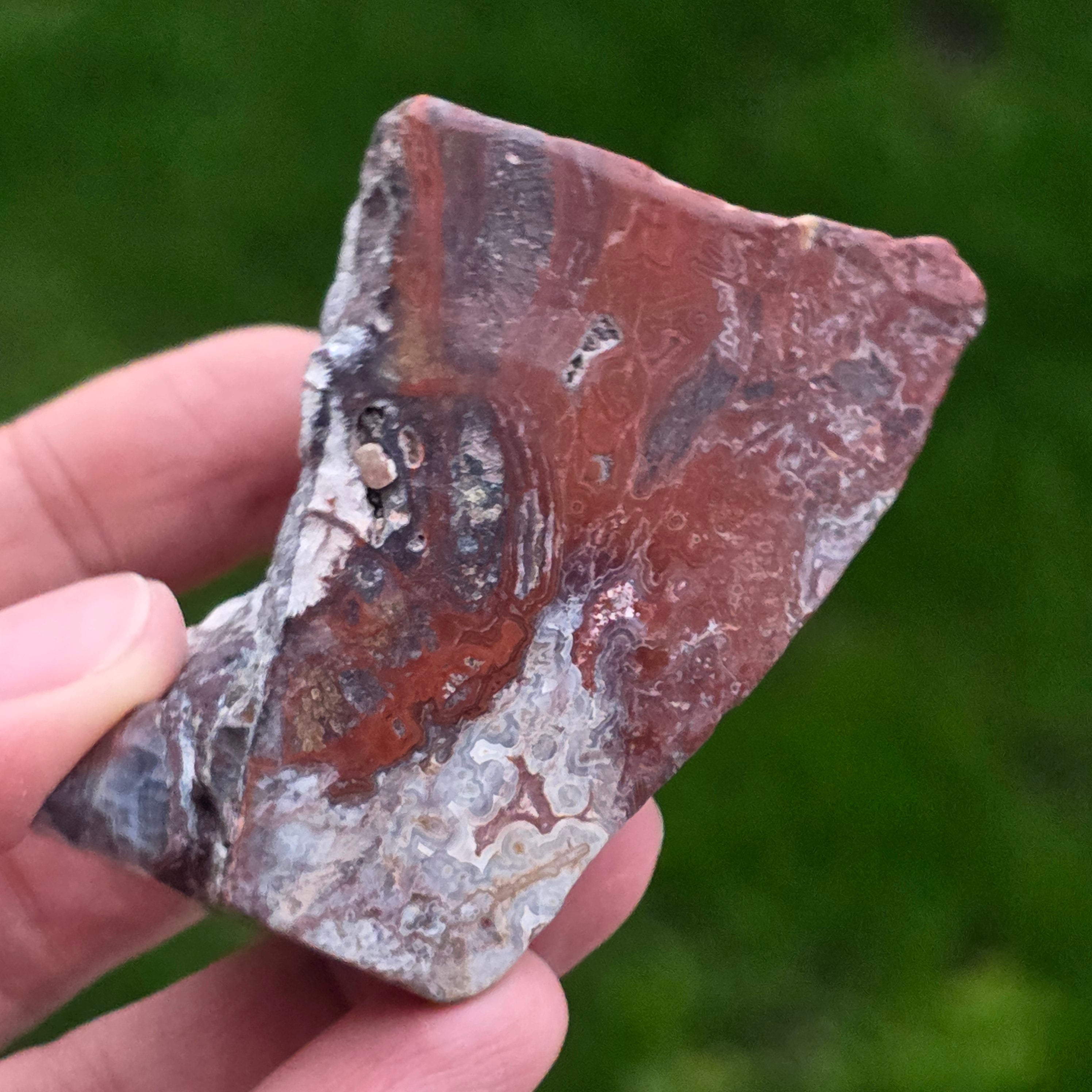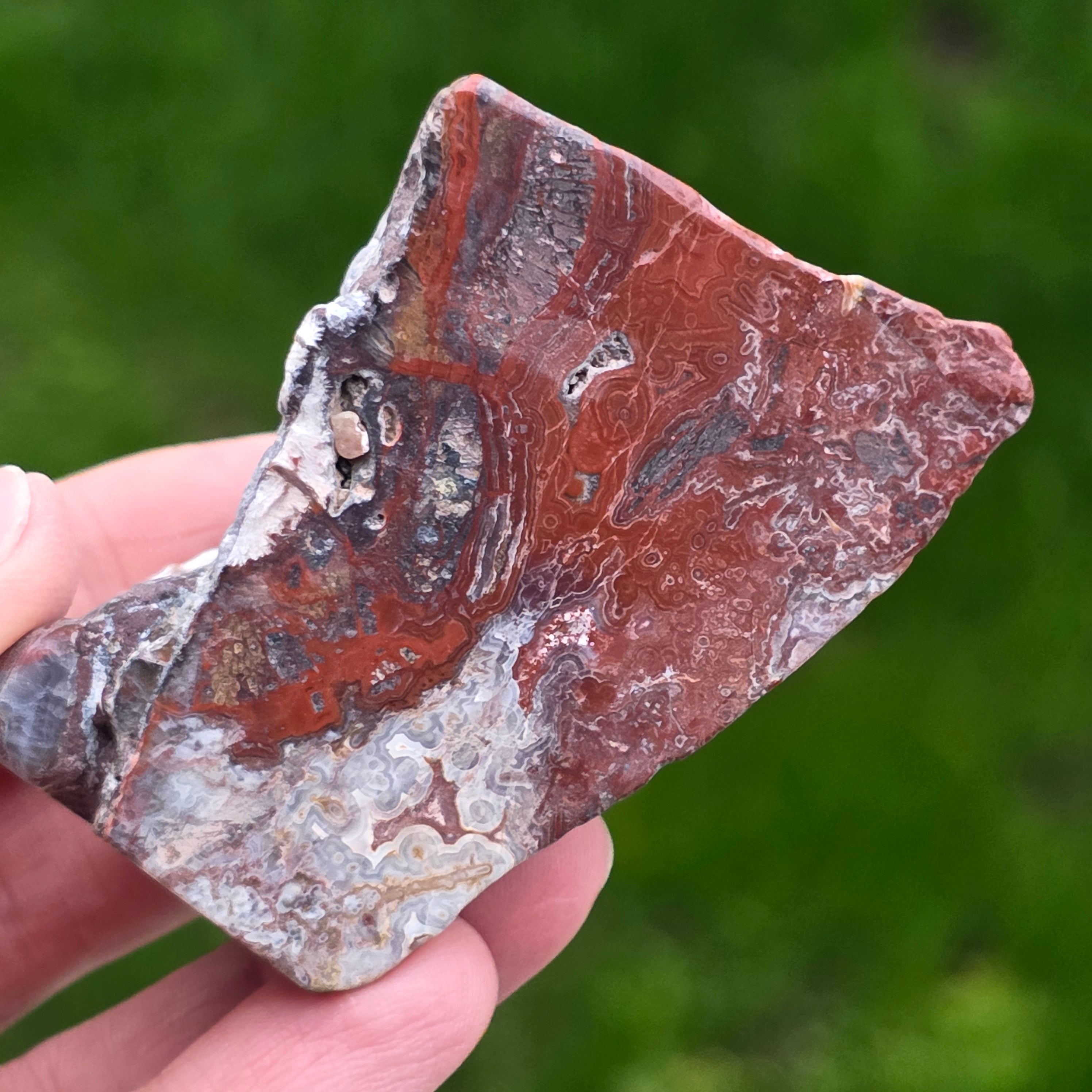 A mexikói Crazy Achát az achát leglátványosabb és legélénkebb változatai közé tartozik, híres hullámos vonalairól és a szabad kézzel, szabályok nélkül festett őrült színjátékairól. Ebben a természetes szeletben, kicsi, de rendkívül kifejező, a kő teljes története feltárul: földes rétegek, meleg karamellszínek, élénkpiros, narancs, szürke és krém árnyalatok, spirális mintákba keveredve, mintha élettel pulzálnának.