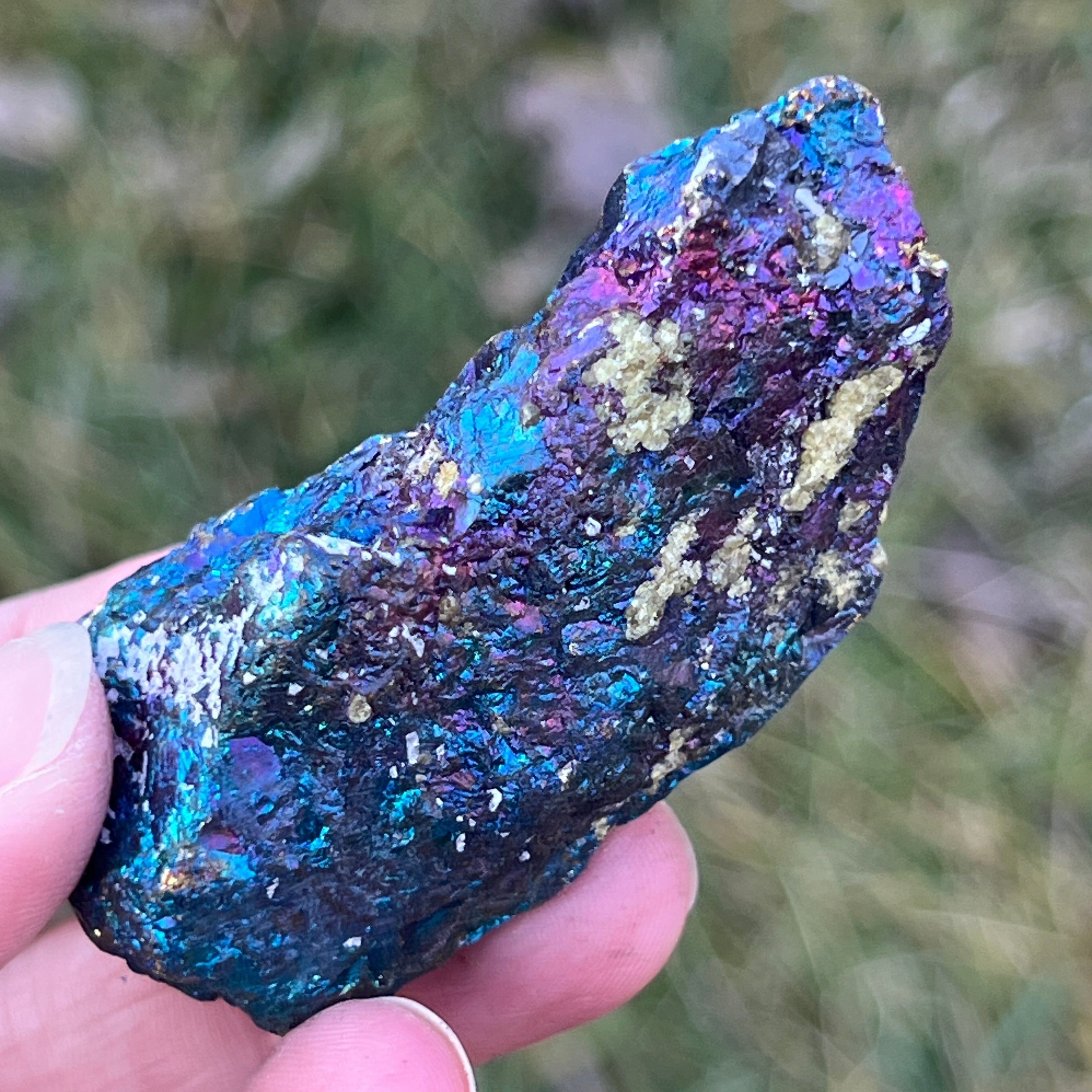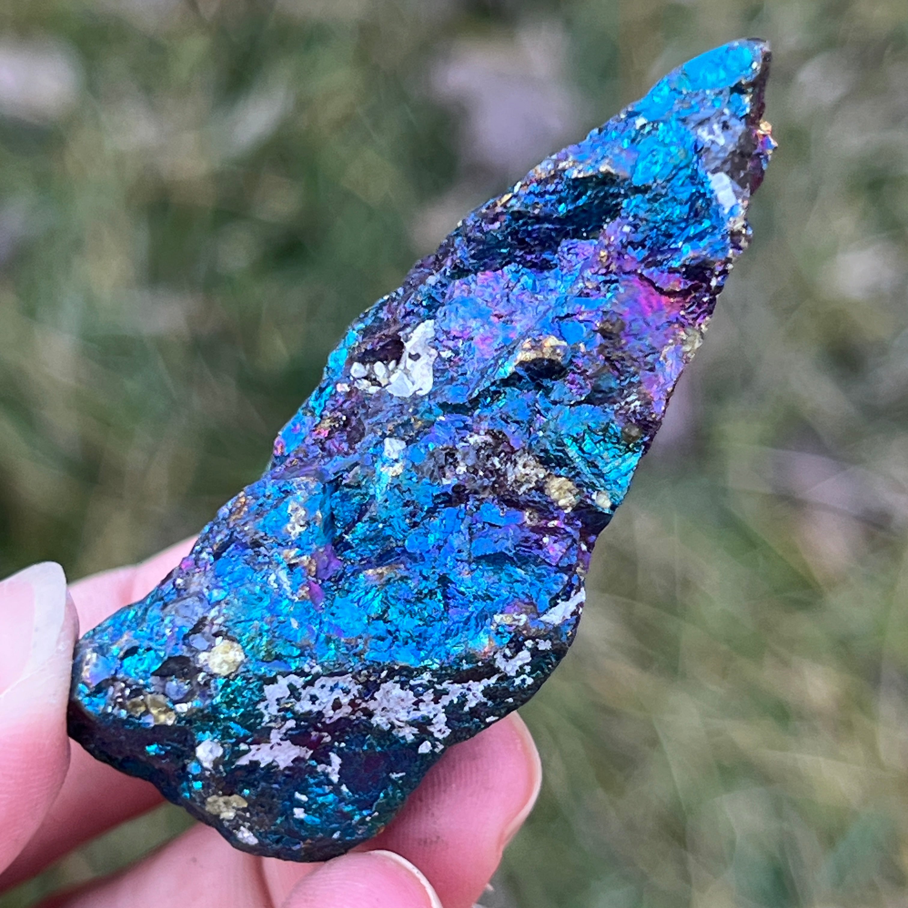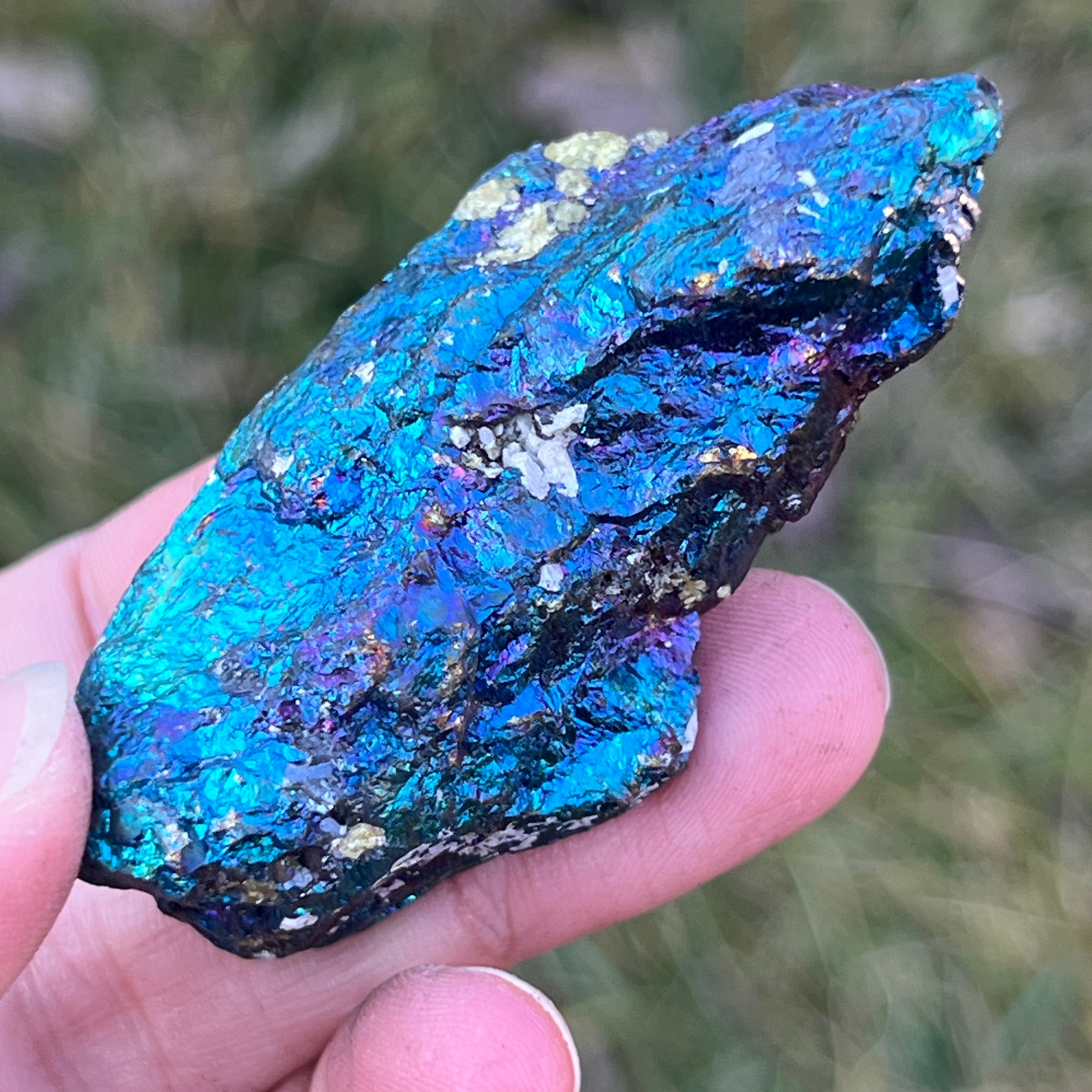 A kék chalkopirit, más néven irizáló chalkopirit,olyan chalkopirit típus, amely ragyogó kék, lila, zöld vagy más irizáló színárnyalatokat mutat. Ez az irizáció vékony oxidréteg következménye az ásvány felszínén, ami egy természetes folyamat, amikor a chalkopirit hosszabb ideig levegőnek és nedvességnek van kitéve.