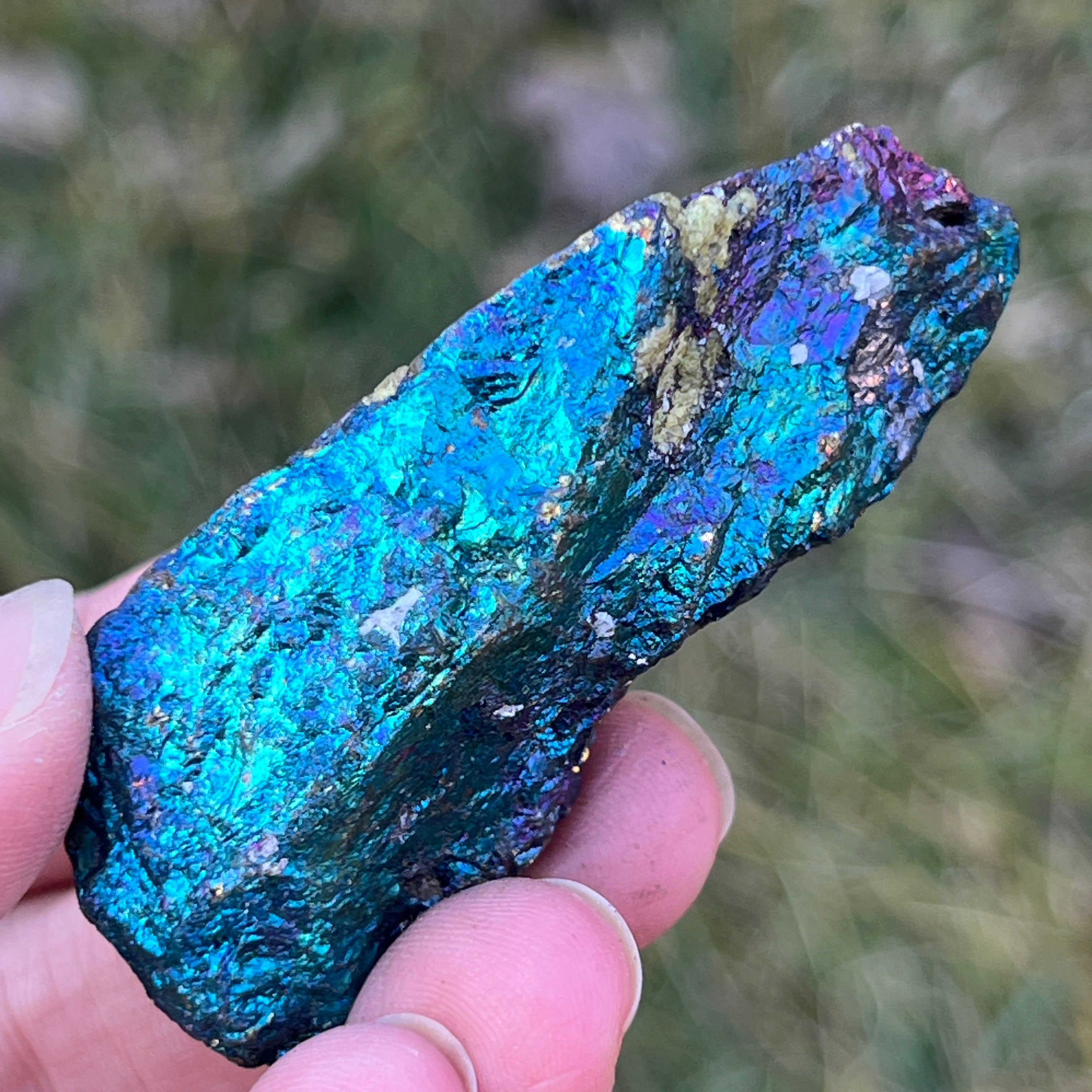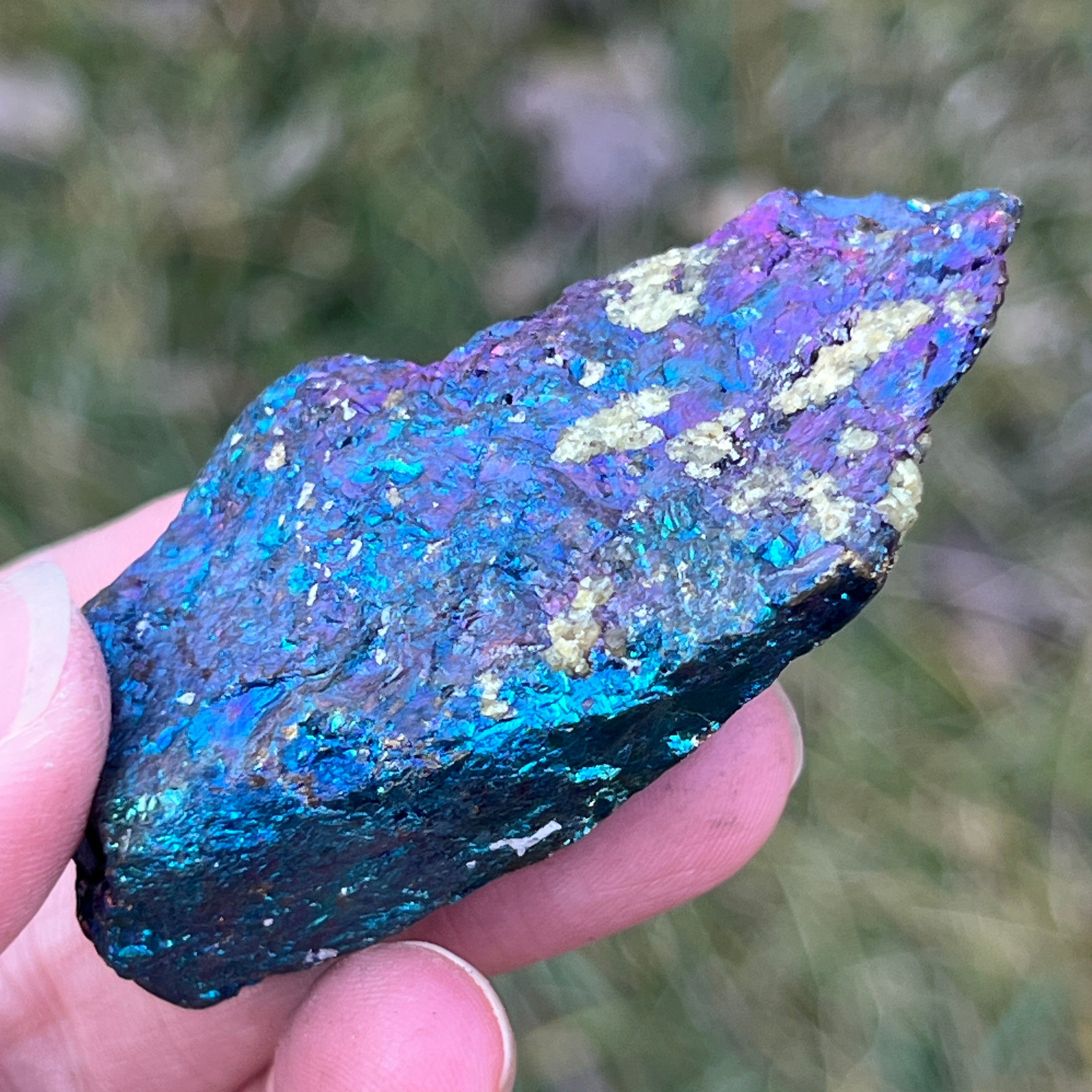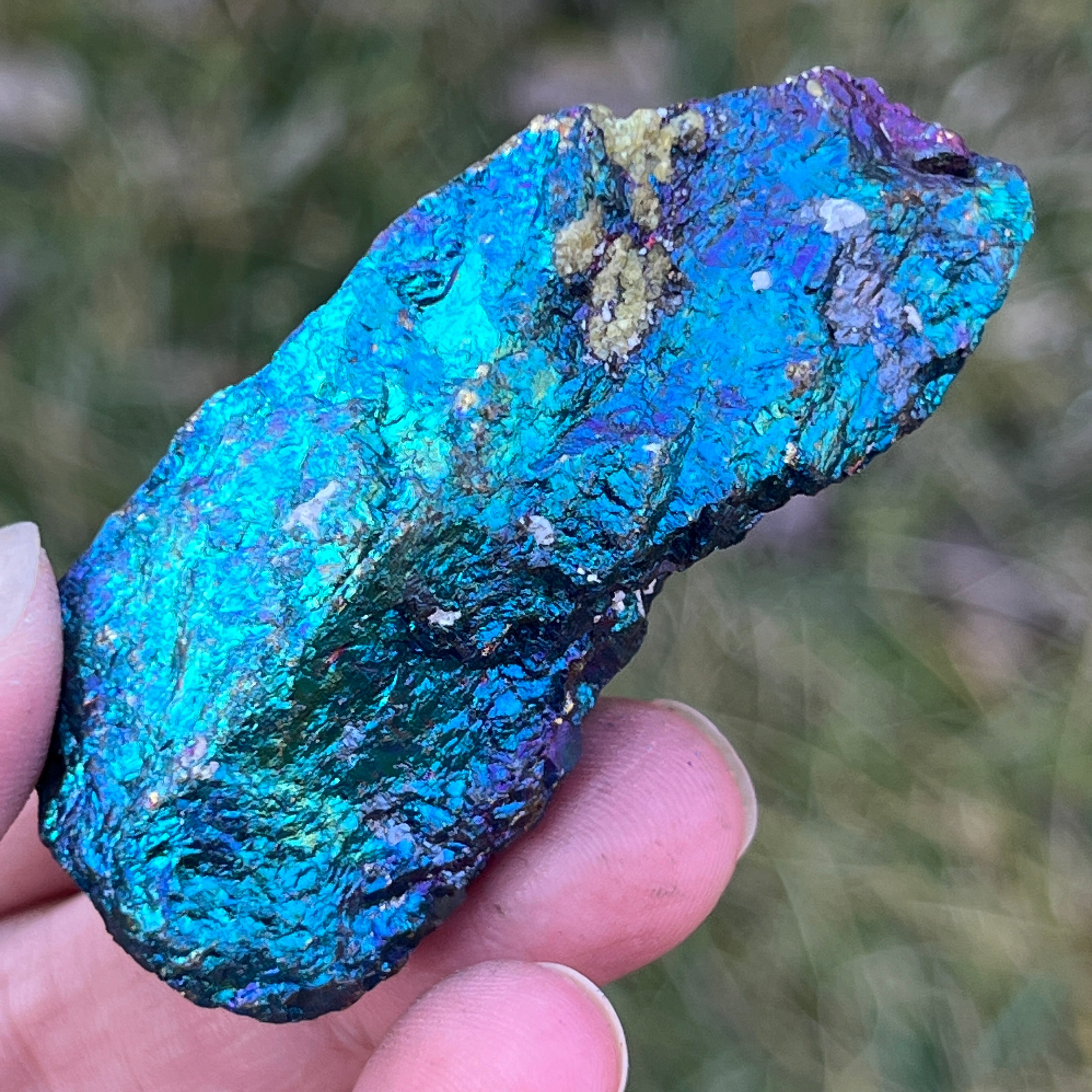 A kék chalkopirit, más néven irizáló chalkopirit,olyan chalkopirit típus, amely ragyogó kék, lila, zöld vagy más irizáló színárnyalatokat mutat. Ez az irizáció vékony oxidréteg következménye az ásvány felszínén, ami egy természetes folyamat, amikor a chalkopirit hosszabb ideig levegőnek és nedvességnek van kitéve.