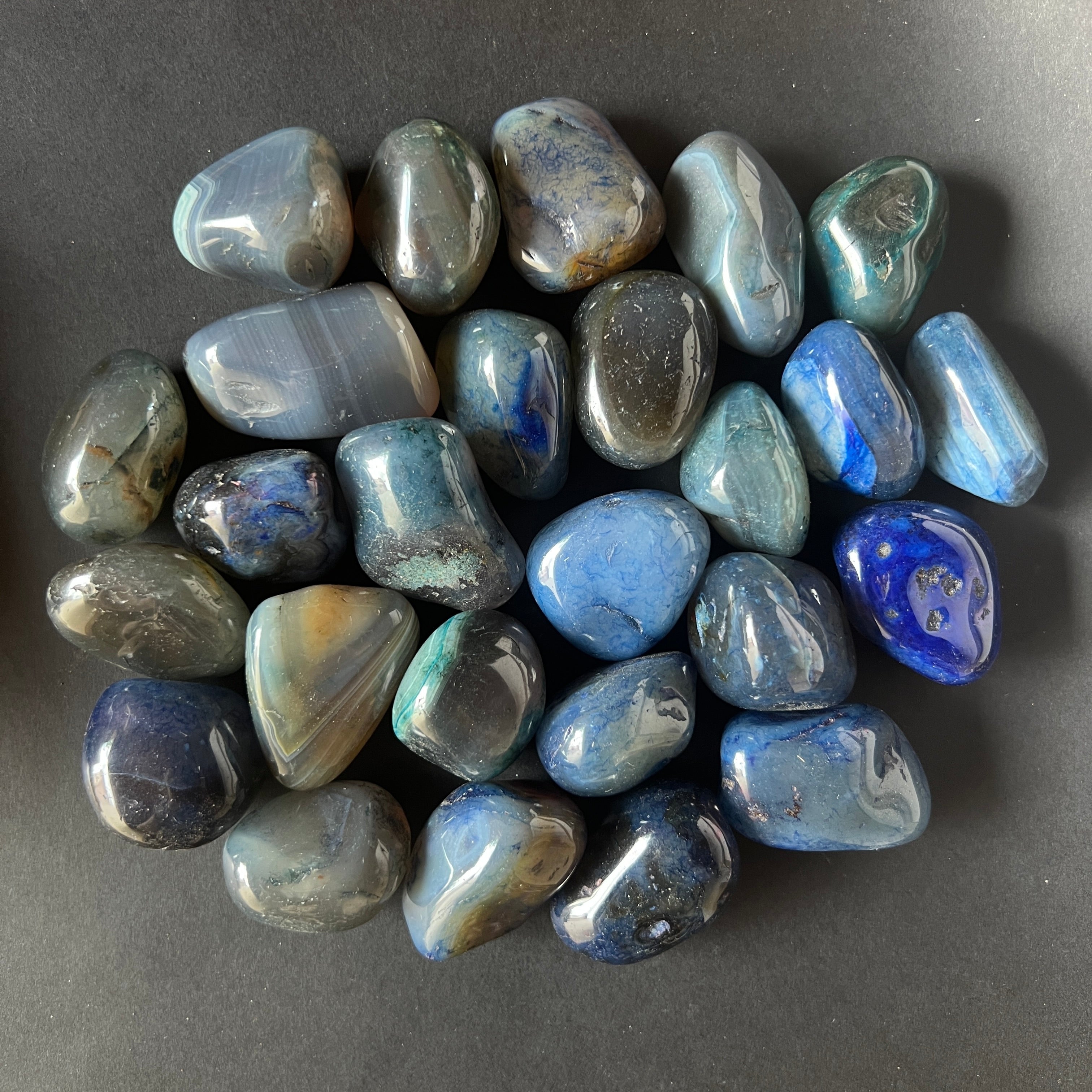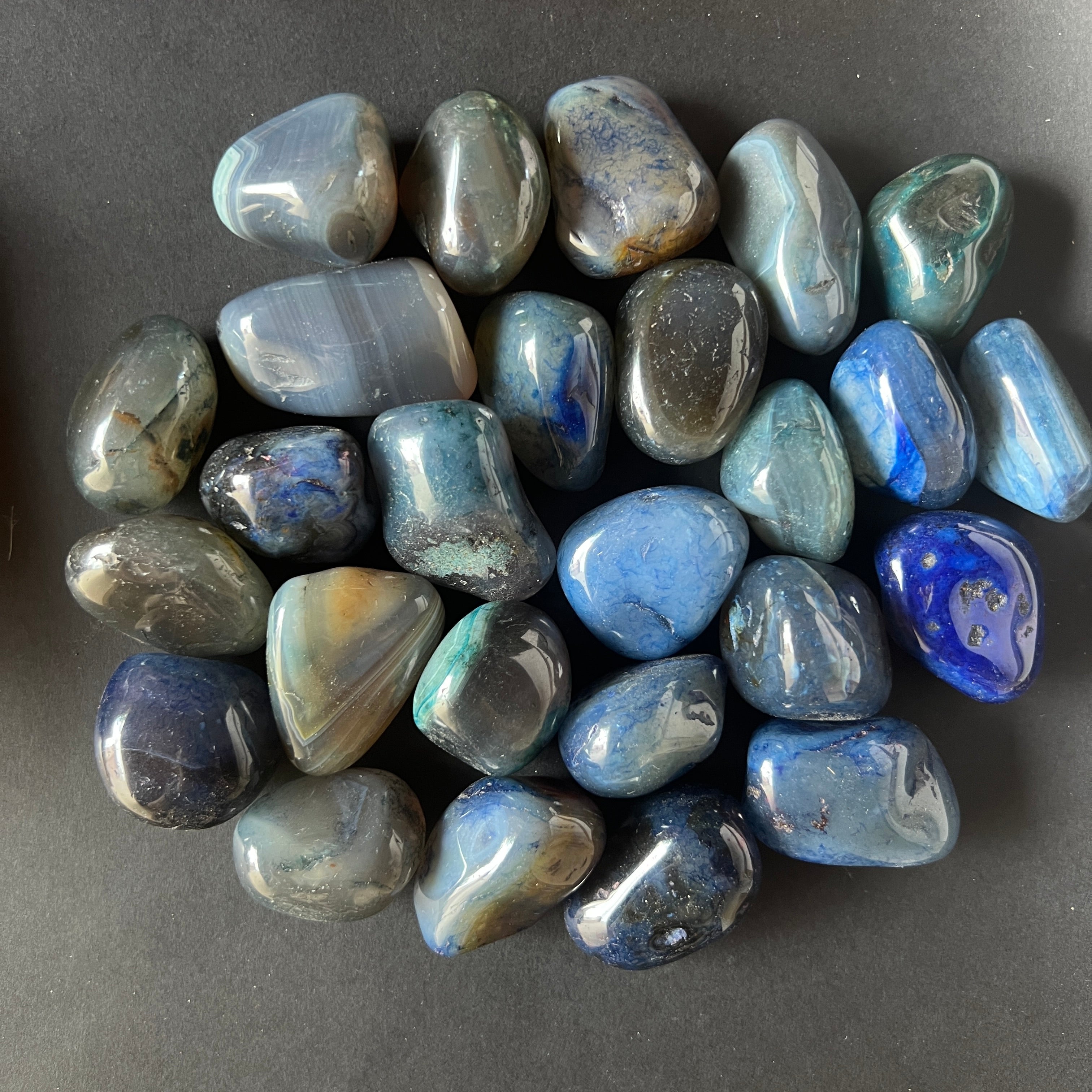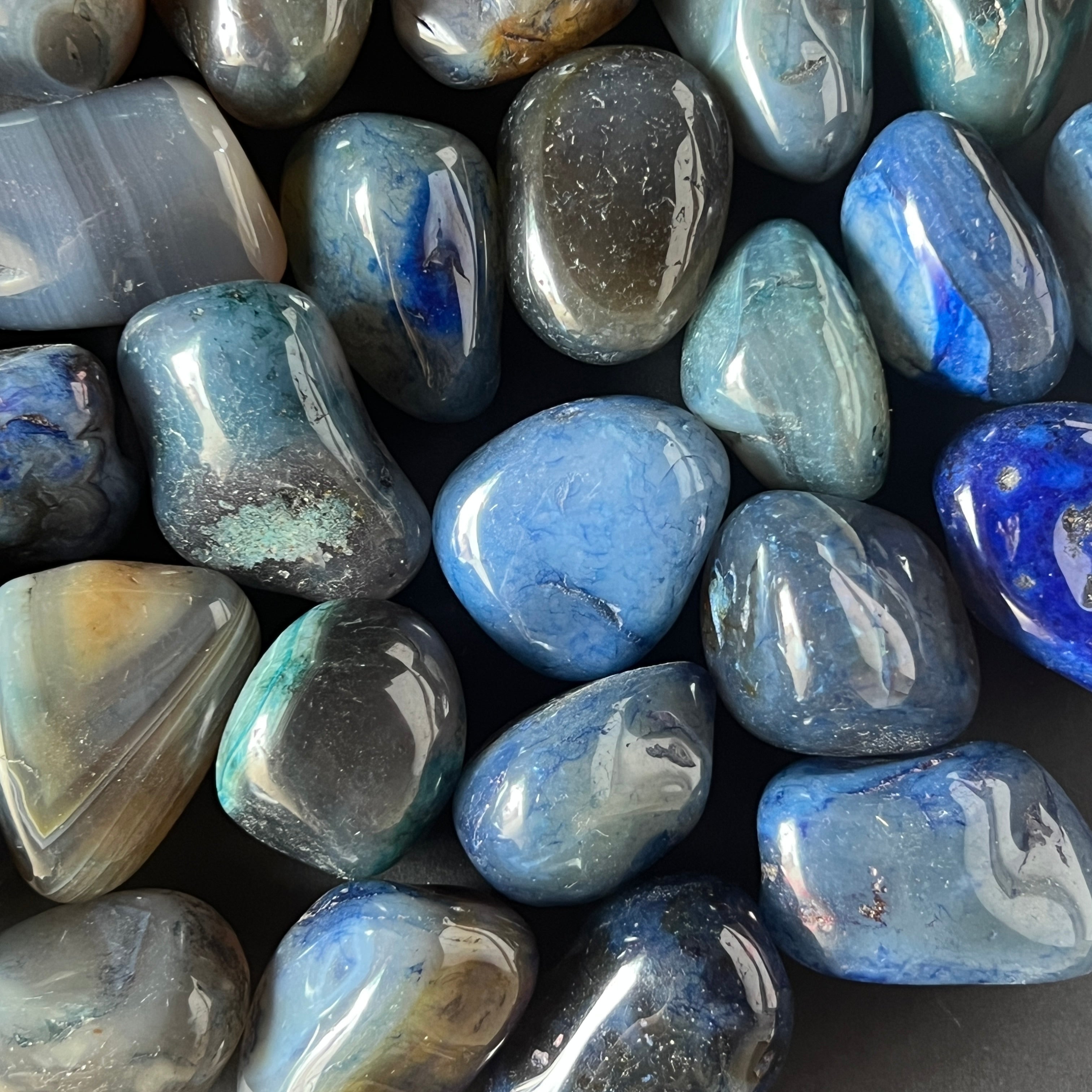 Mini kék achát görgetett kő, mérete 3 és 4 cm között. Az ár a kő méretétől függ, kérjük, válassza ki a kívánt méretet.
