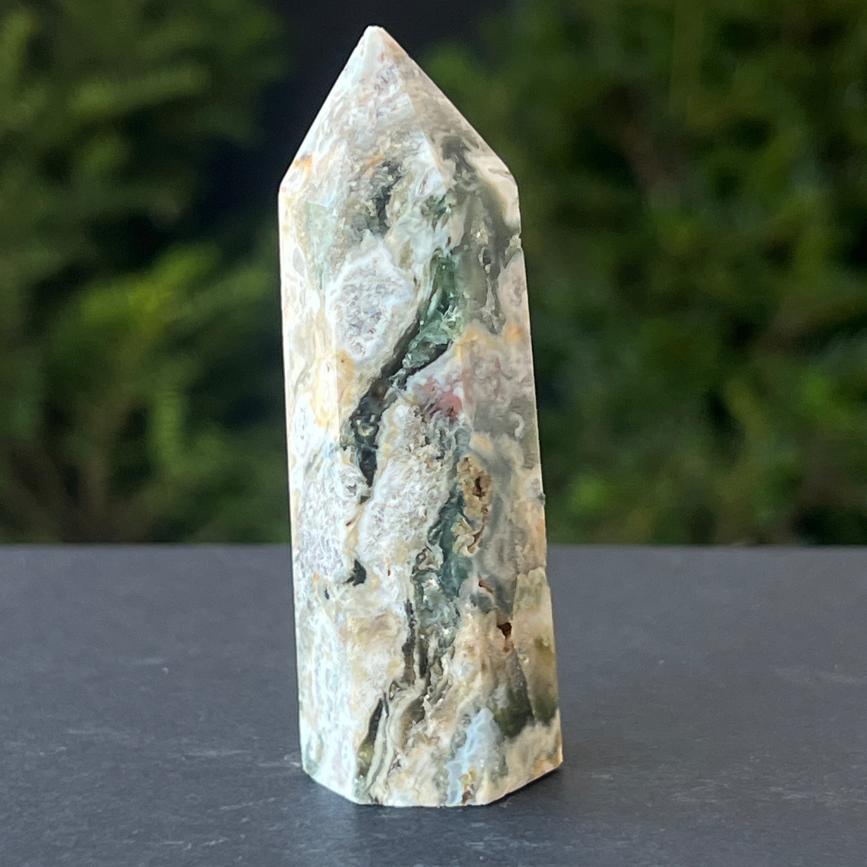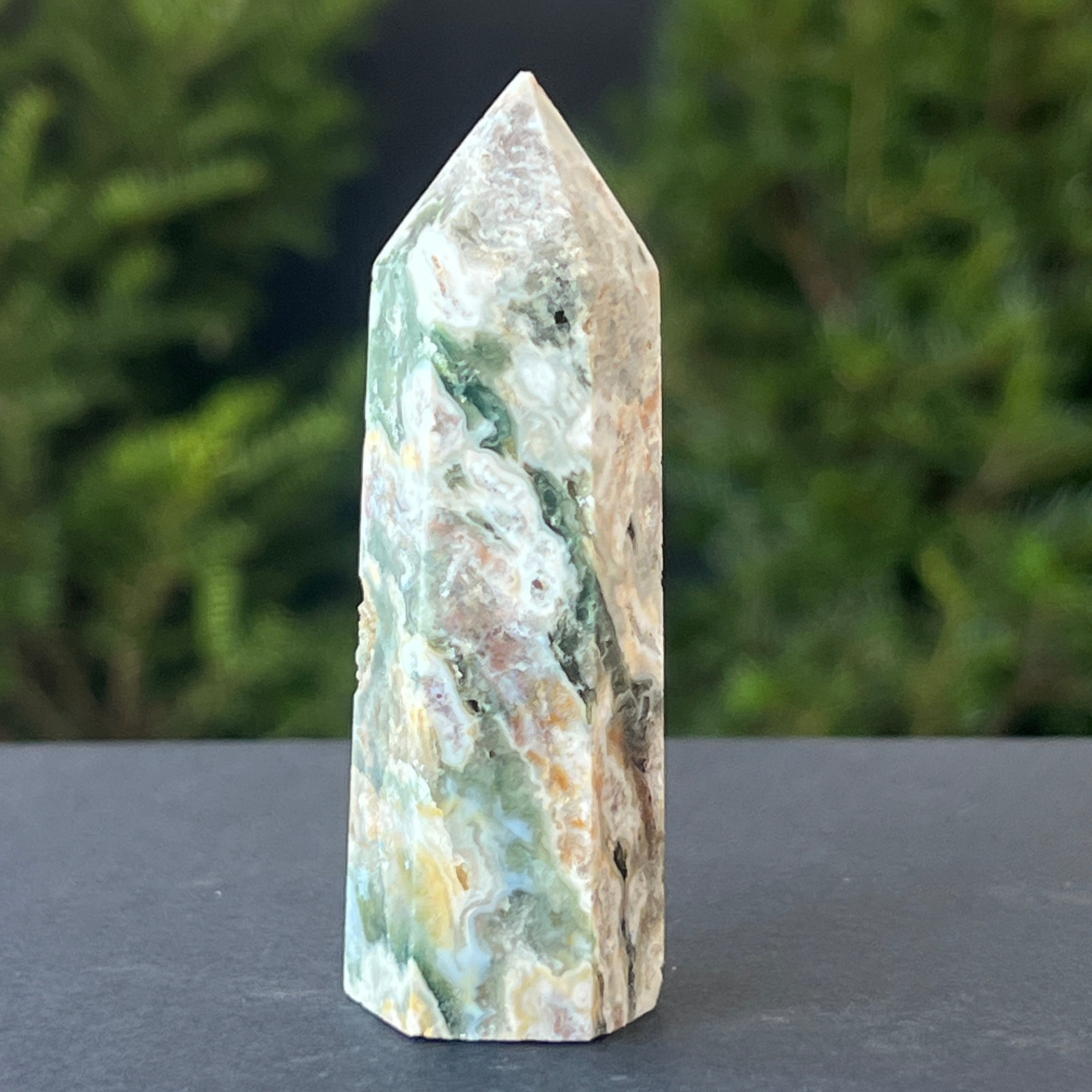 A moha/fa achát sikeresen beilleszthető a ház dekorációjába, a kisugárzó energia a stabilitásé.
