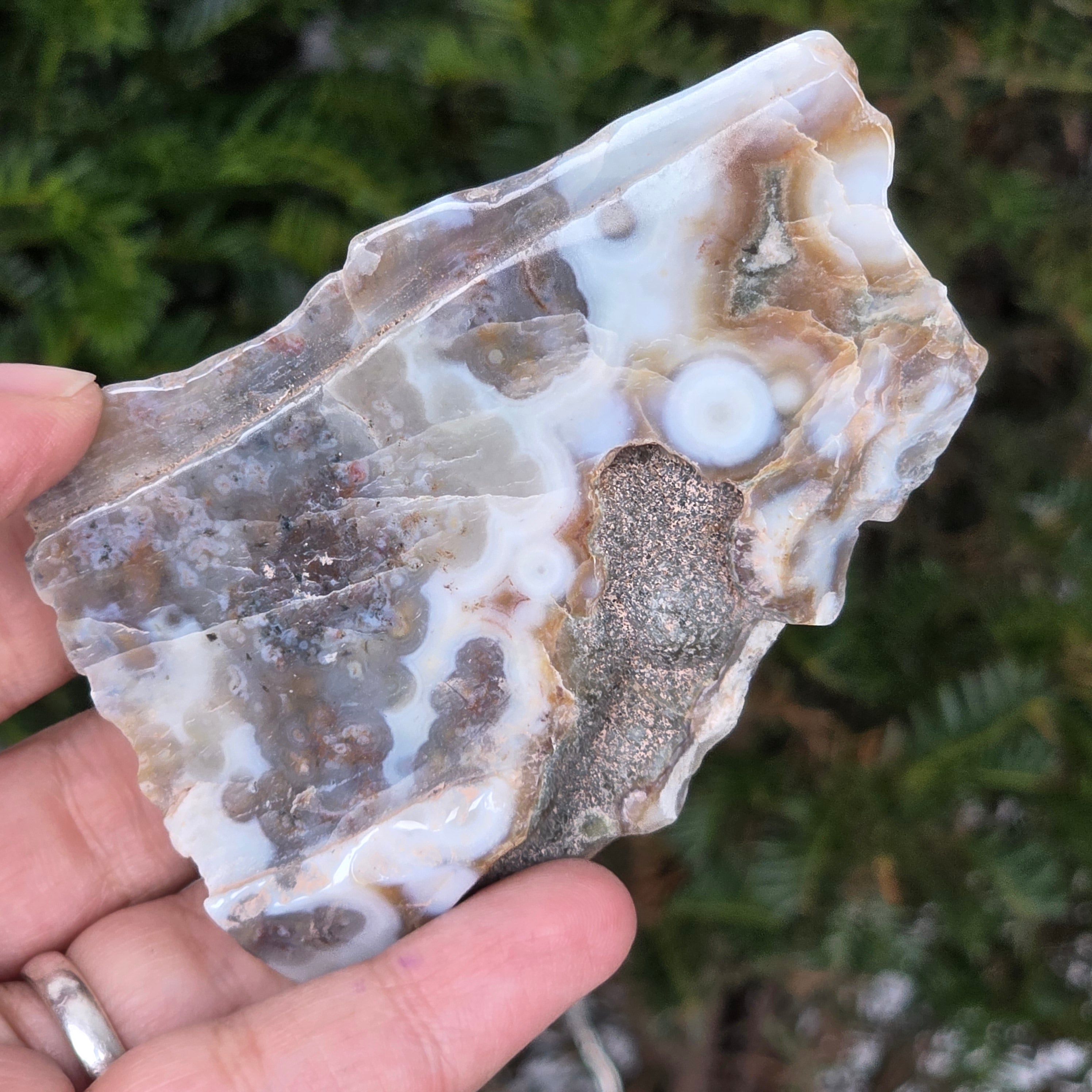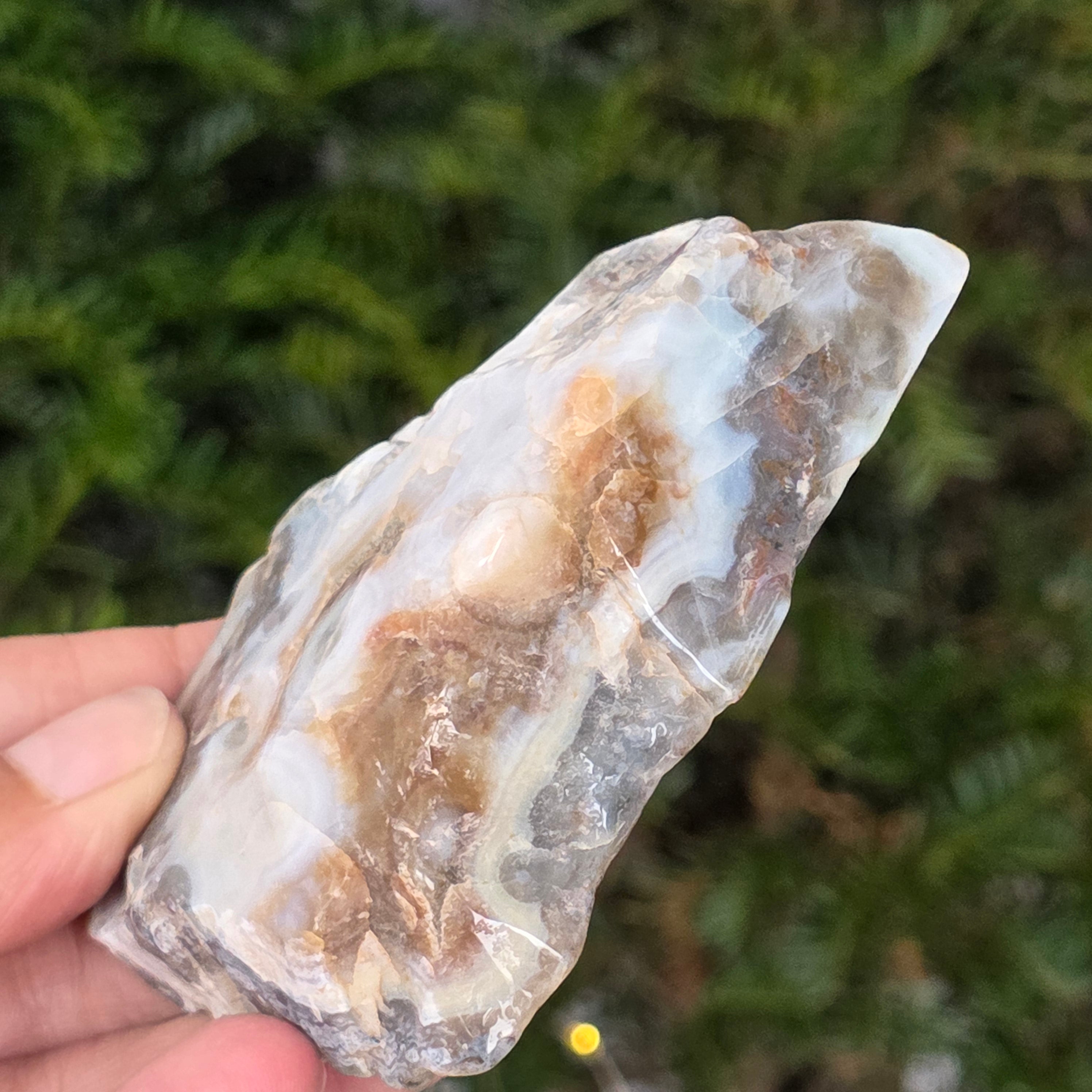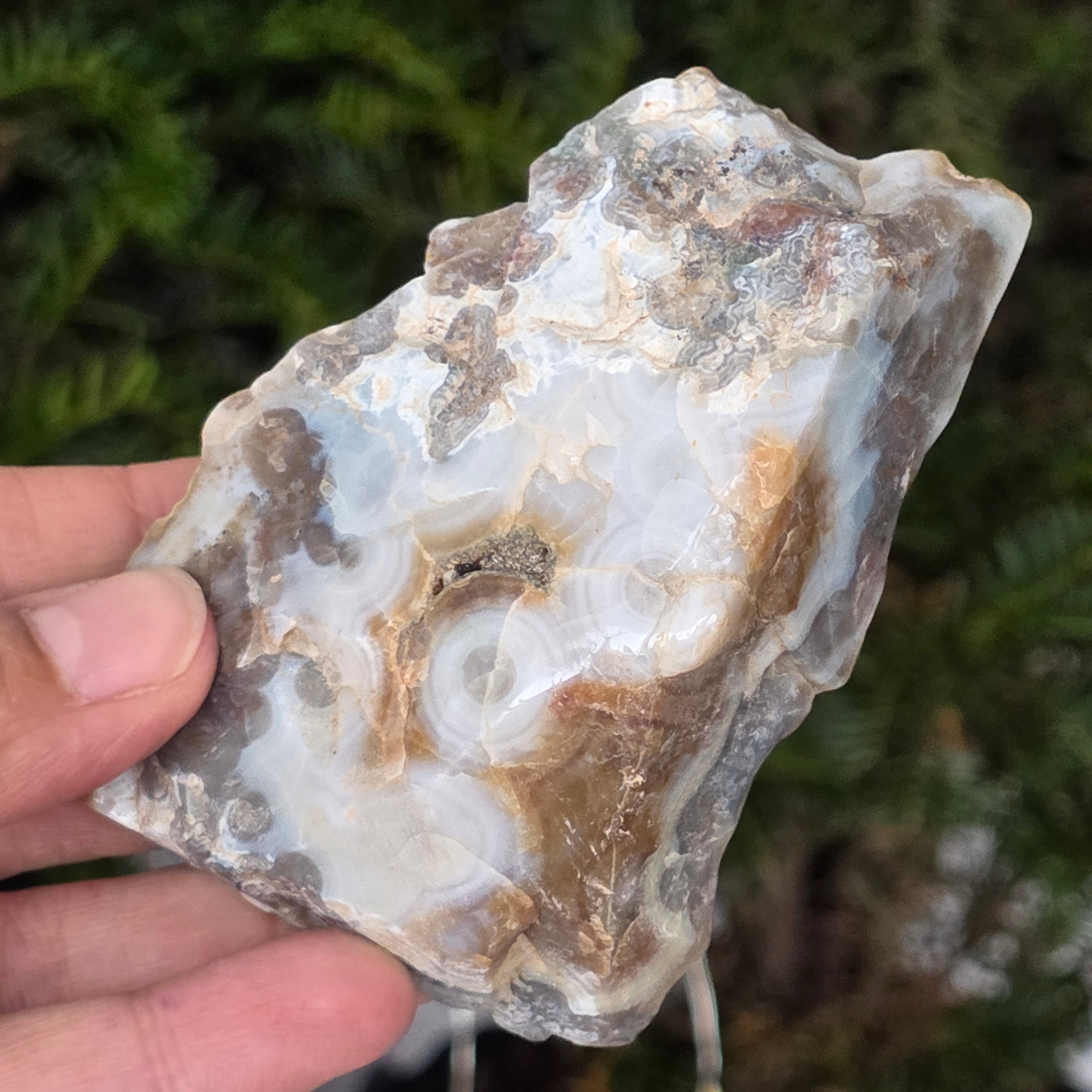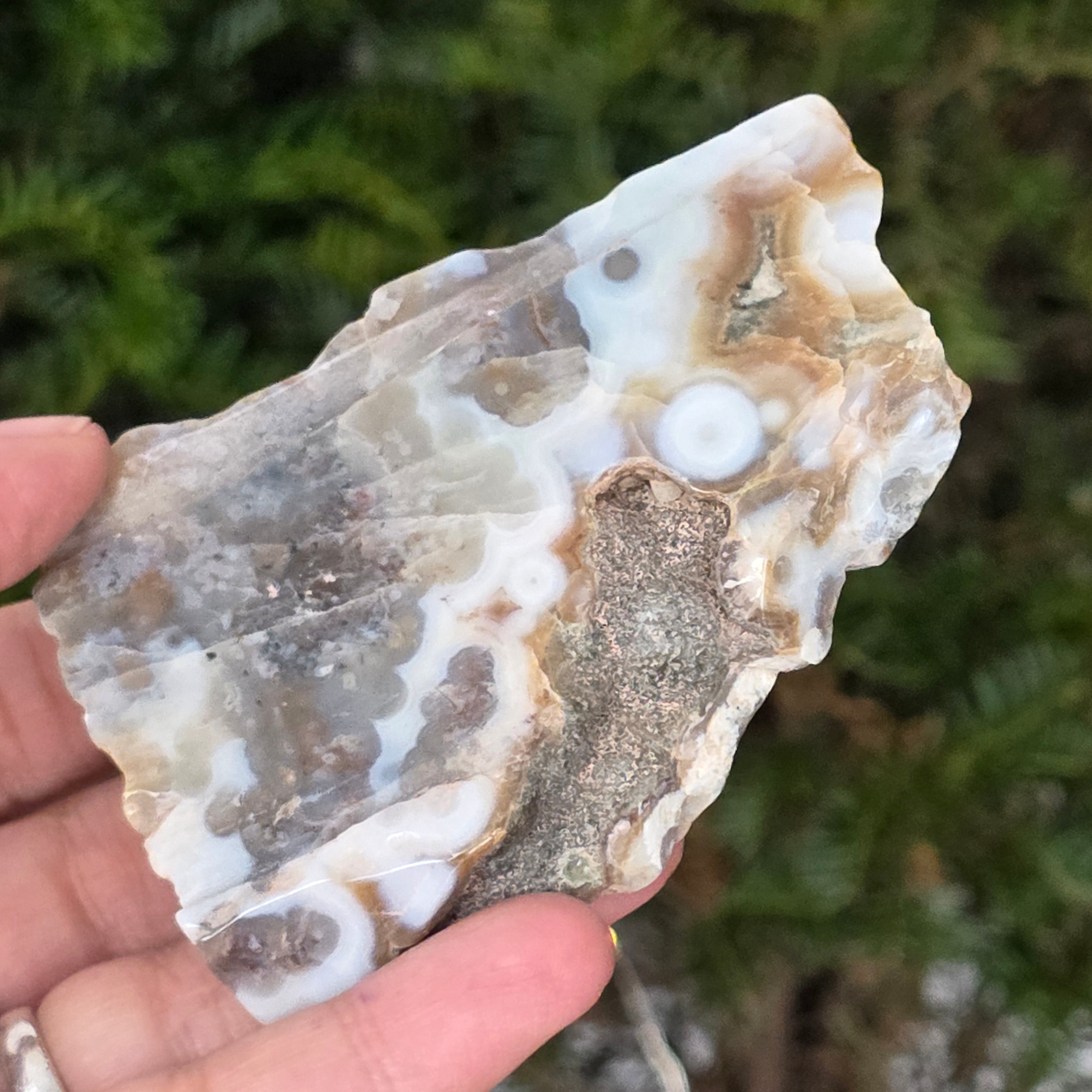 A mexikói Crazy Agát az egyik legélénkebb és leglátványosabb ásványfajta, híres hullámos vonalairól és az őrült színjátékáról, melyeket úgy tűnik, szabad kézzel, szabályok nélkül rajzoltak. Ebben a kicsi, de rendkívül kifejező természetes szeletben az ásvány teljes története feltárul: földes rétegek, karamell meleg árnyalatai, élénk vörös, narancs, szürke és krém keveredik spirálmintákban, amelyek úgy tűnik, életre kelnek.
