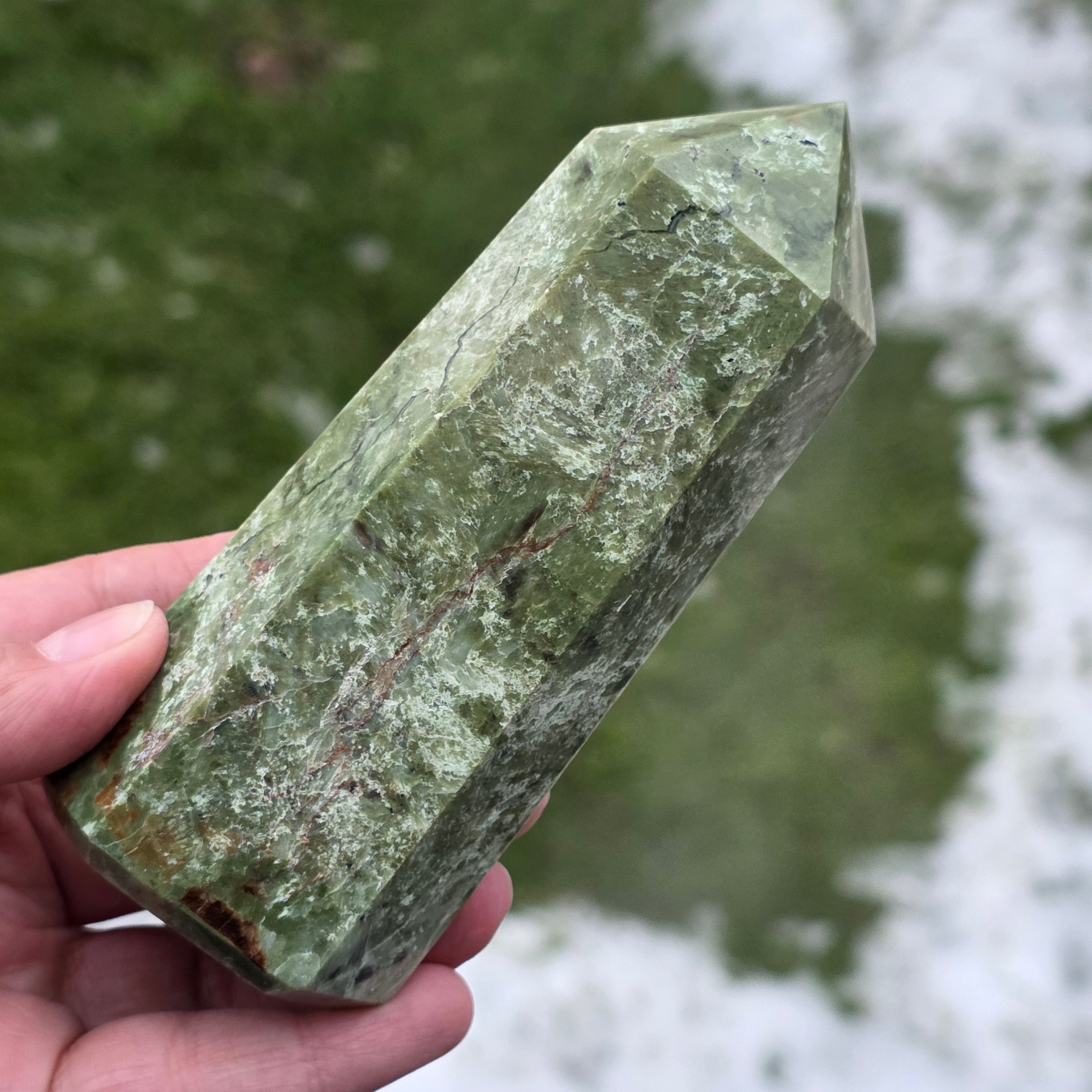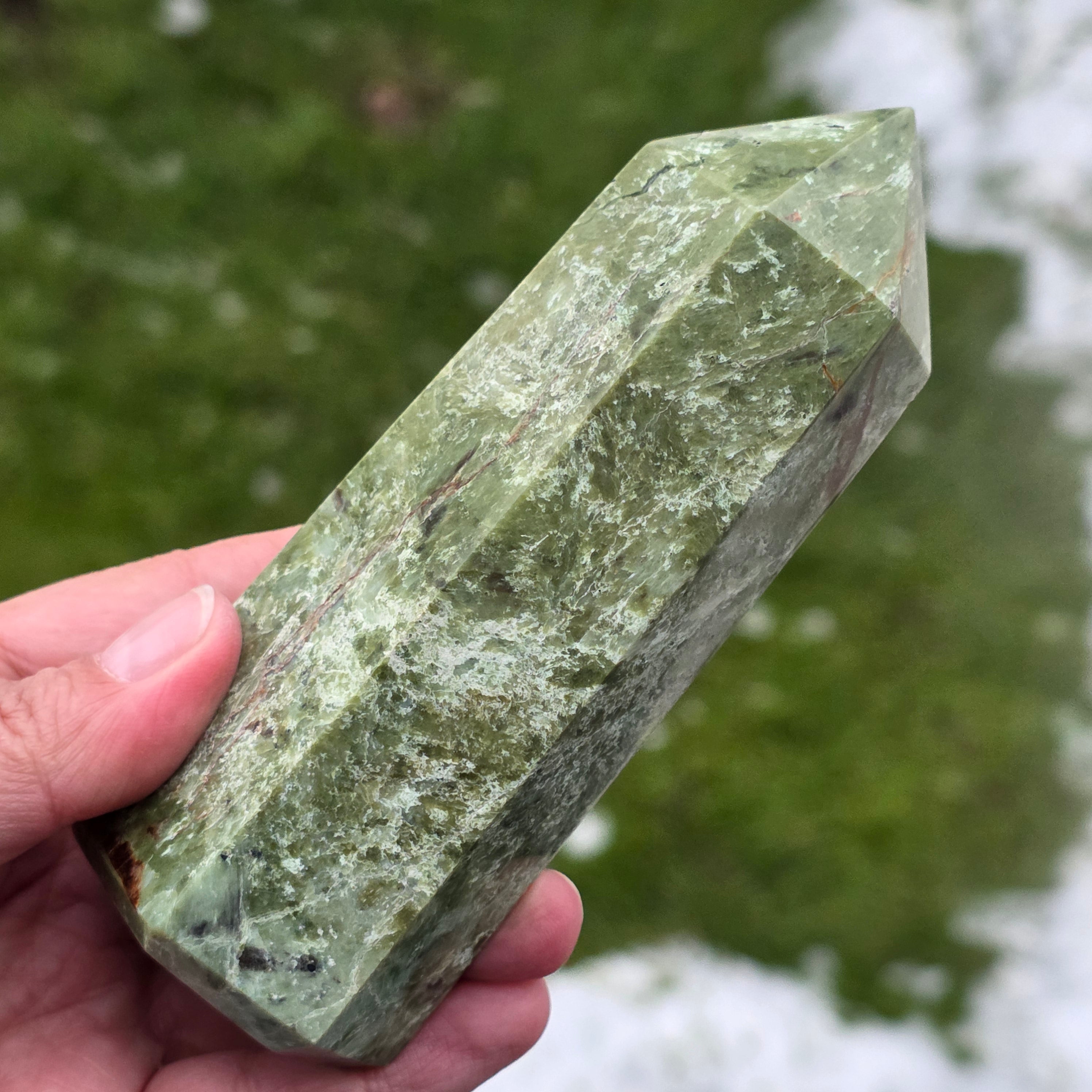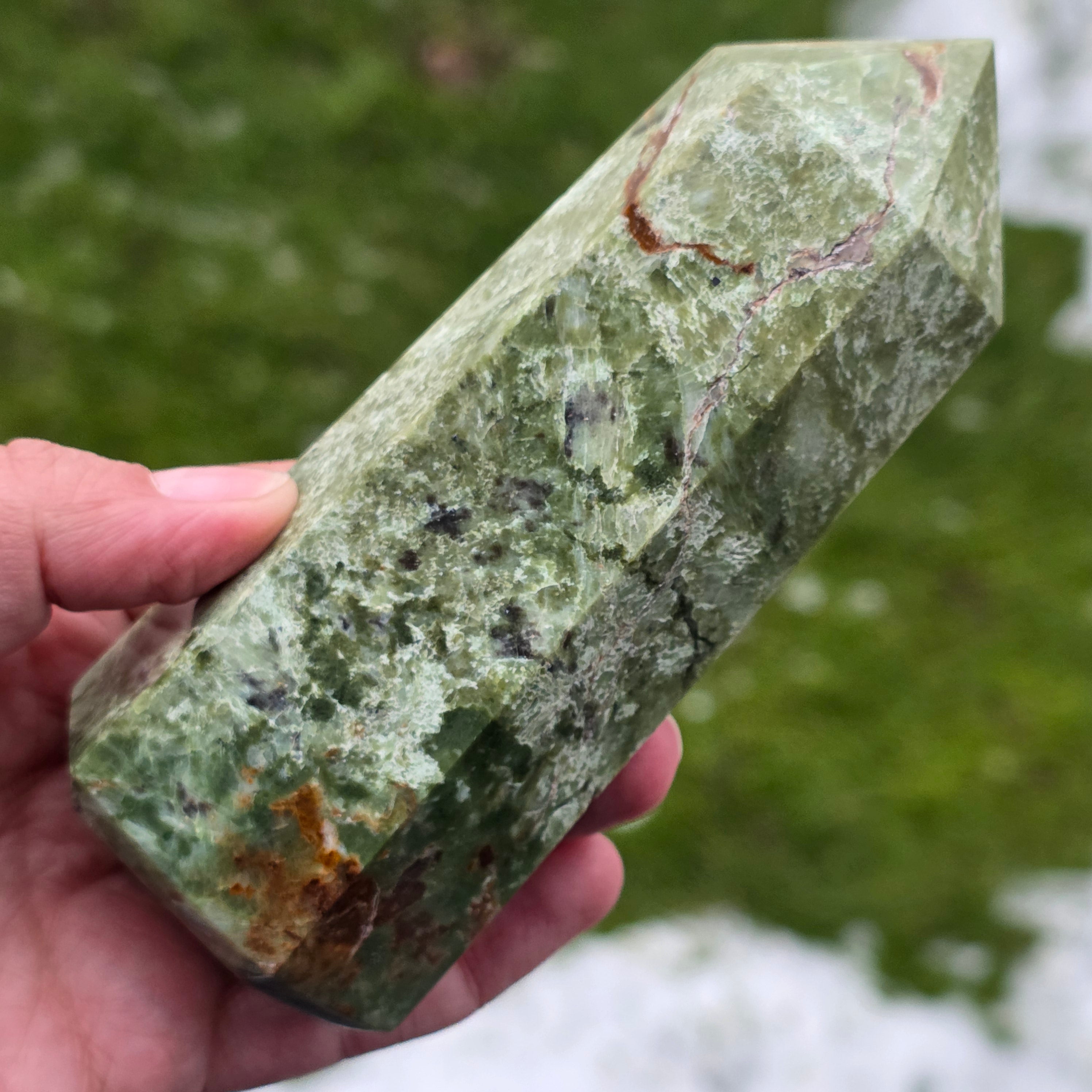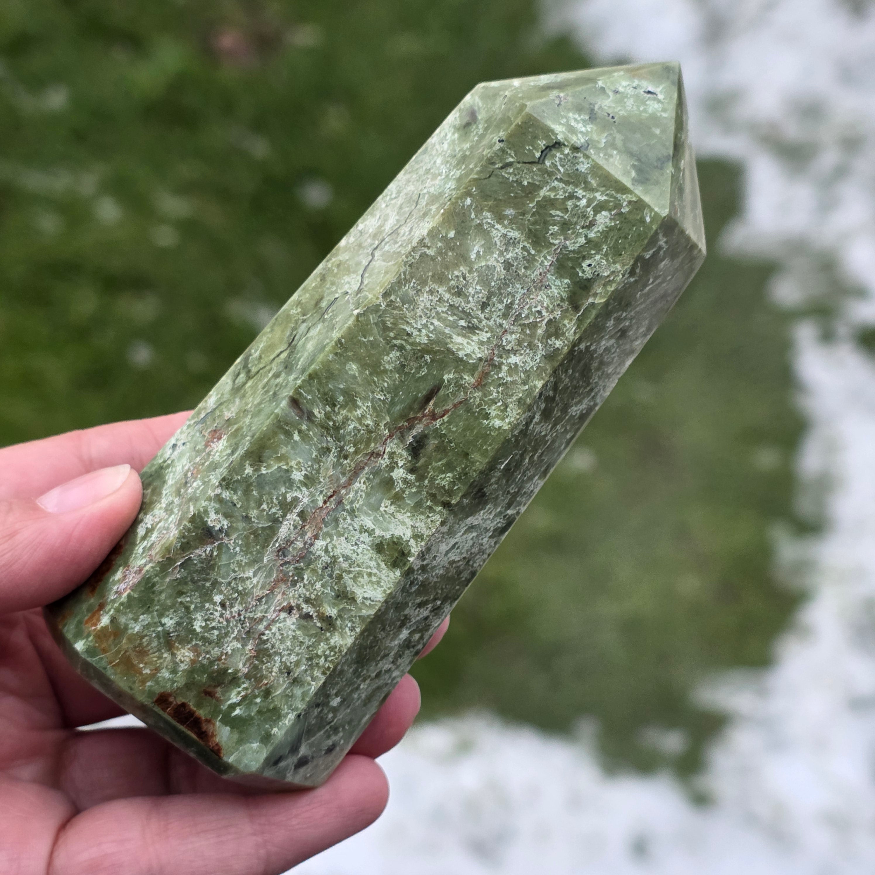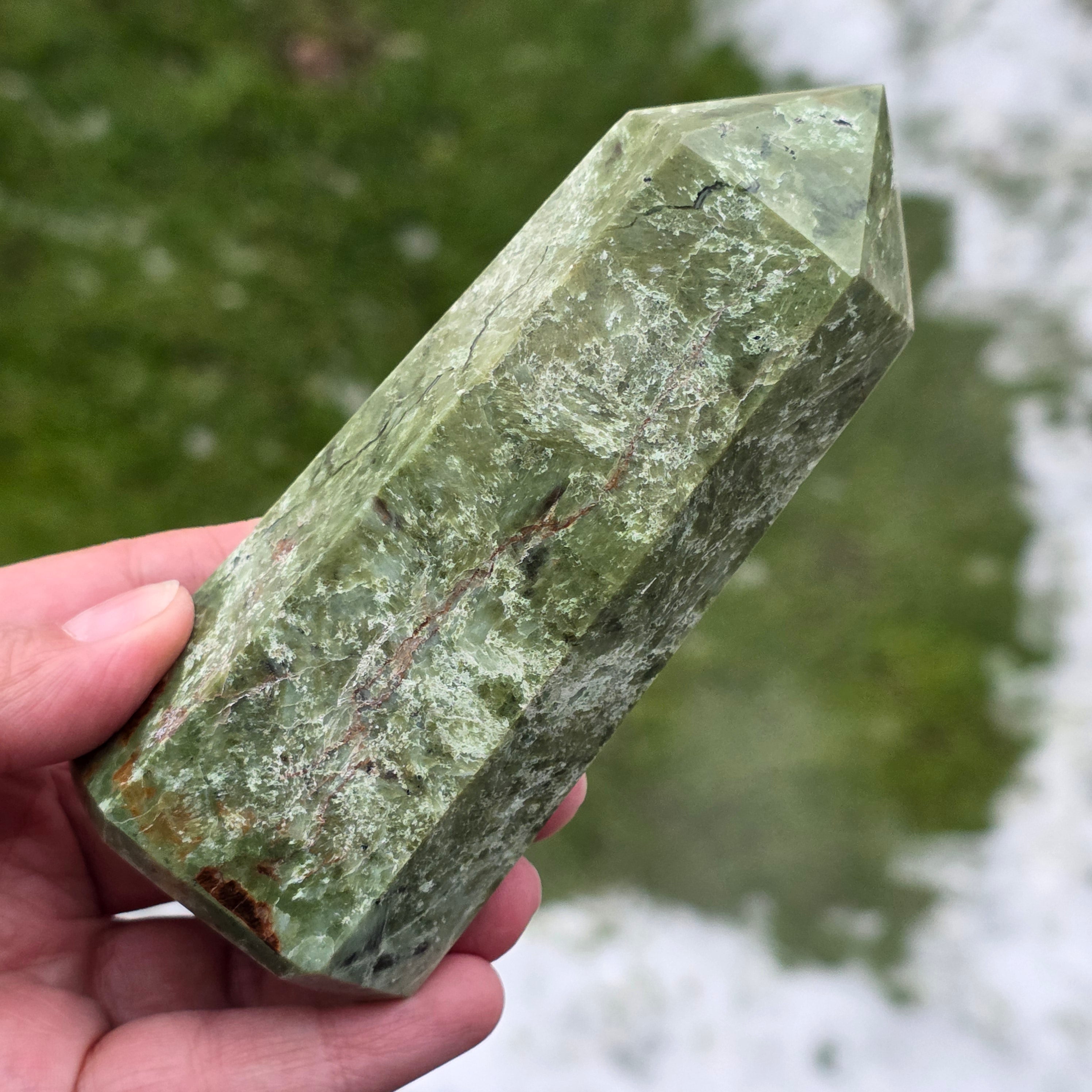Ez a természetes krizopráz obeliszk, A minőség, friss zöld árnyalataival és enyhe, élénkítő energiájával lenyűgöz. Olyan tereket tesz ideálissá, mint a meditációs helyek, irodák vagy a belső egyensúlyra szánt sarkok. A krizoprázt a szív megnyílásához, az érzelmi regenerációhoz és a változások idején nyújtott támogatáshoz társítják, a megújulás és a nyugodt optimizmus kristályának tekintik. Az obeliszk forma segít az energia koherens irányításában, tisztaságot és finom támogatást nyújtva az önvizsgálat és a harmonizálás folyamatában.