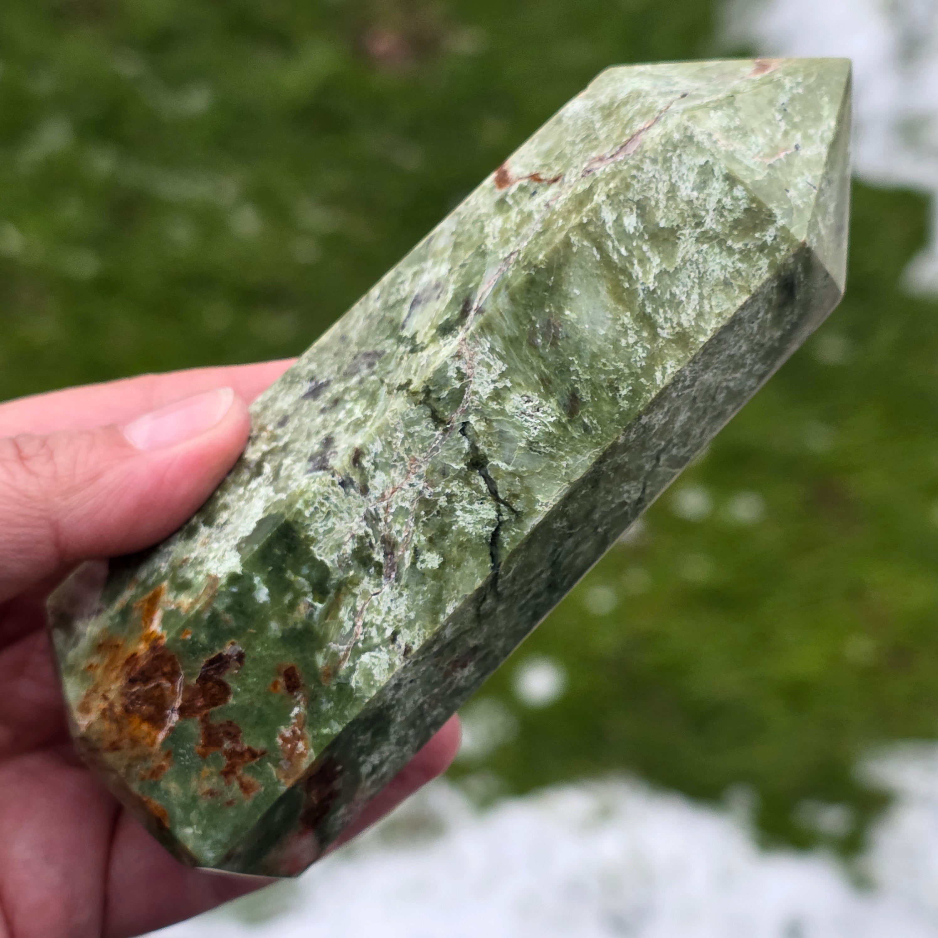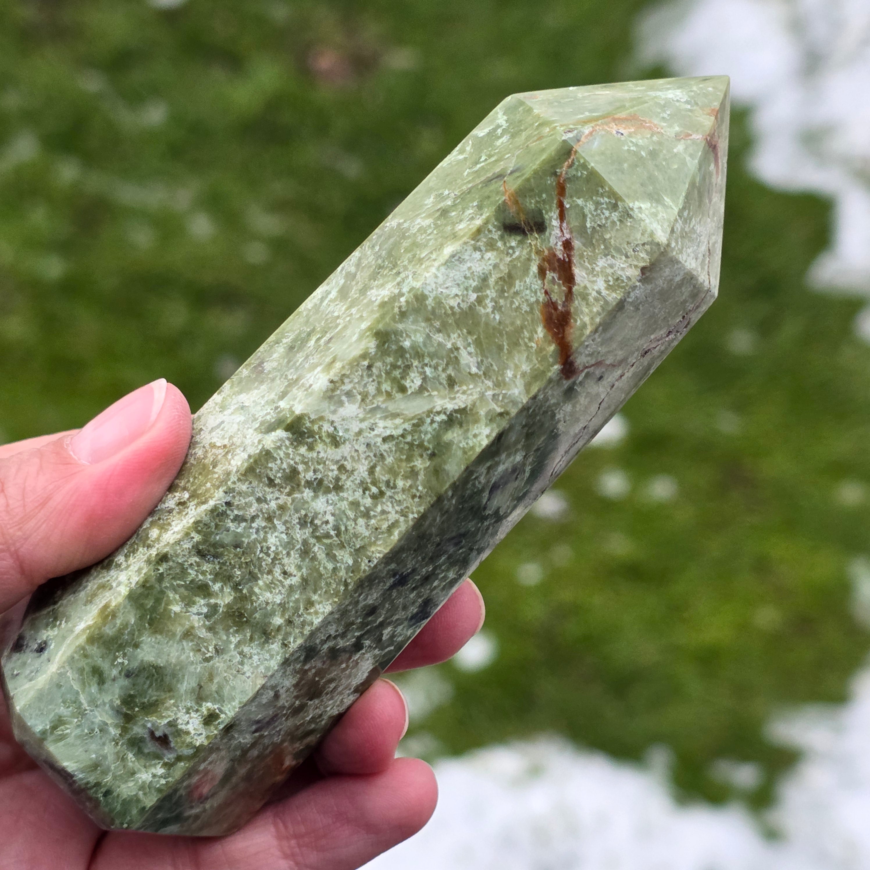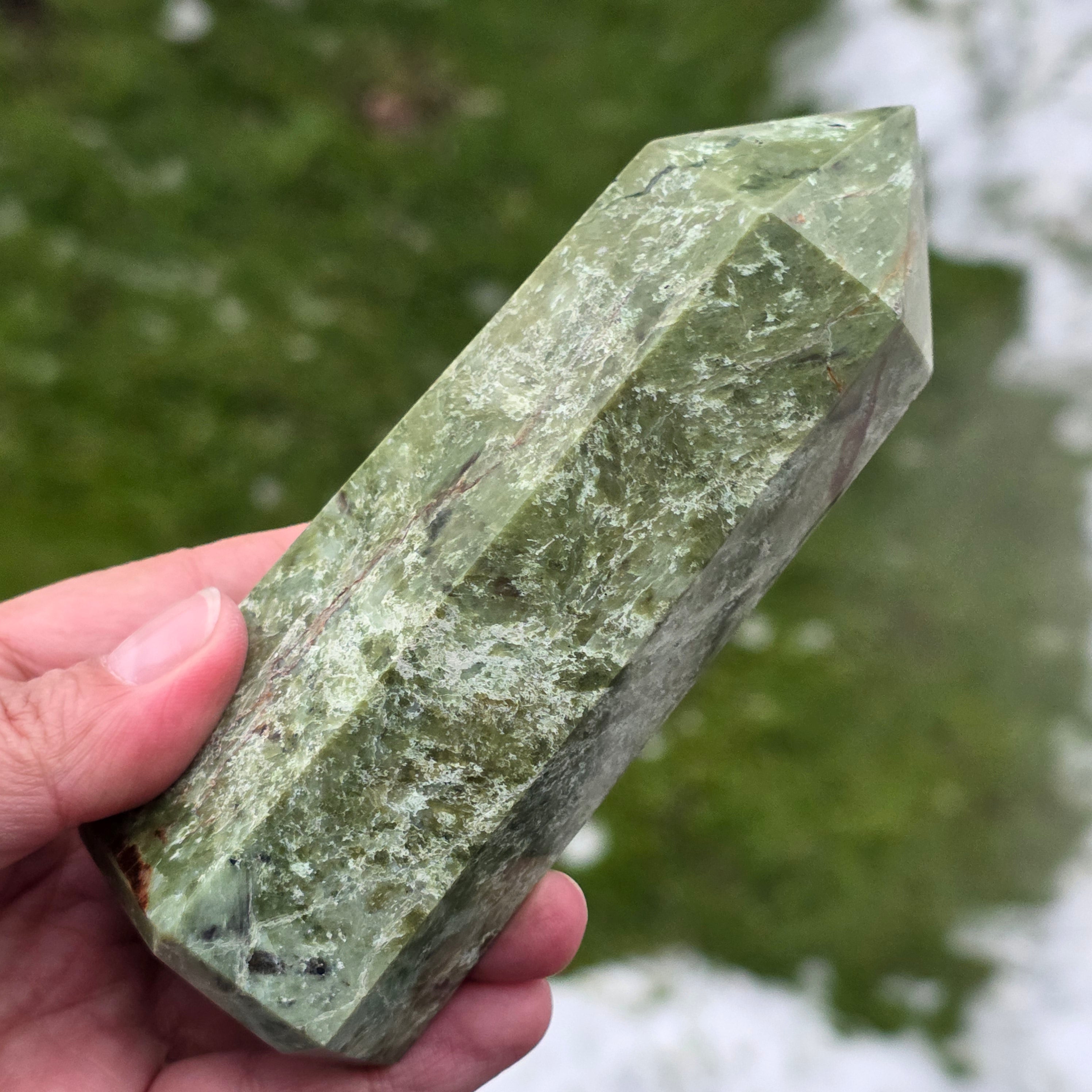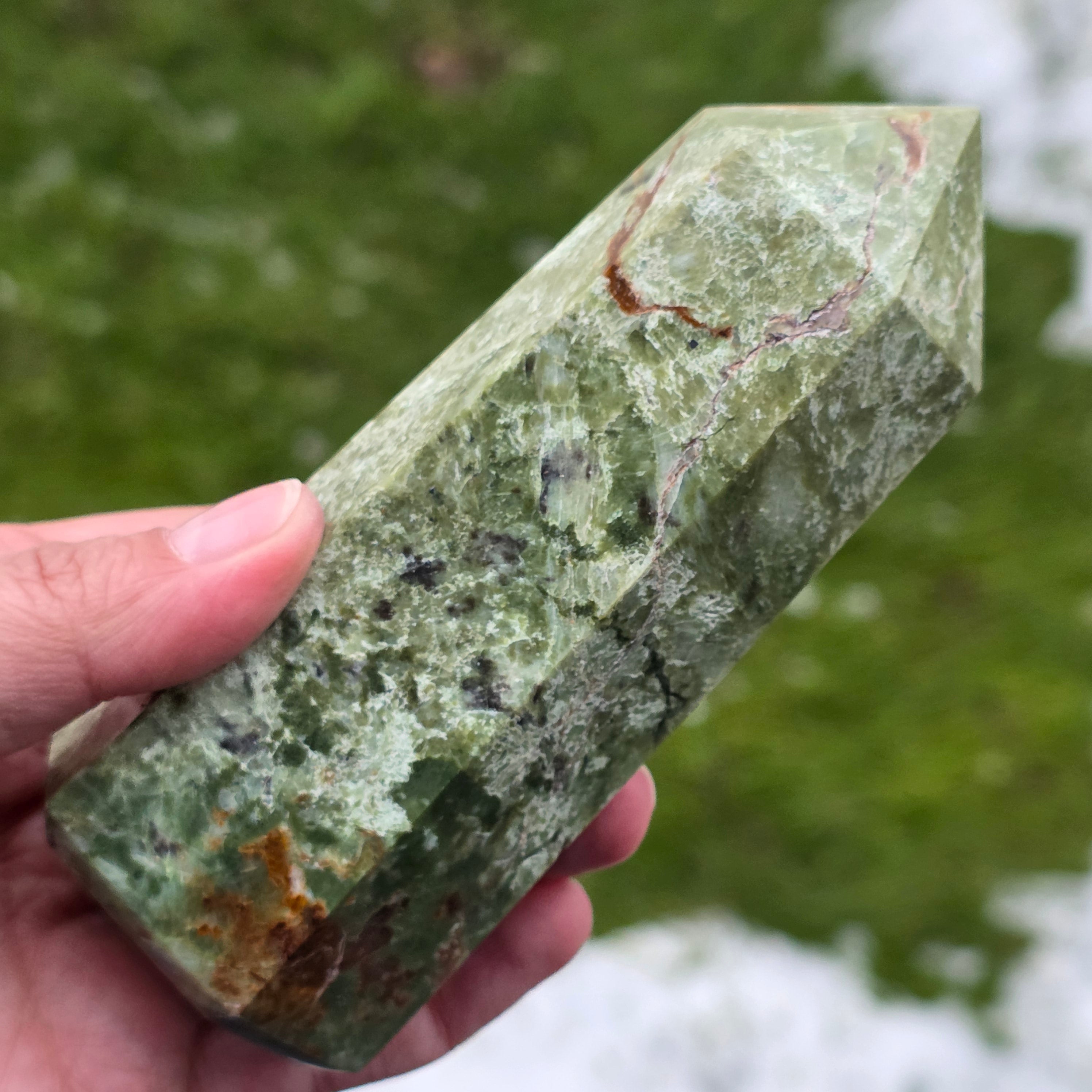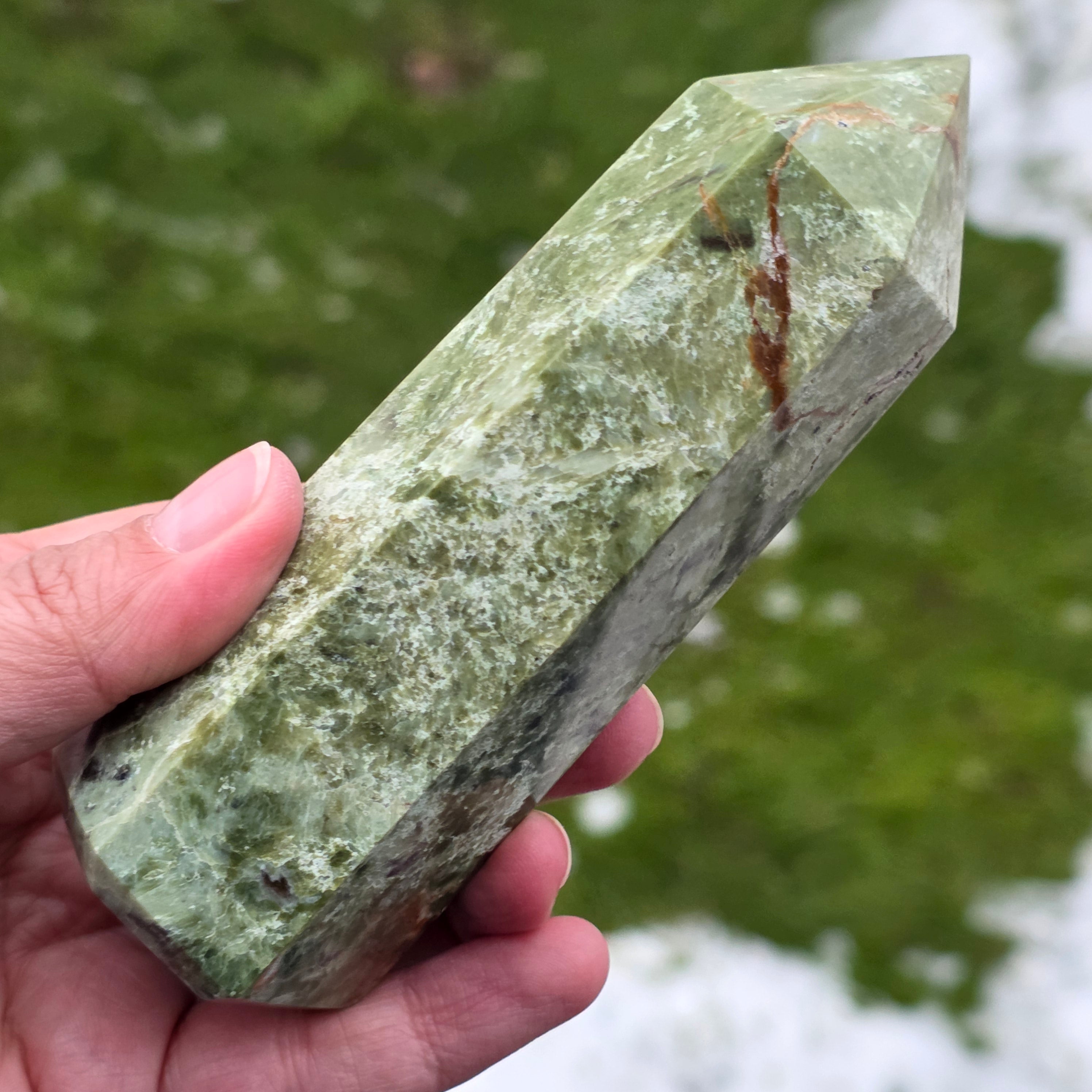Ez a természetes krizopráz obeliszk, A minőség, friss zöld árnyalataival és enyhe, élénkítő energiájával lenyűgöz. Olyan tereket tesz ideálissá, mint a meditációs helyek, irodák vagy a belső egyensúlyra szánt sarkok. A krizoprázt a szív megnyílásához, az érzelmi regenerációhoz és a változások idején nyújtott támogatáshoz társítják, a megújulás és a nyugodt optimizmus kristályának tekintik. Az obeliszk forma segít az energia koherens irányításában, tisztaságot és finom támogatást nyújtva az önvizsgálat és a harmonizálás folyamatában.