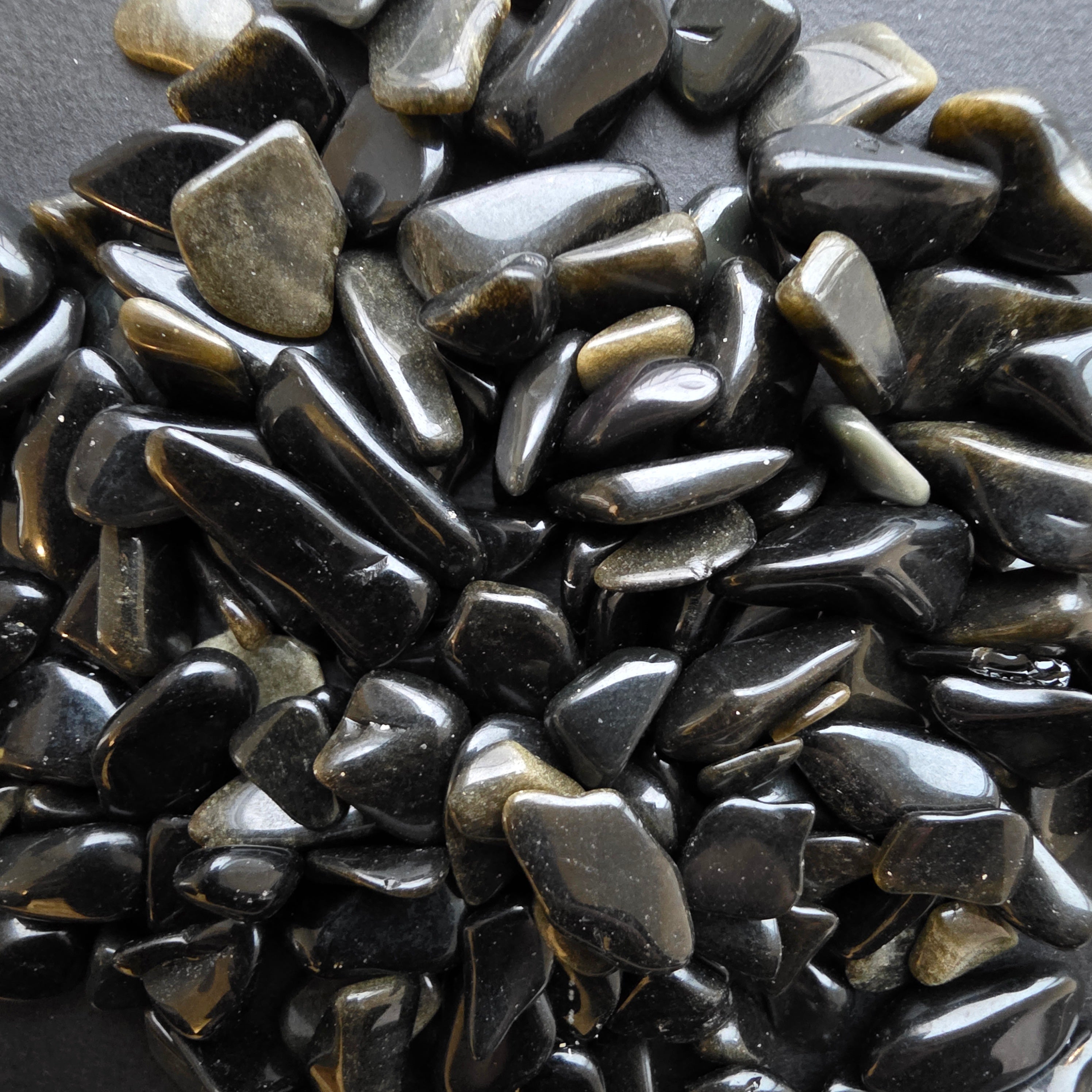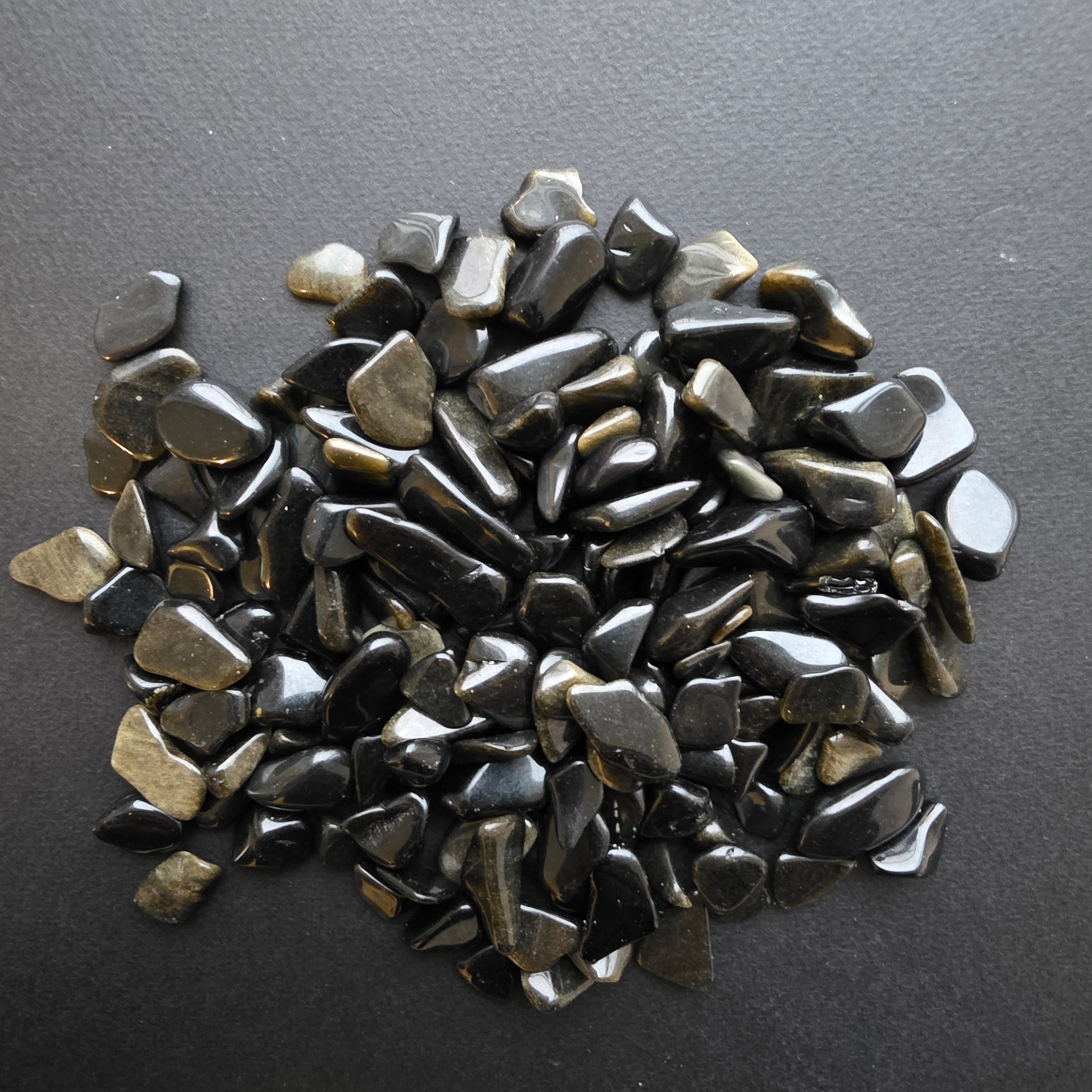 Chips 8–12 mm Szabálytalanok, éppen annyira políroztak, hogy sima textúrát kapjanak, anélkül, hogy elveszítenék természetes karakterüket. Néhány darab teljesen átlátszatlan és fekete, mások diszkrét áttetszéssel rendelkeznek a szélek felé, és néhányan intenzív fényükkel lepnek meg, mint egy megszilárdult éjszaka töredéke.