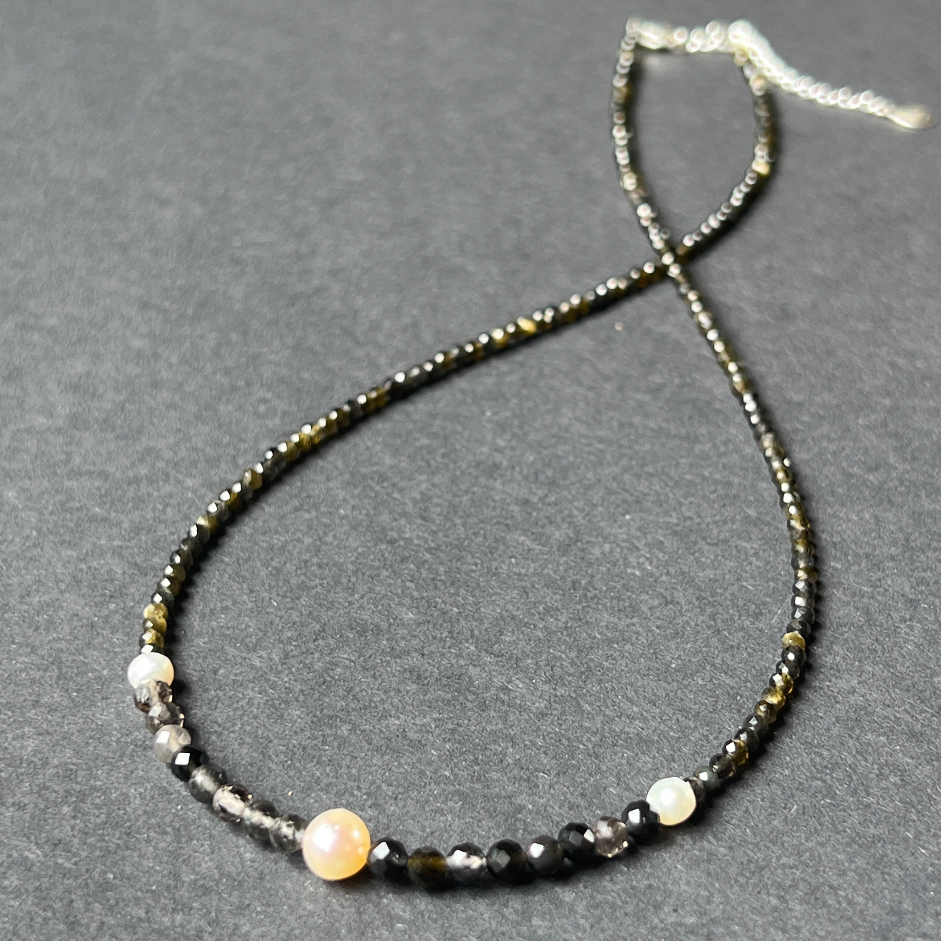 Az obszidián az önvizsgálat köve, a bátorság köve, hogy belenézzen és eloszlassa az illúziókat. Azt mondják, hogy elűzi a negatívumokat, és tisztánlátást ad a döntésekben. A gyöngyök kifinomultsággal és együttérzéssel egészítik ki ezt az energiát, megnyitva teret a gyengéd átalakuláshoz.