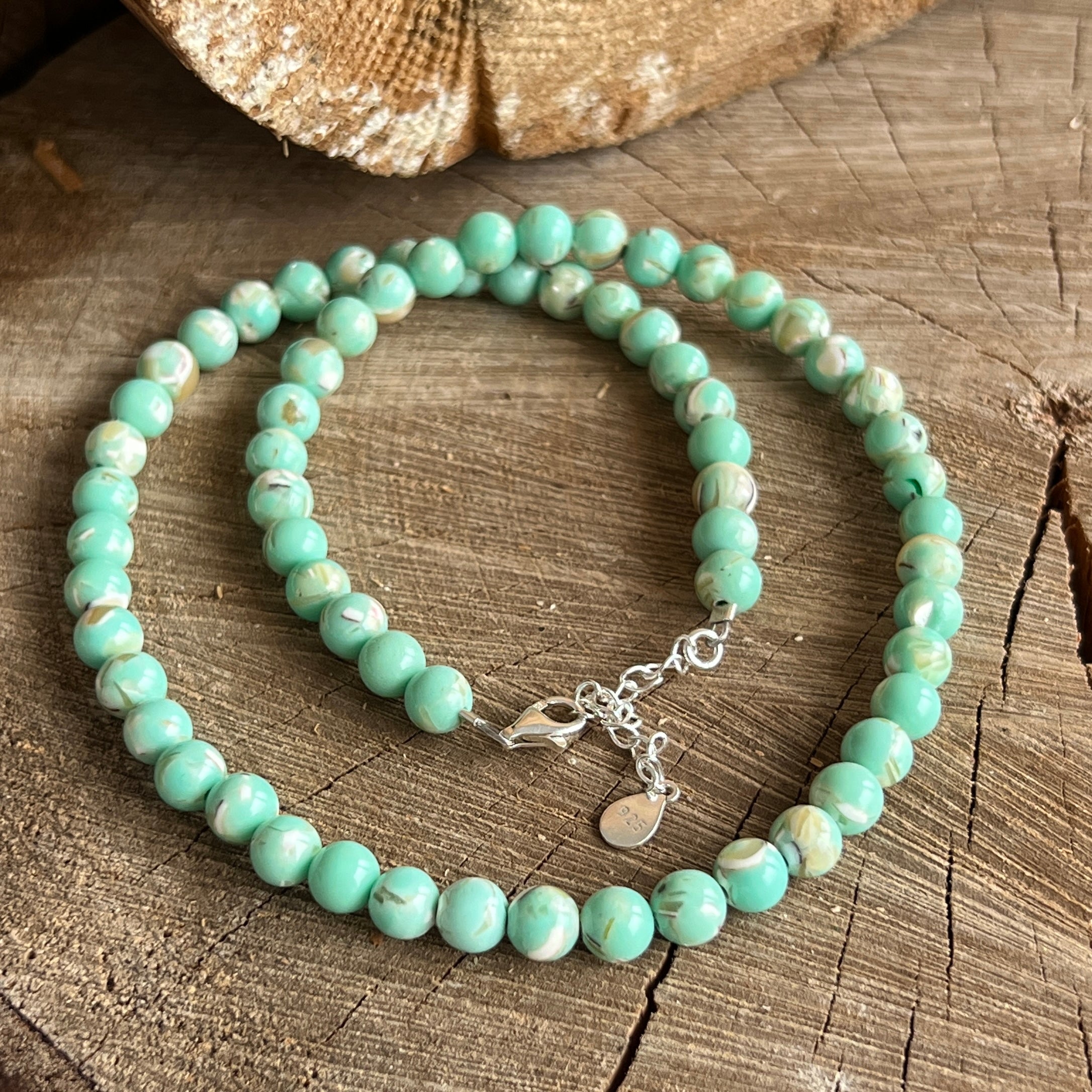 Egy finom és harmonikus nyaklánc, amely 6 mm-es kagylógyöngyökből készült. A sima felület és a meleg, gyöngyház árnyalatok nyugodt és elegáns megjelenést kölcsönöznek, könnyen illeszthető mind a mindennapi öltözékhez, mind a kifinomultabb kombinációkhoz.