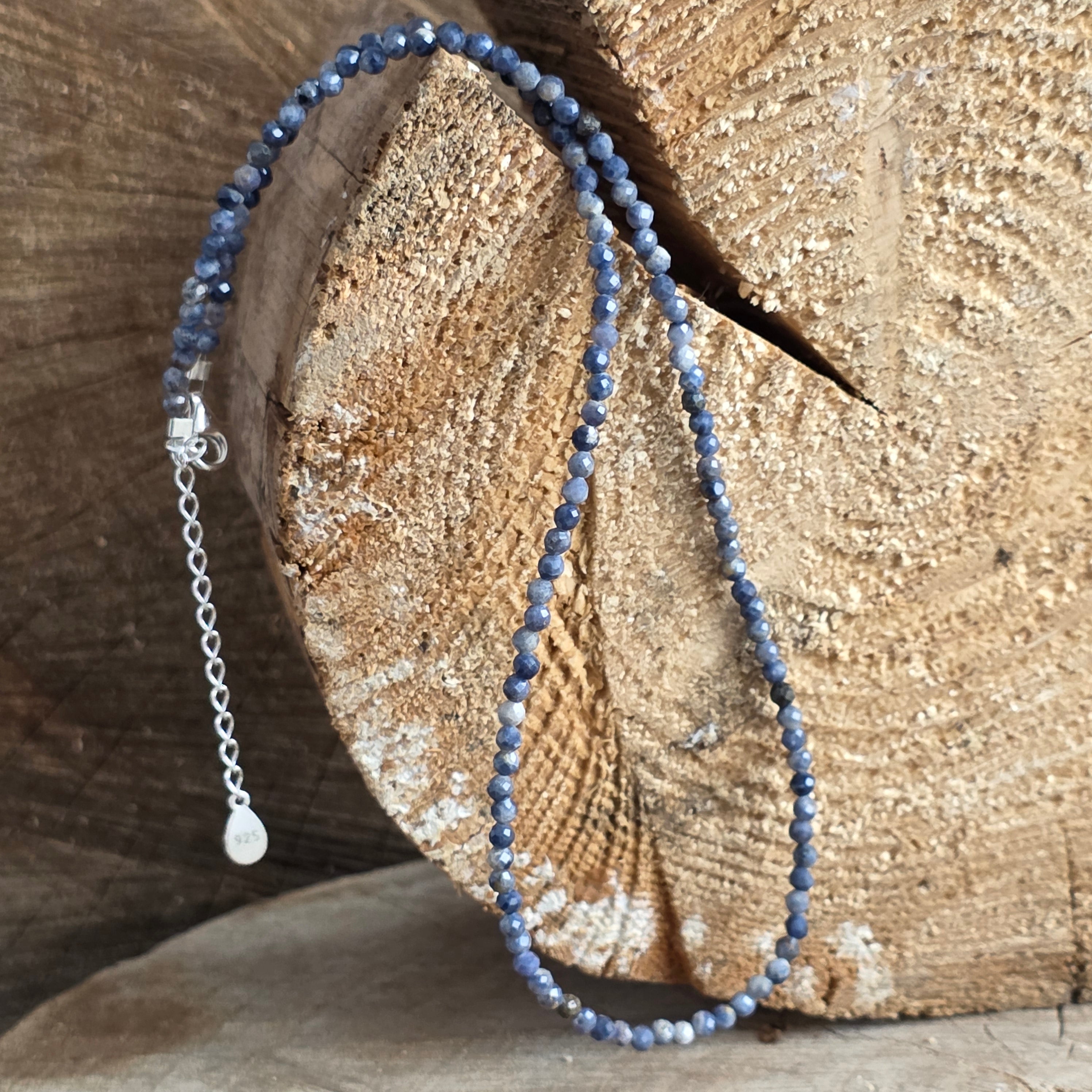 Egy nyaklánc Csendes elegancia, létrehozva 3 mm-es faszett természetes zafír, amelynek mély kék árnyalatai megőrzik a tiszta éjszakák és a belső béke rejtélyét.
