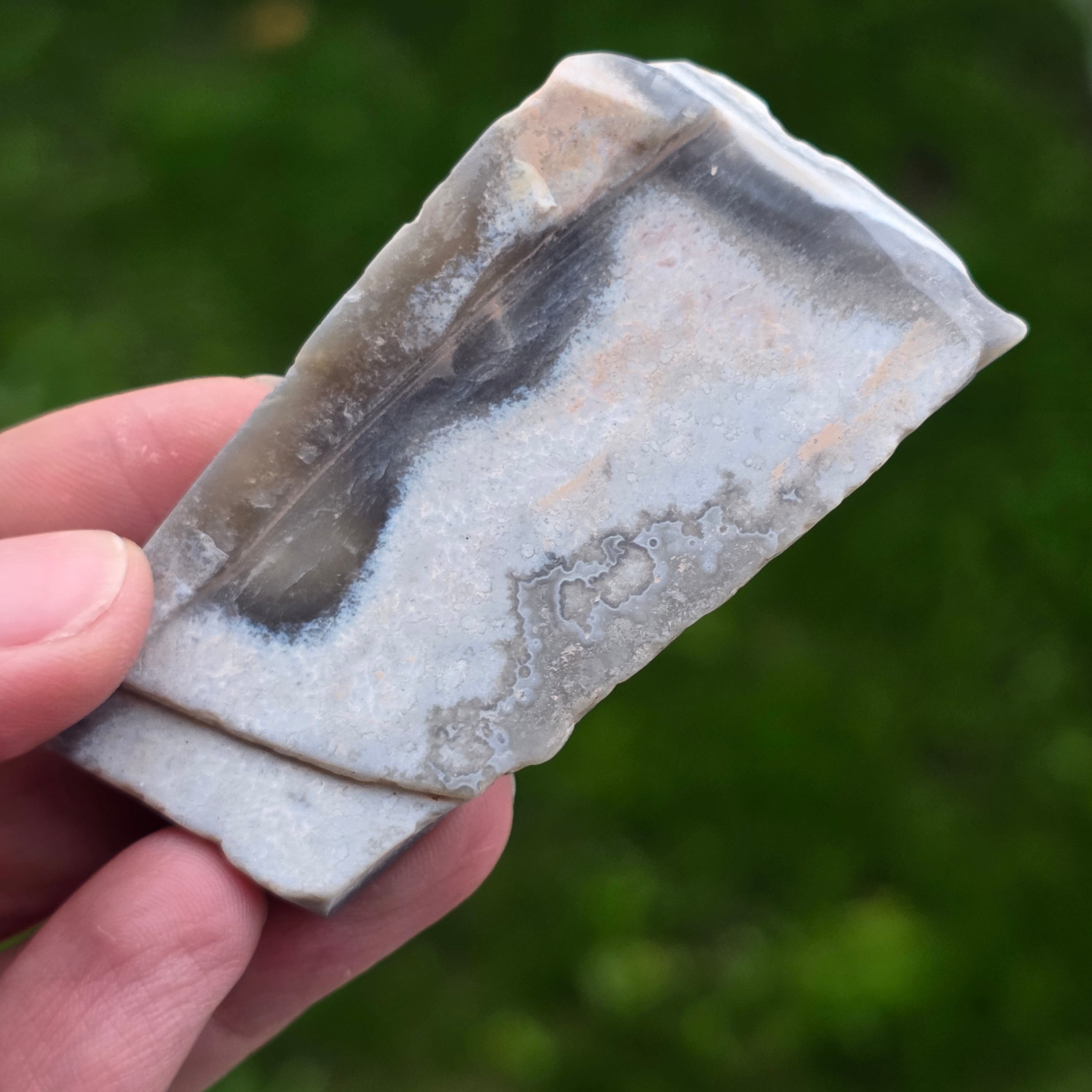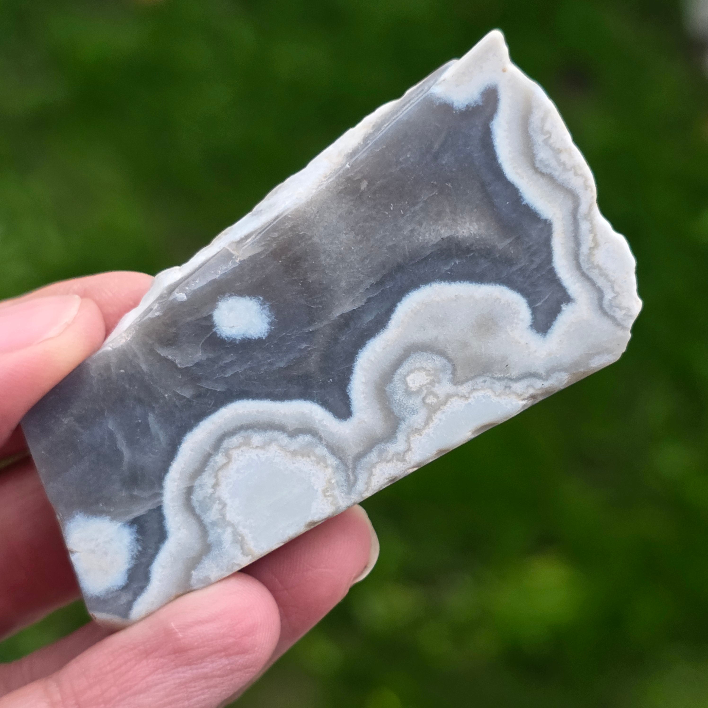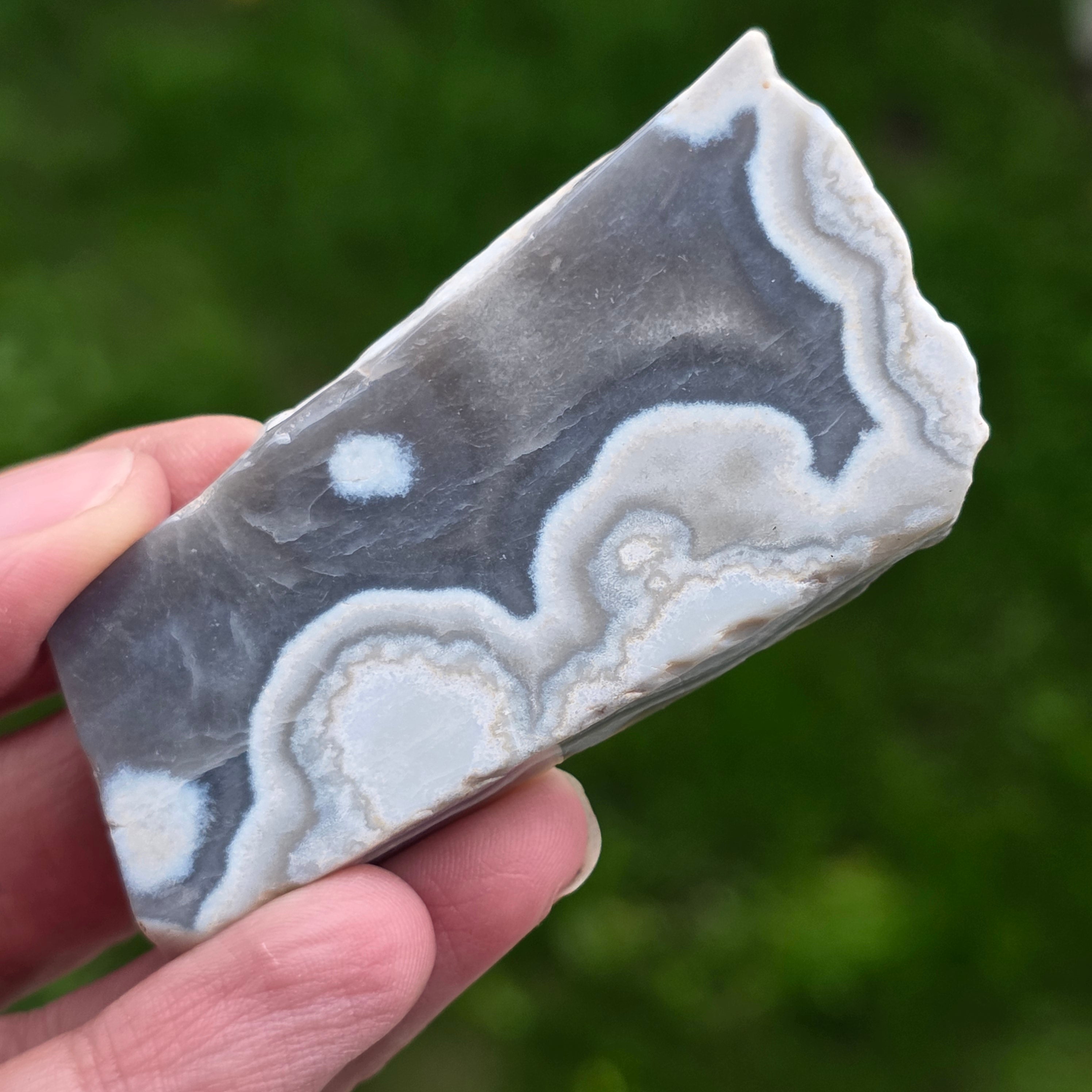 A mexikói Crazy achát az achát egyik legélénkebb és leglátványosabb változata, híres hullámos vonalairól és a szabadkézzel festettnek tűnő őrült színjátékaikról. Ebben a természetes, kicsi, de rendkívül kifejező szeletben a kő egész története kibontakozik: földszínek, meleg karamell, élénkpiros, narancs, szürke és krém árnyalatok keverednek spirális mintákban, amelyek mintha az élettel lüktetnének.