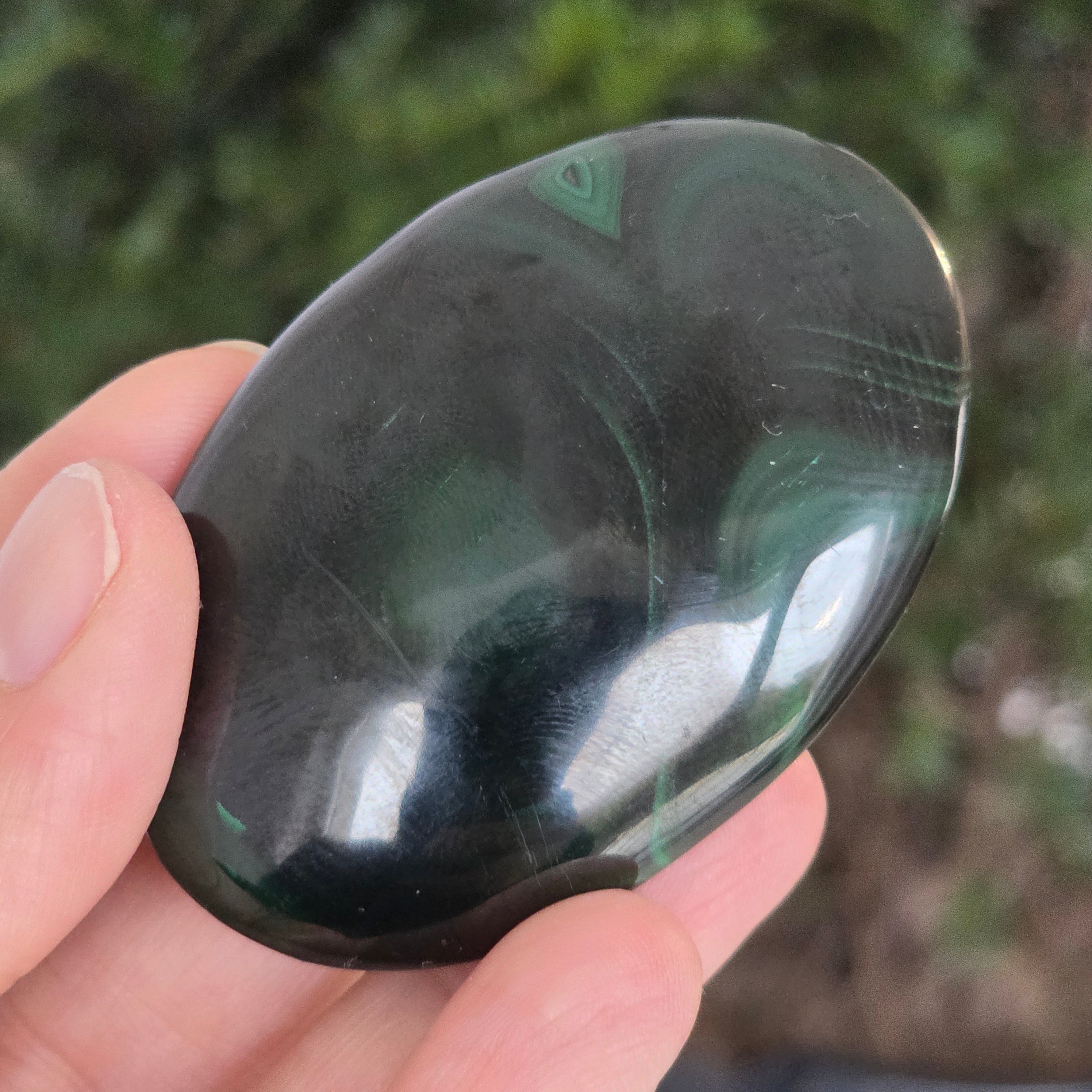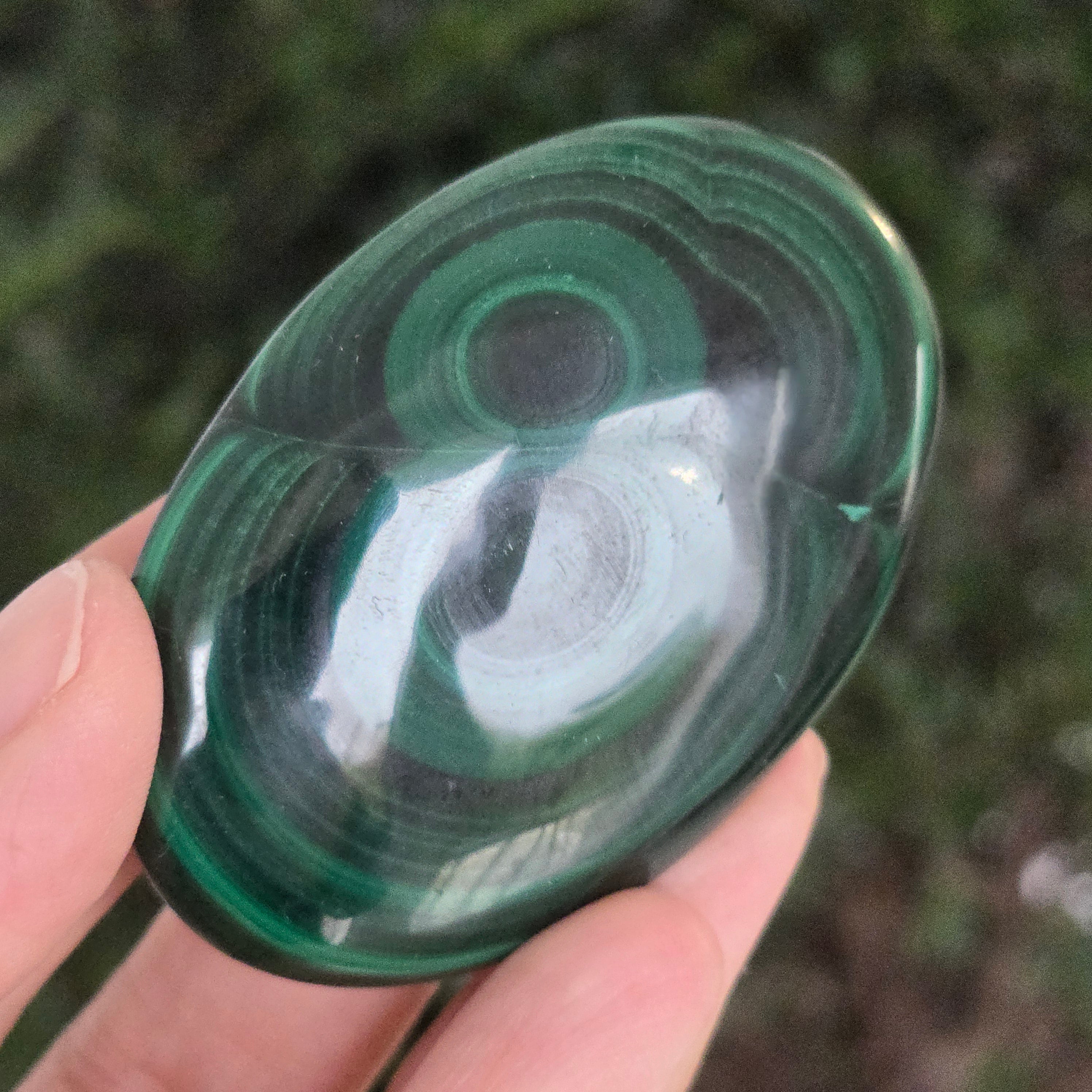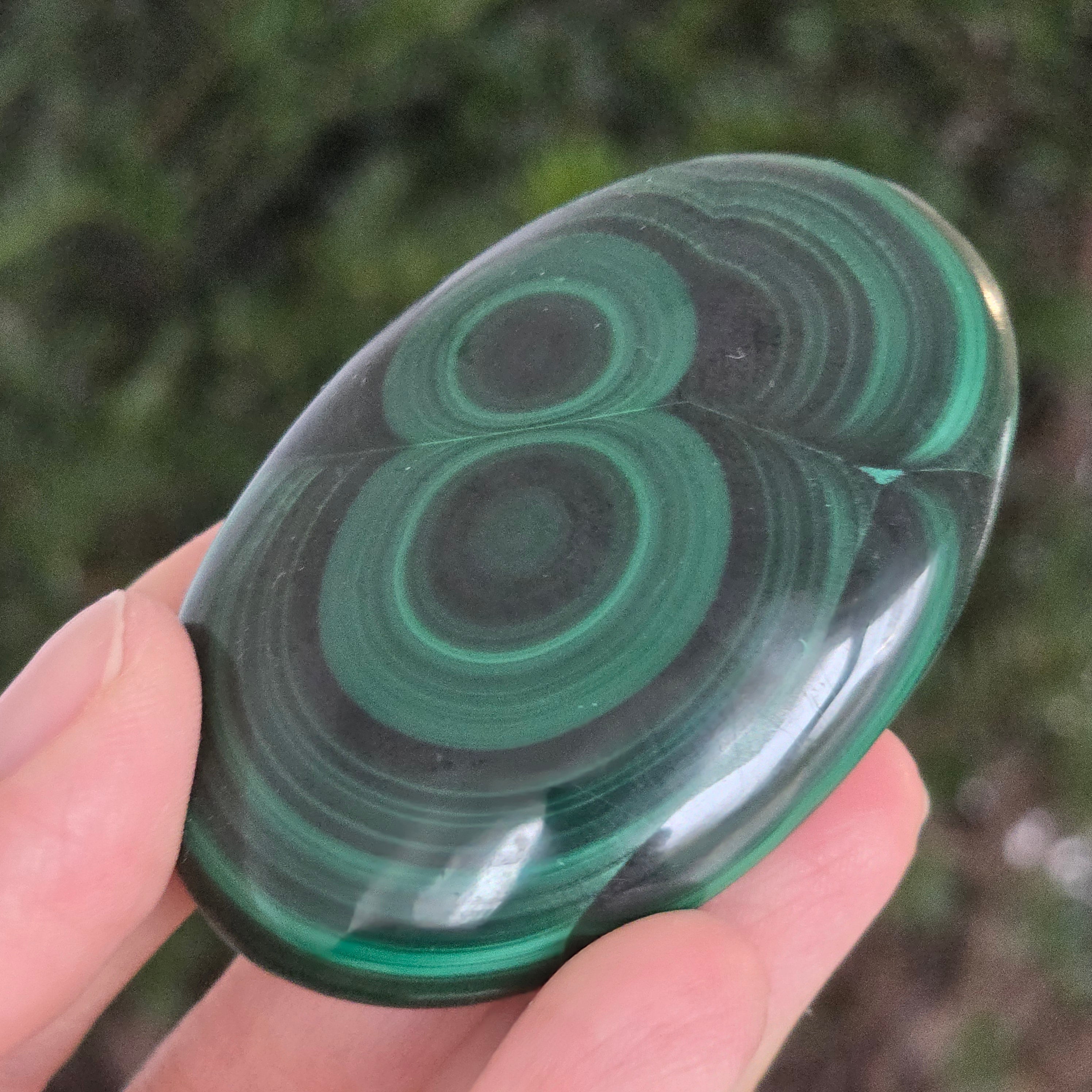 Egy pálmakő, amely mintha az élő Föld energiájával lélegzik. Ezt egyedülálló természetes malachit darab, hipnotikus hullámokat mutat be mélyzöld és smaragdszínű, amelyeket gyűrűk és koncentrikus sávok kereszteznek, amelyek mintha maga a természet faragnák volna. A sima, tökéletesen polírozott textúrája kellemesen helyezi el a kőt a tenyeredben, meleg és védelmező rezgést árasztva.