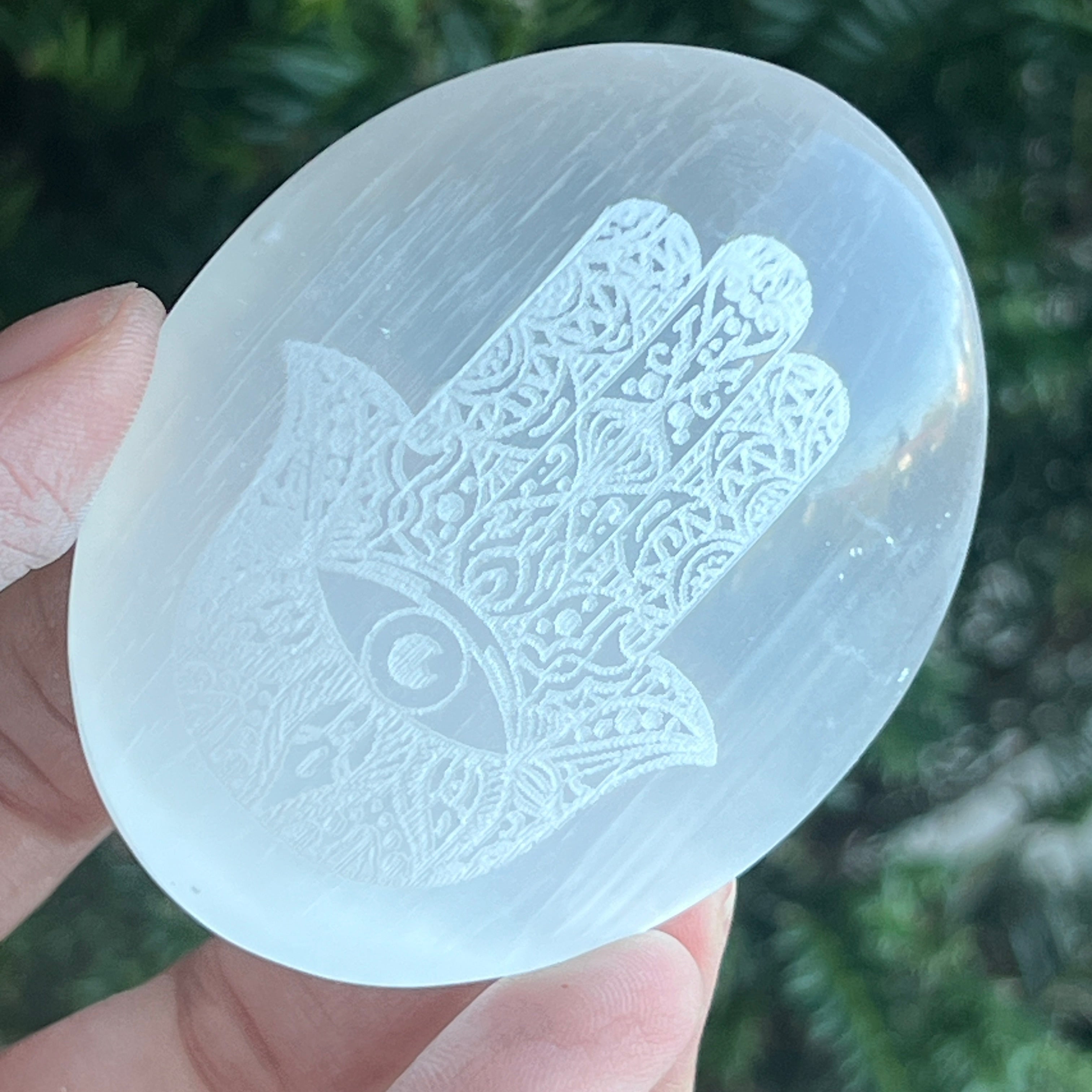 A szimbólum Fatima keze (Hamsa), a selenit felületére vésett, évszázadok óta hordják talizmánként a negatív energiák és irigy tekintetek ellen. Az isteni védelmet, a szerencsét és az áldást jelképezi, a fény jeleként űzi el az árnyakat.