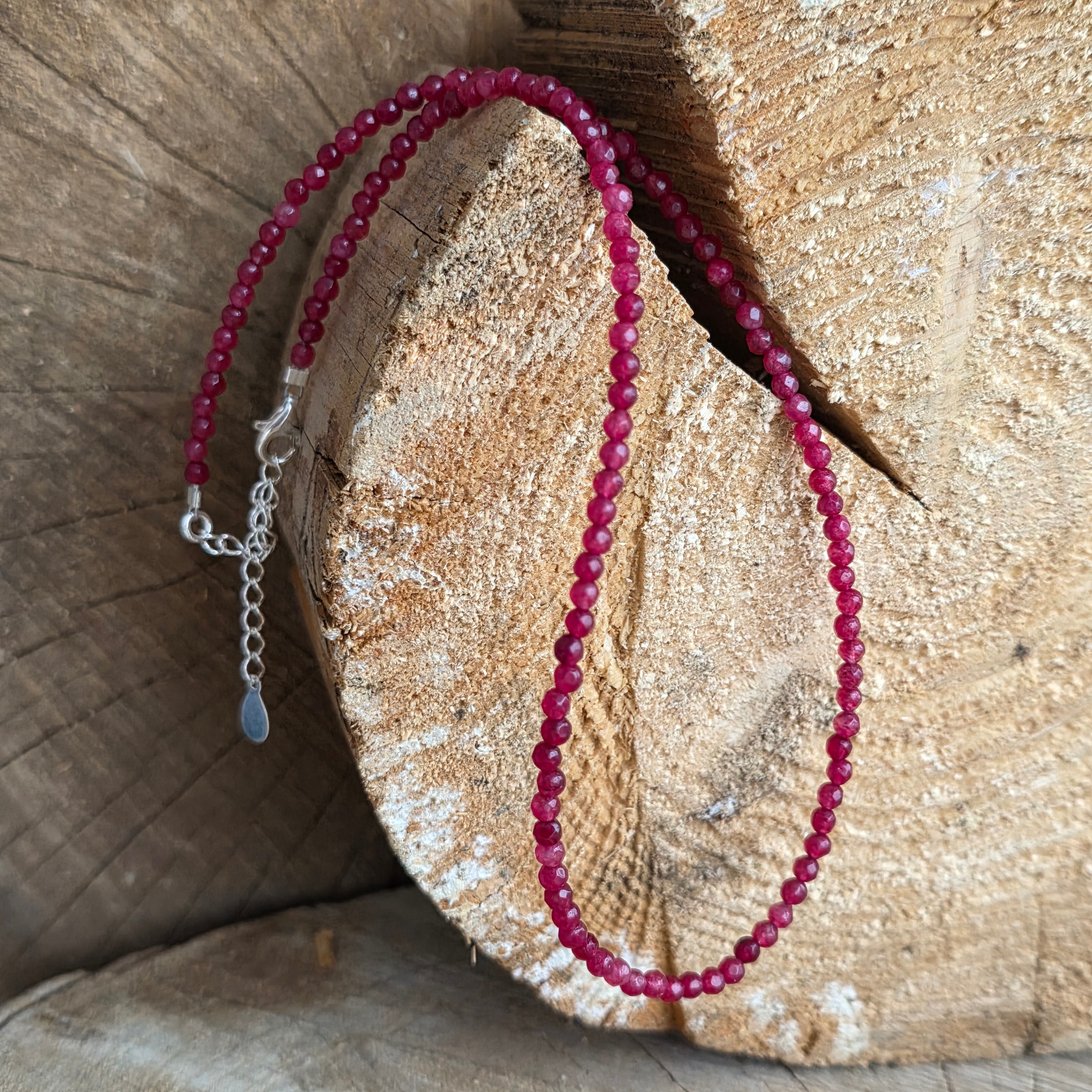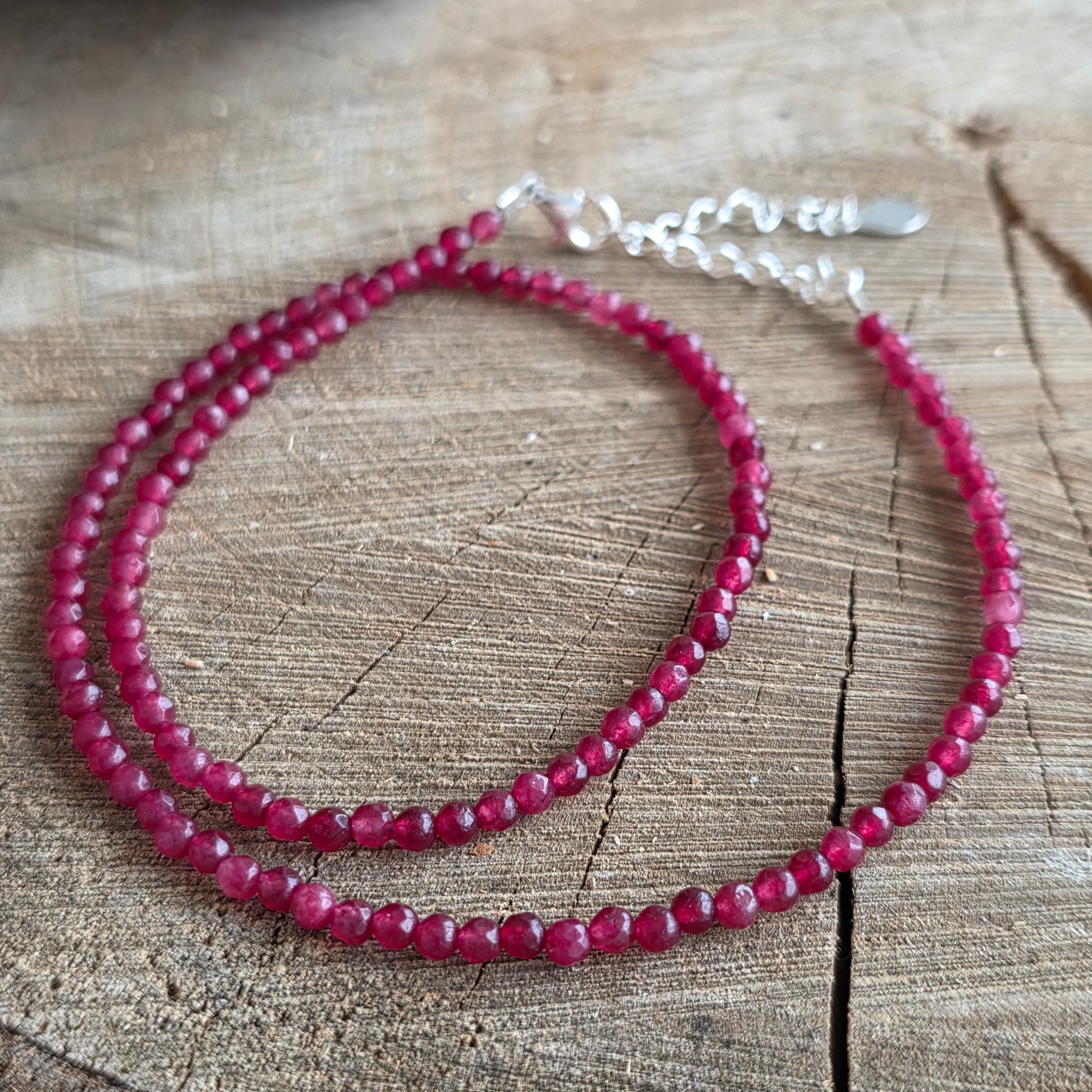 A huzal teljes egészében csiszolt gömbökből áll 3 mm-es bordó achát, sötét gyöngyök finom tükröződésekkel a tompa rubin, az érett cseresznye és a leülepedett vörösbor árnyalatai között. A finom oldalak diszkréten megfogják a fényt, mint egy alig sejthető sóhaj, a mély és telt szín pedig olyan gravitációval bír, amely csendre és jelenlétre hív.