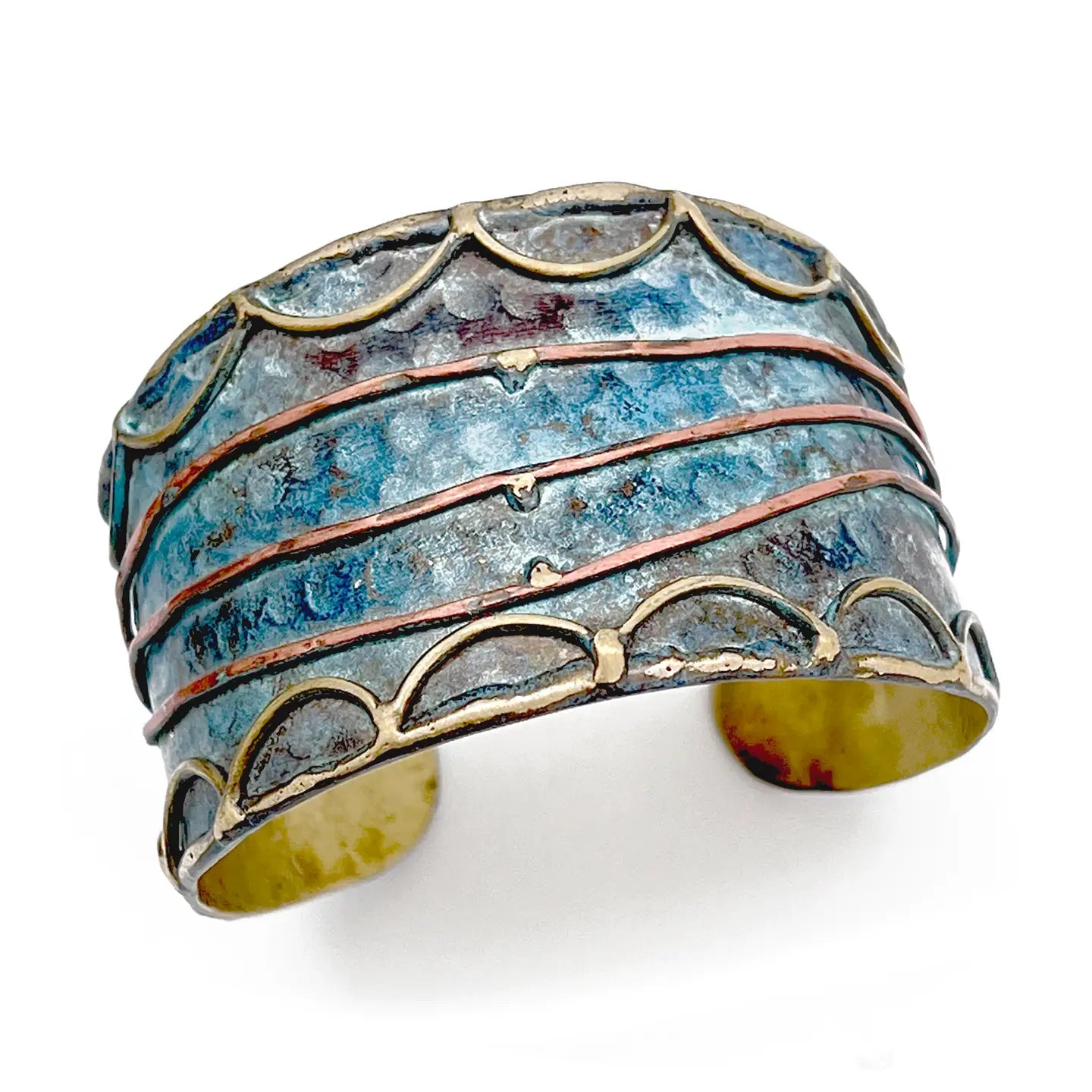 A Rushing River karkötő intenzív kézműves patinájával ragadja meg a tekintetet, kék és zöld árnyalatokban, melyek a mélytengeri szépséget idézik. Az íves, hullámszerű motívumok kiegészítik a folyékony és organikus dizájnt, minden részletet a víz és a szabadság történetévé alakítva.