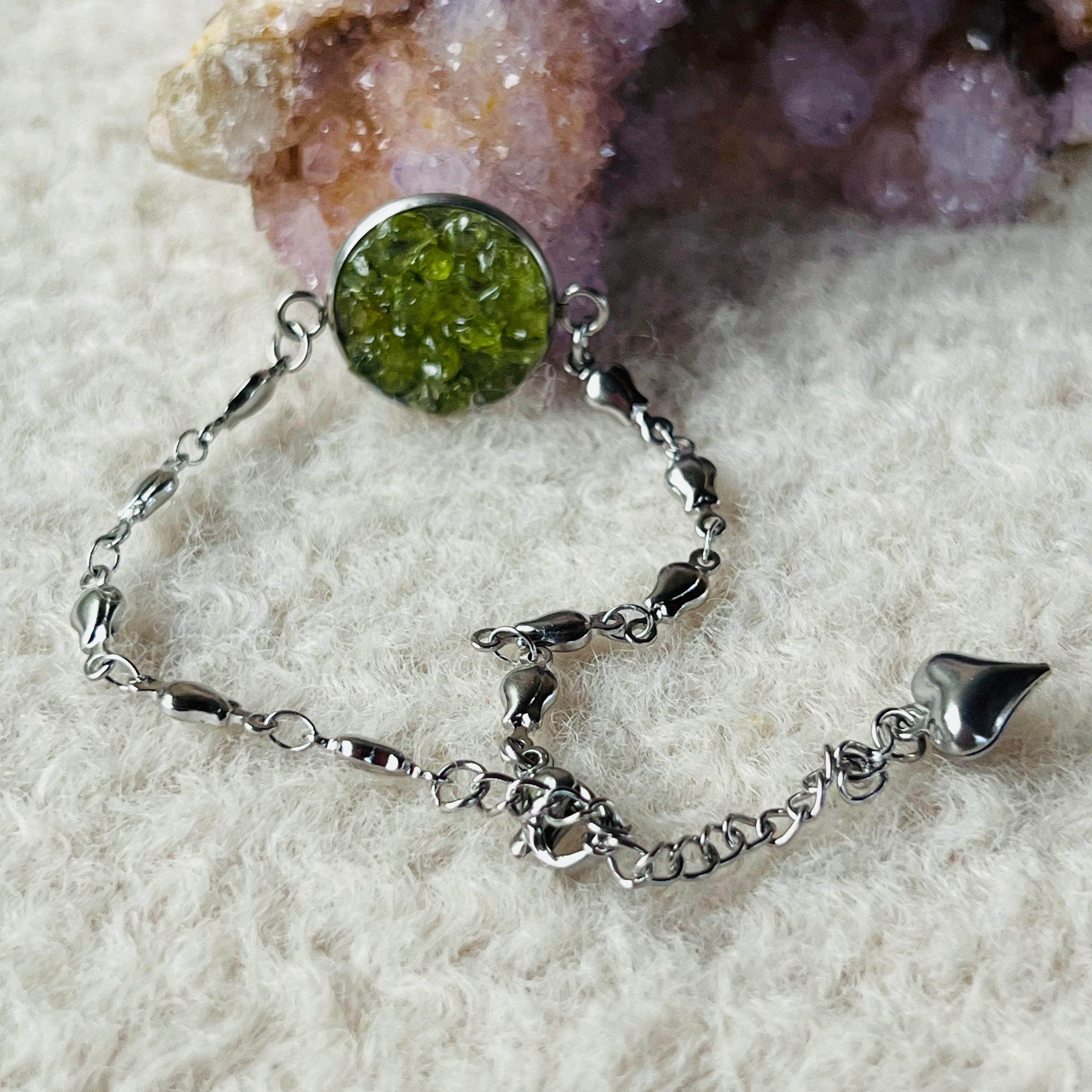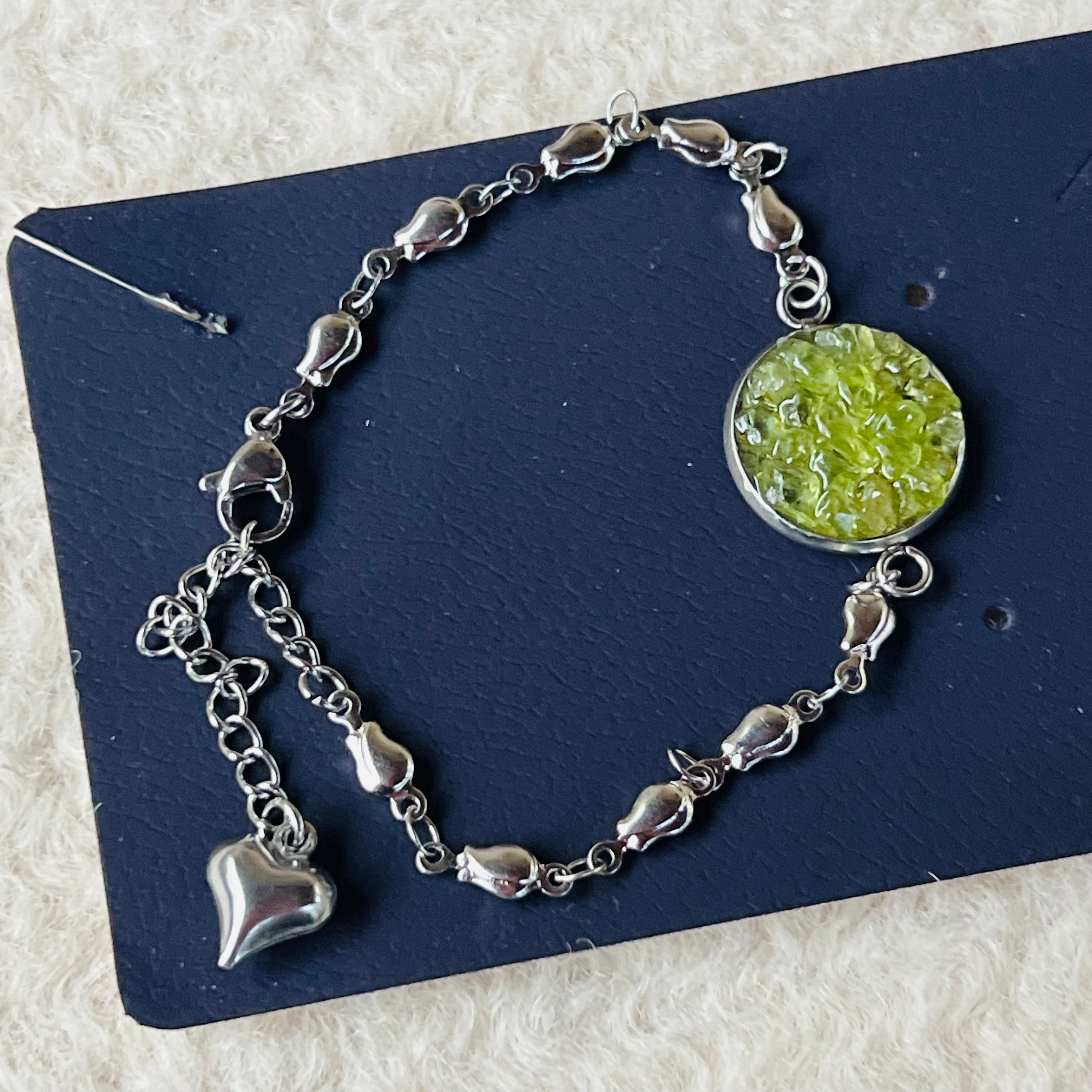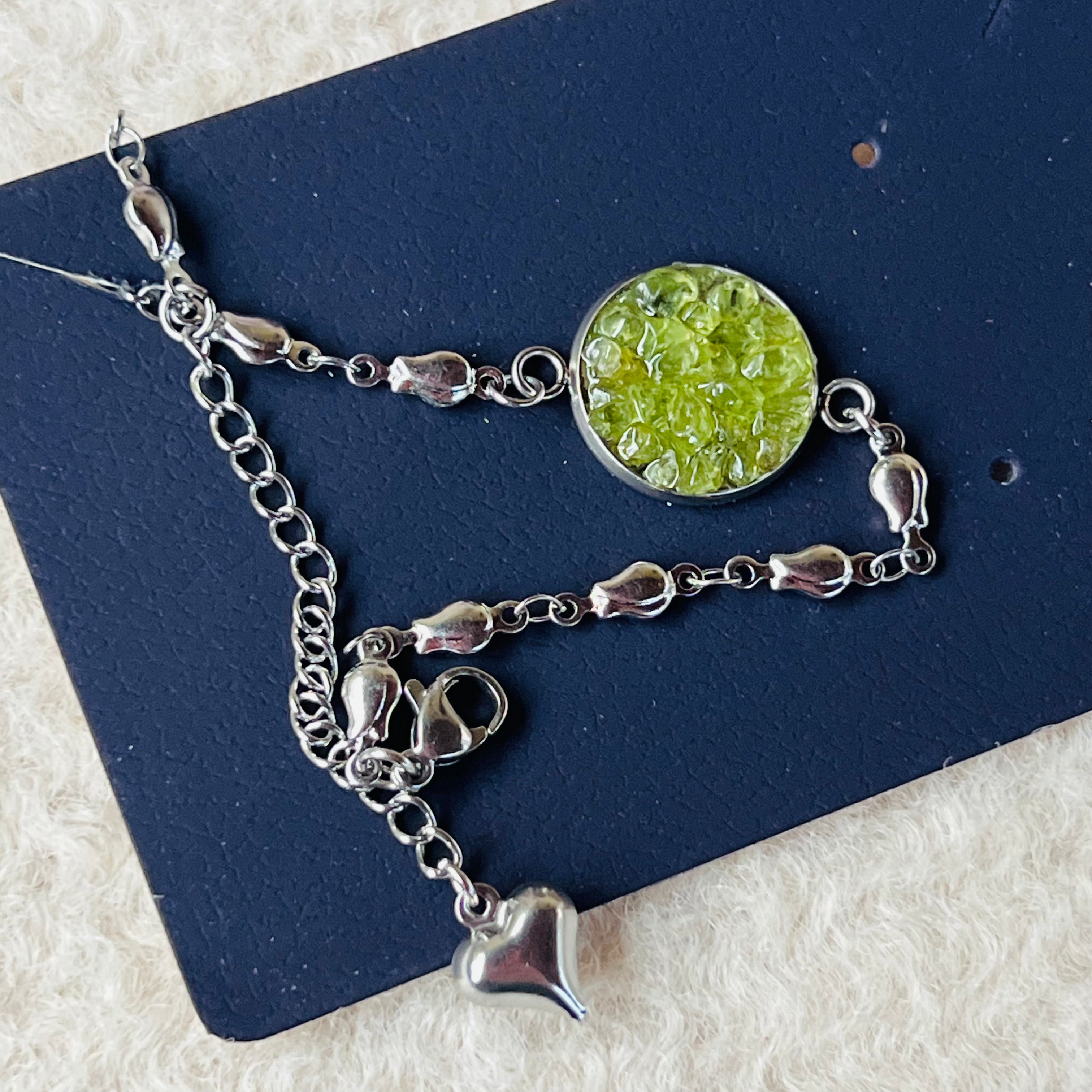 Anyagok: peridot, rozsdamentes acél, gyanta