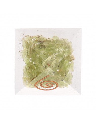 A peridot gyémánt piramis gyantában a zöld árnyalatok fényességét sugározza, amit a követ védő, átlátszó gyanta emel ki.