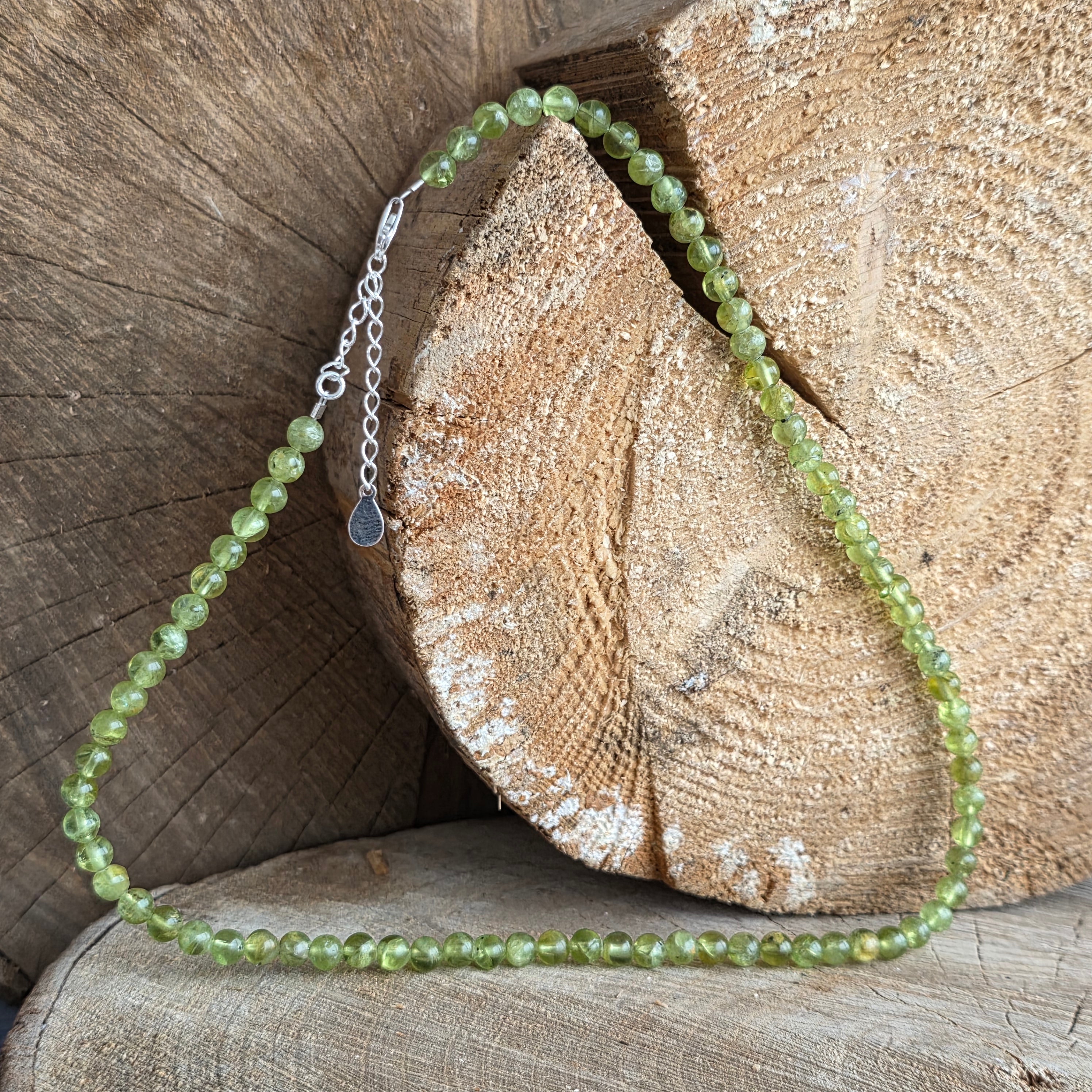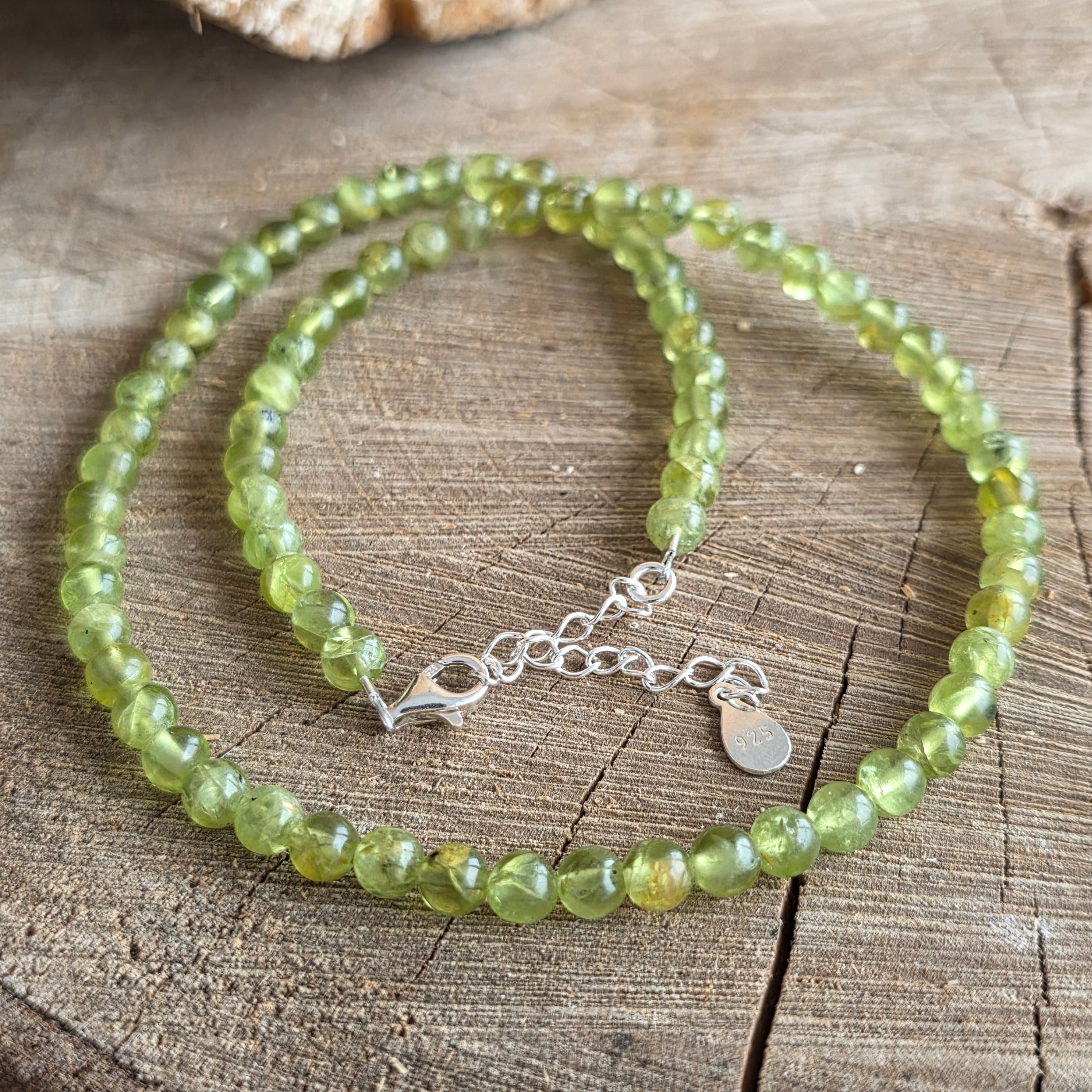 Egy fényes és friss nyaklánc, 5 mm-es peridot golyókból, gondosan válogatva, élénk és tiszta zöld színben, amely életet sugárzó pulzálásnak tűnik. Minden golyó meleg átlátszósággal tükrözi a fényt, az újrakezdés, a lezárt szakasz utáni mély lélegzet érzését idézve. A dizájn tiszta és kiegyensúlyozott, a kő a kifejezés központja.