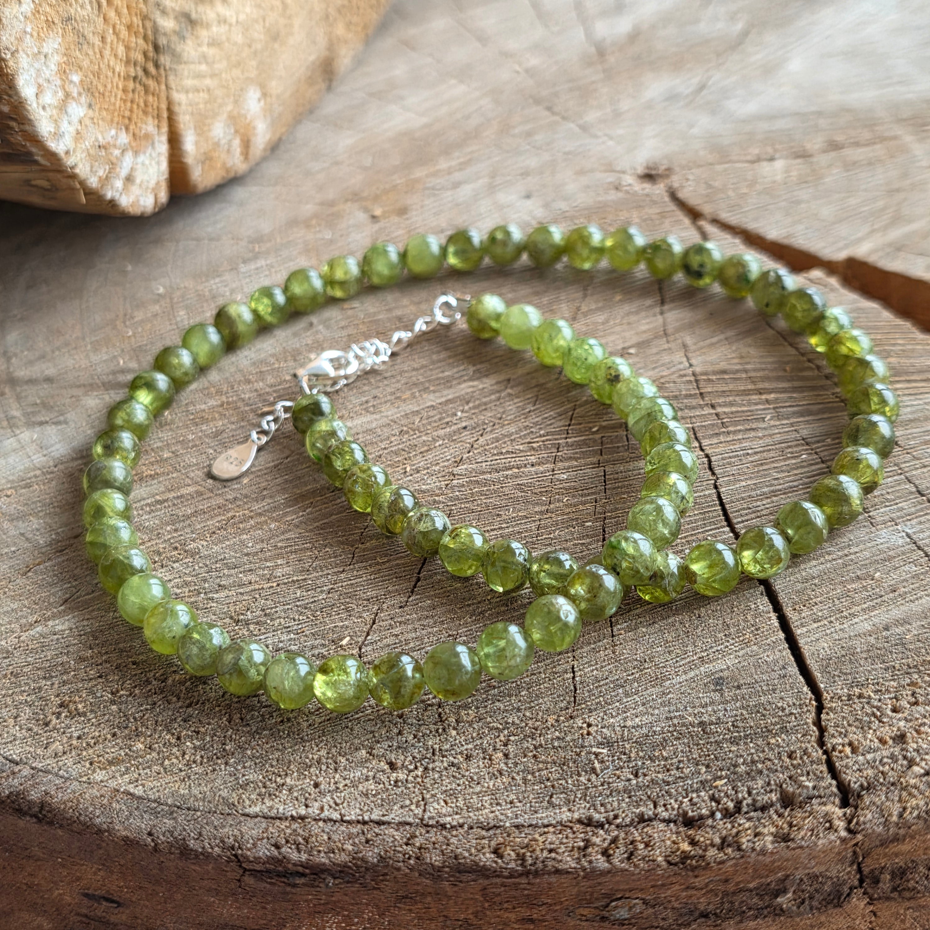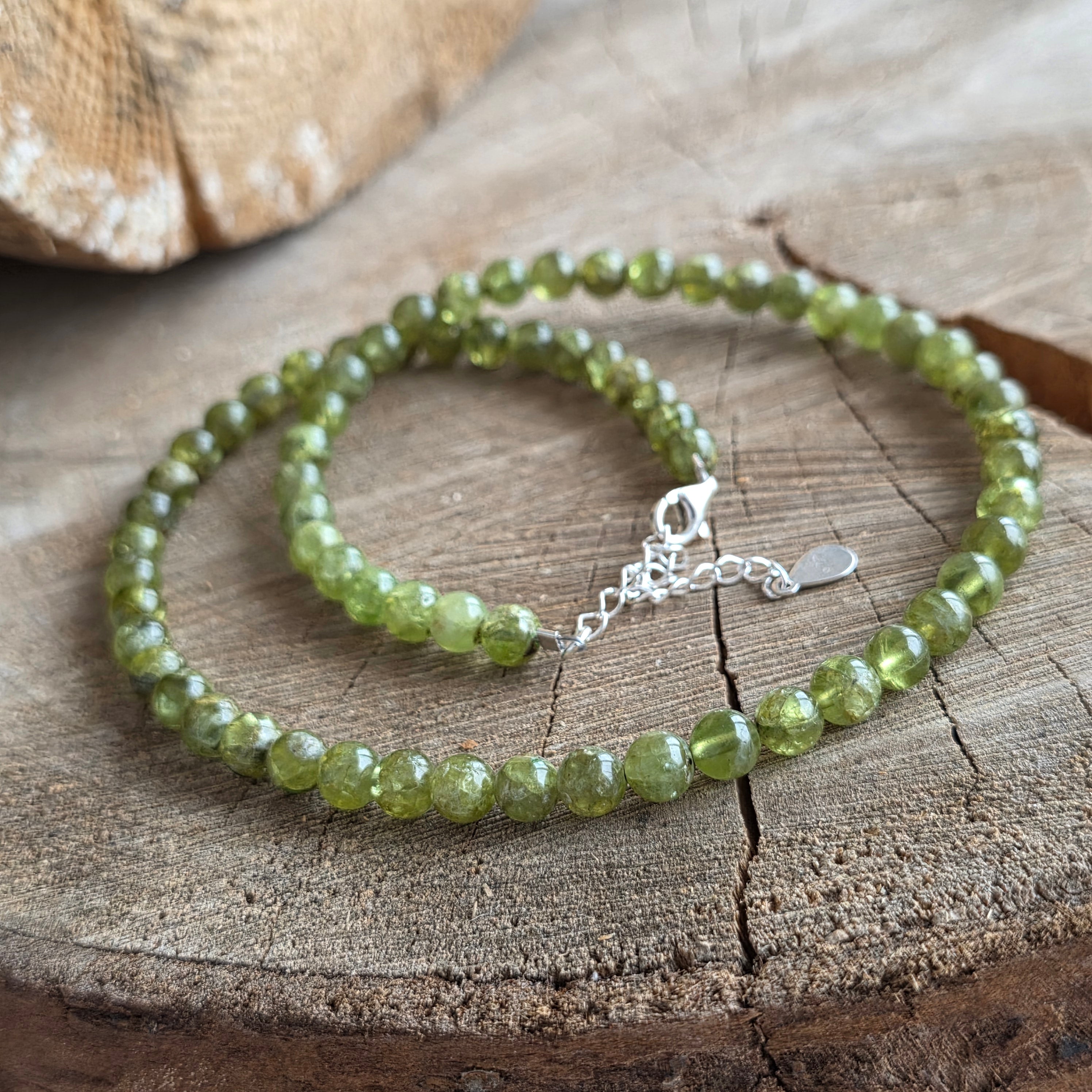 Egy fényes és friss nyaklánc, 6 mm-es peridot gyöngyökből készült, amelyek gondosan válogatott AAA minőségűek, élénk, tiszta zöld színűek, amely mintha az életet pulzálná. Minden gyöngy meleg átlátszósággal veri vissza a fényt, az újrakezdés, a lezárt szakasz utáni mély lélegzet eszméjét idézve. A design tiszta és kiegyensúlyozott, hagyva, hogy a kő legyen a fő kifejezés központja.