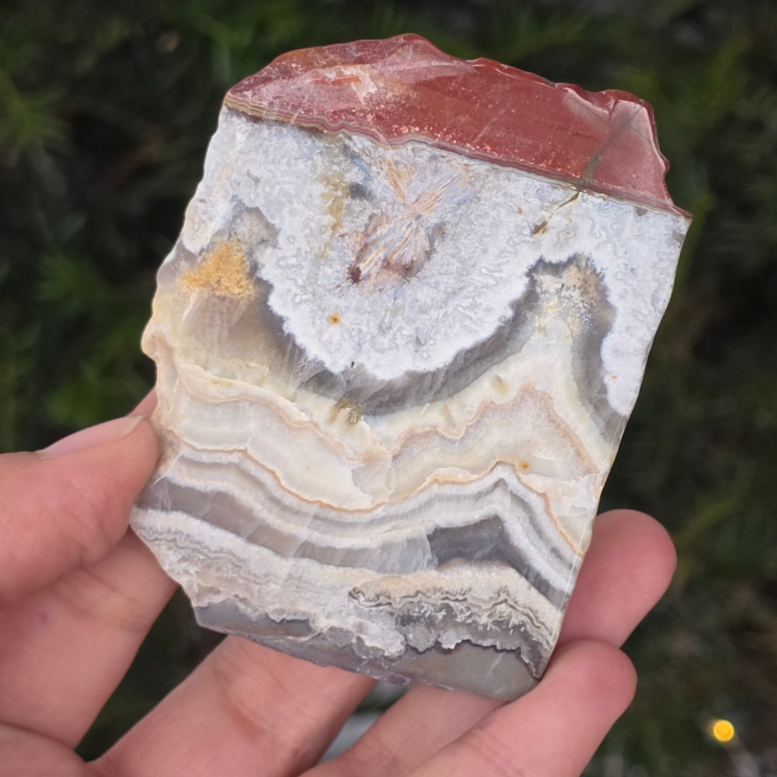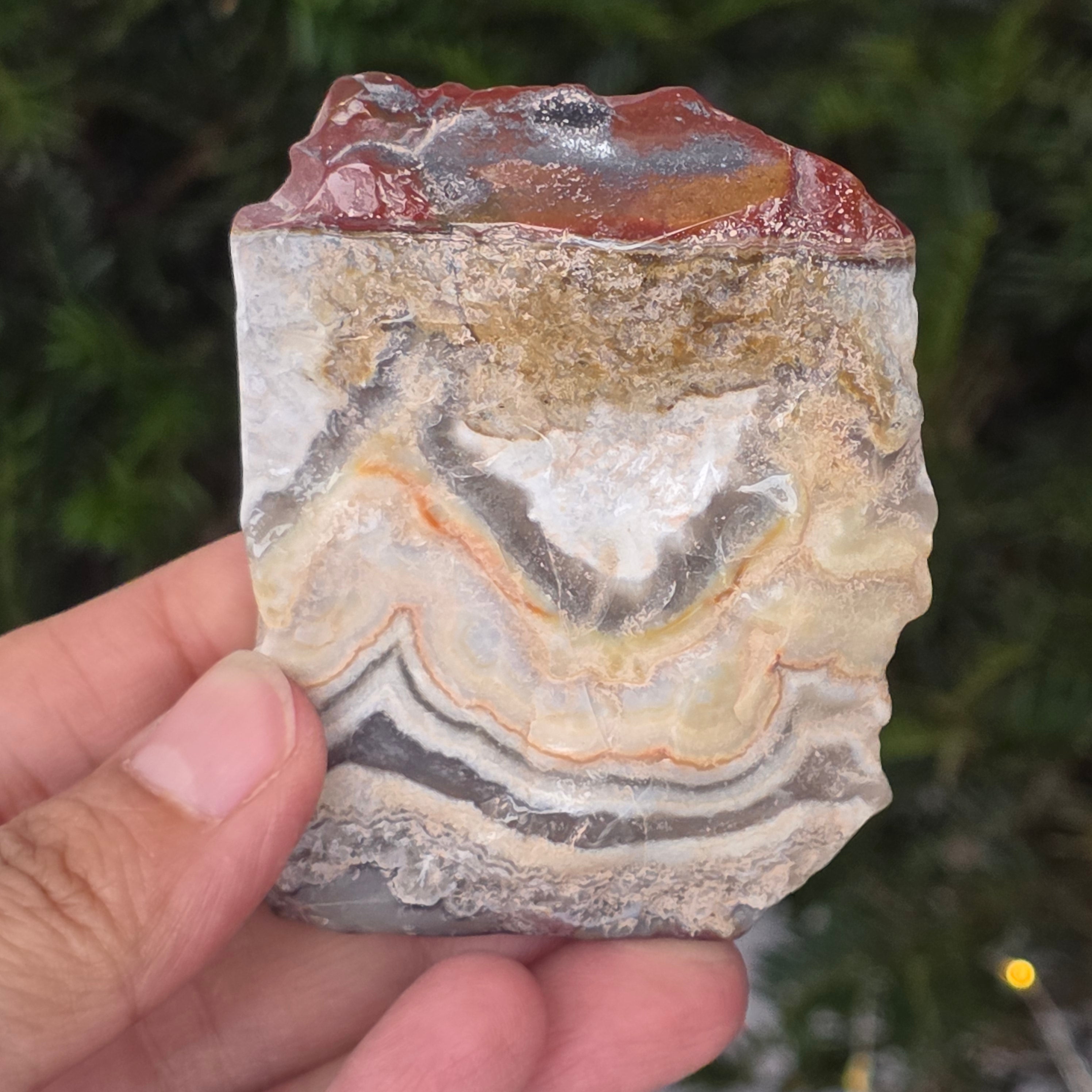 A mexikói Crazy Achát az egyik legélénkebb és leglátványosabb achátfajta, híres hullámos vonalairól és a színek vad játékáról, mintha szabad kézzel, szabályok nélkül rajzolták volna őket. Ebben a természetes szeletben, apró, de rendkívül kifejező formában, a kő teljes története feltárul: földes rétegek, meleg karamellszínek, élénkpiros, narancs, szürke és krém árnyalatok, spirális mintákban keveredve, amelyek mintha élettel pulzálnának.