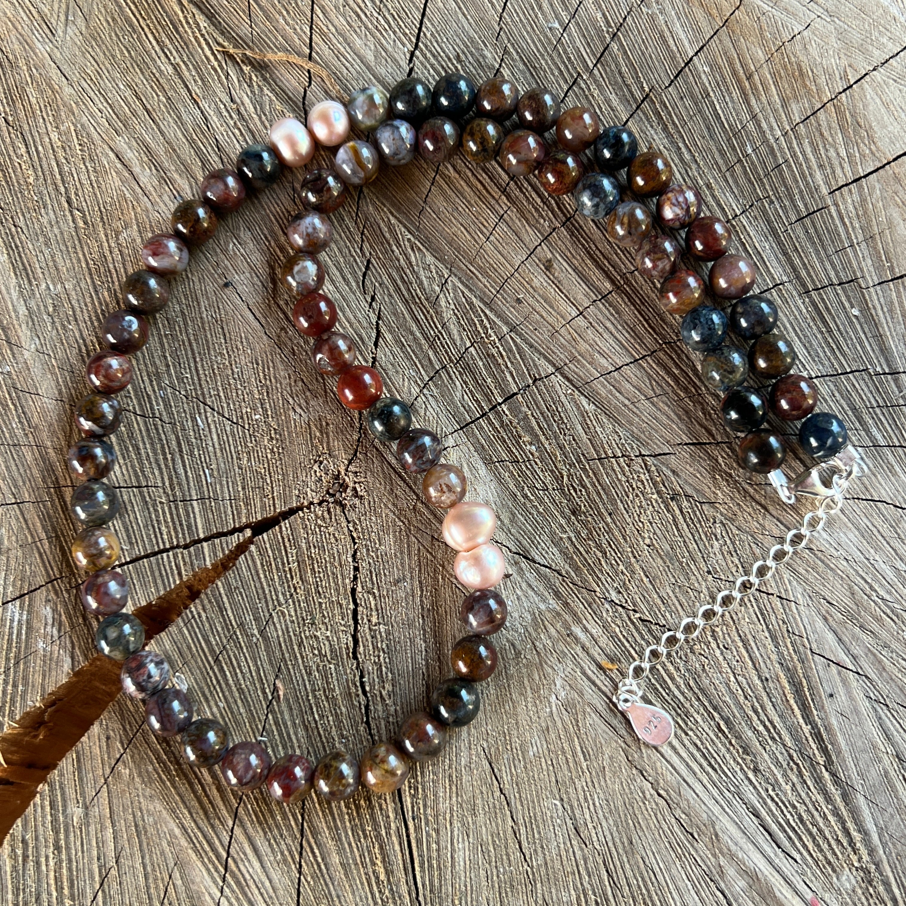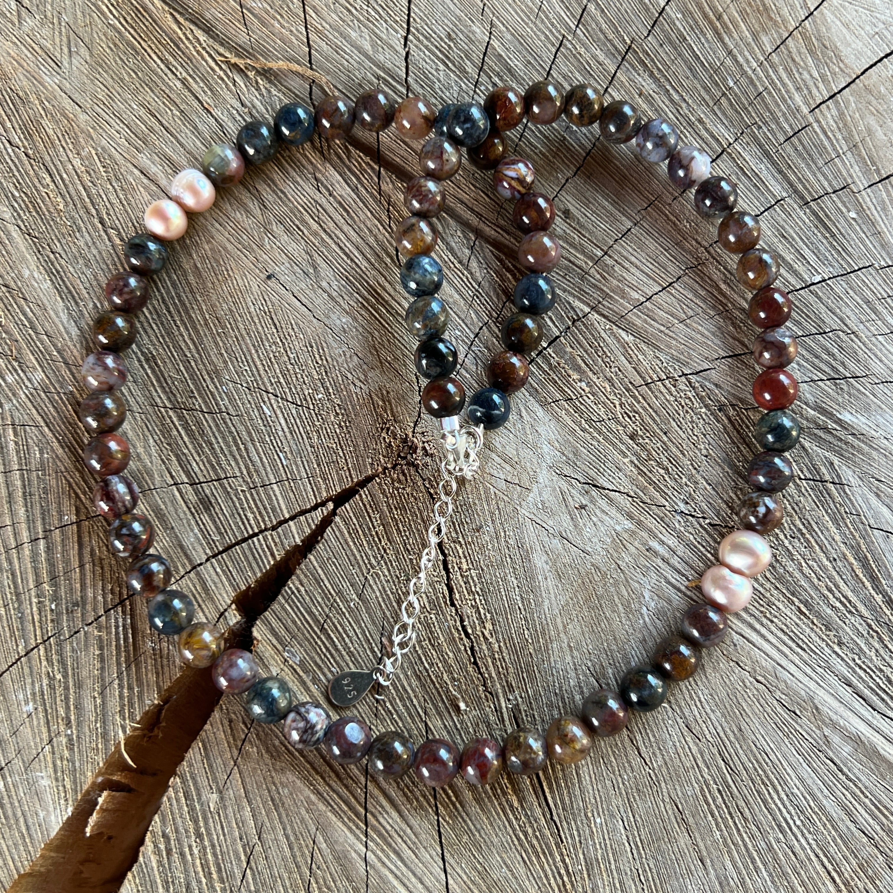 A pietersitet „vihar kövének” is nevezik – a gyors változás, a belső látás és a lelki horgonyzás amulettje viharos időkben. Azt mondják, energetikai védelmet nyújt és megnyitja a mély intuíció kapuját. A gyöngyök ezt a rezgést nyugalommal, kifinomultsággal és türelemmel egészítik ki.