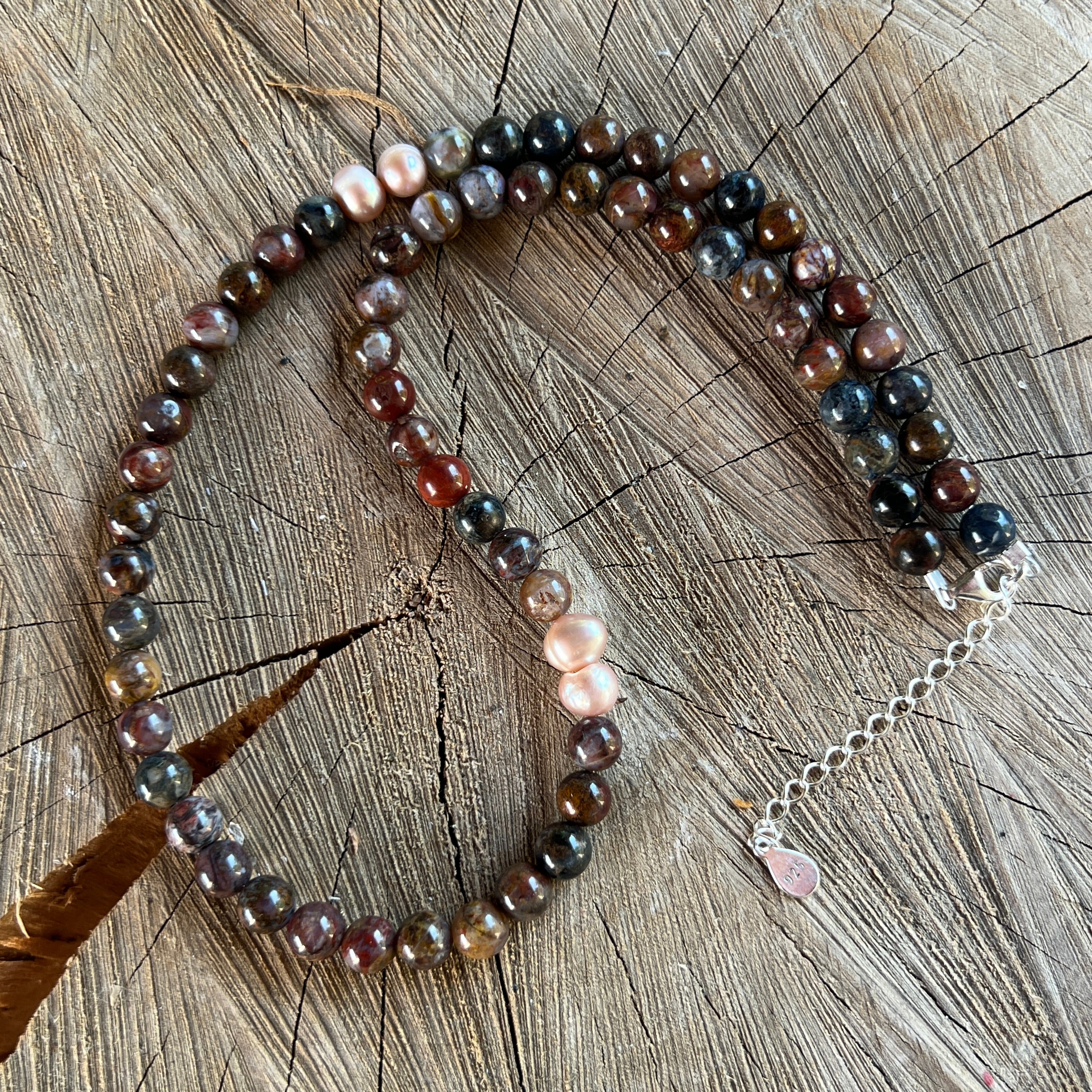Egy nyaklánc, mint egy csillagvihar, amely a szálak közé van zárva – intenzív, hipnotikus és mélyen védelmező. A 6 mm-es pietersit gyöngyök sötétkék, bronz, arany és szürke árnyalatokban rezegnek, mozgásban lévő fénytáncot teremtve, mint egy csendesülések között átsuhanó égbolt.