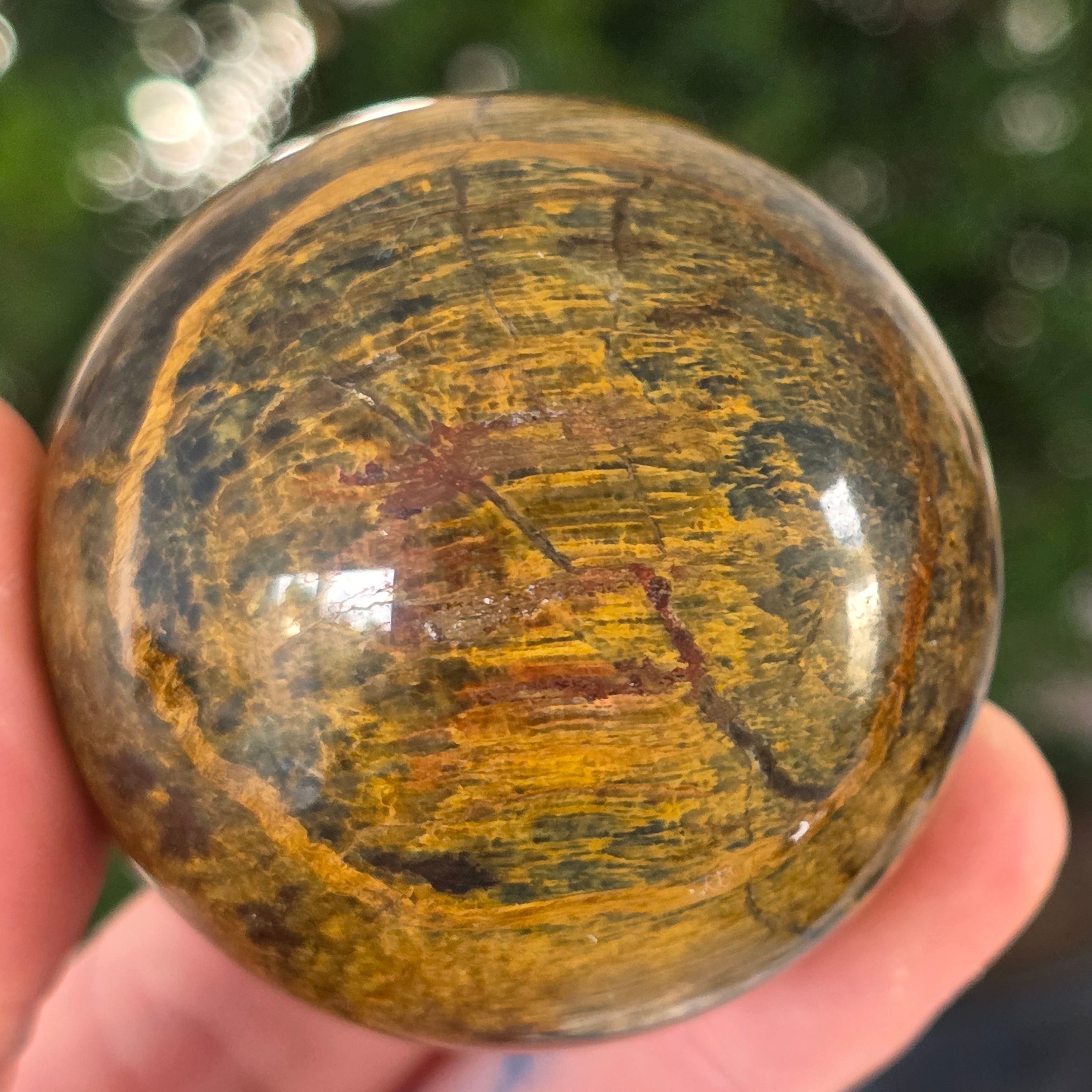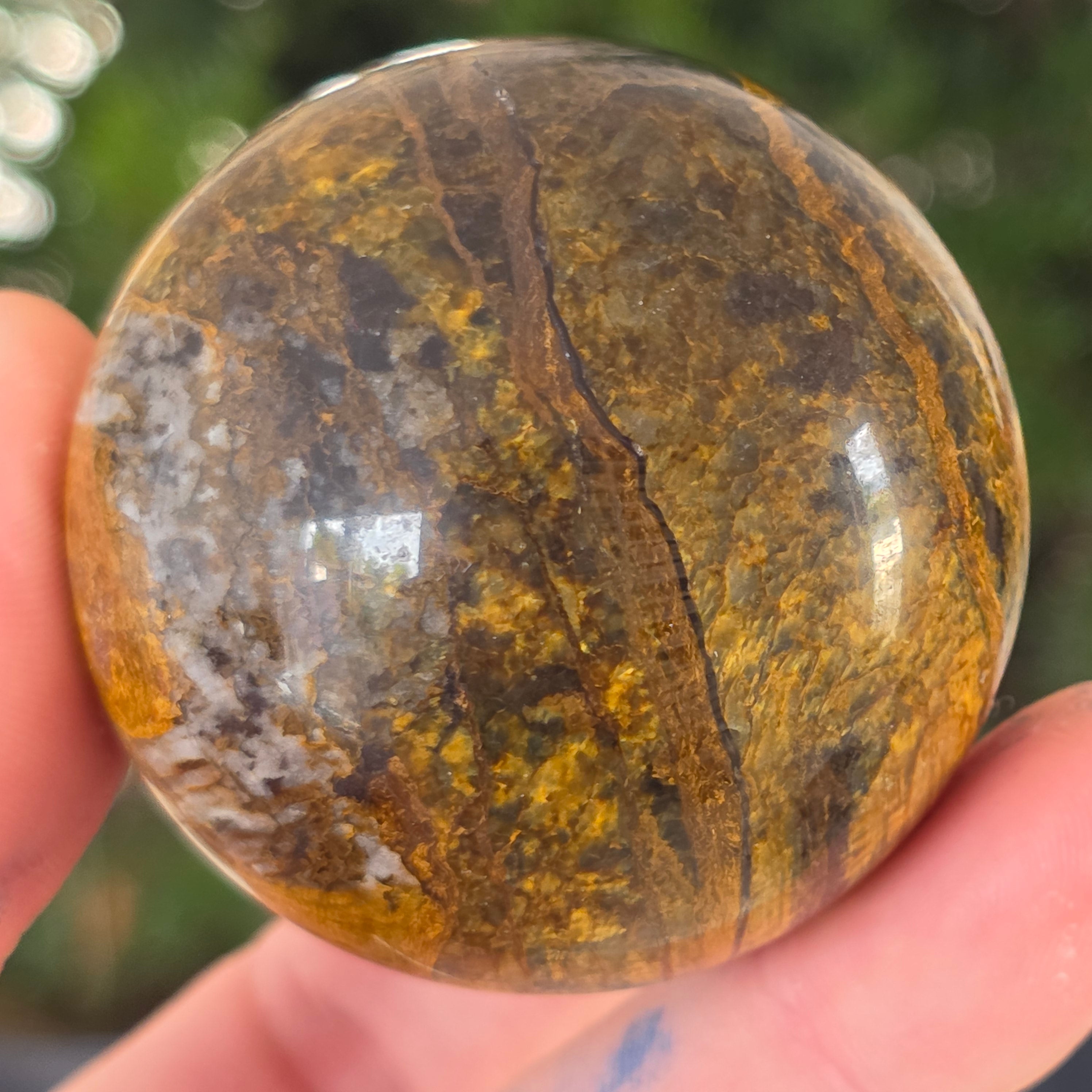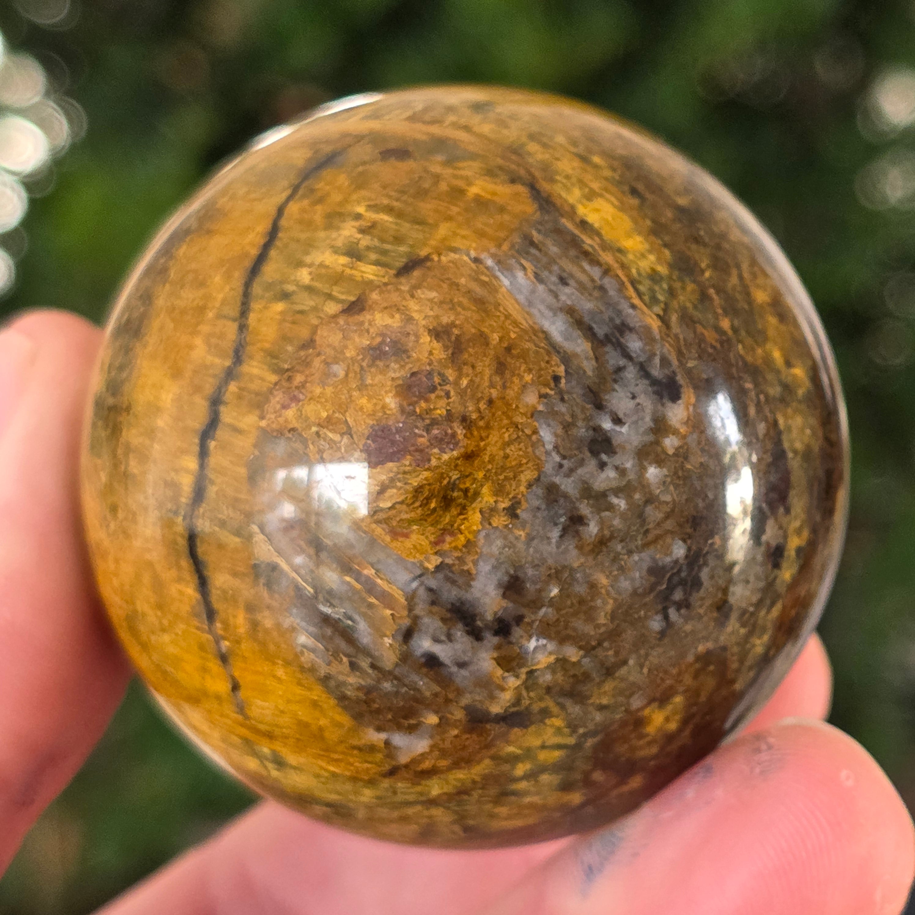 Ez a pietersit gömb olyan, mintha egy kozmikus vihar lenne a kőbe zárva. Kék és arany reflexiói úgy mozognak, mint az időbe dermedt felhők és villámok, állandó mozgás illúzióját keltve.