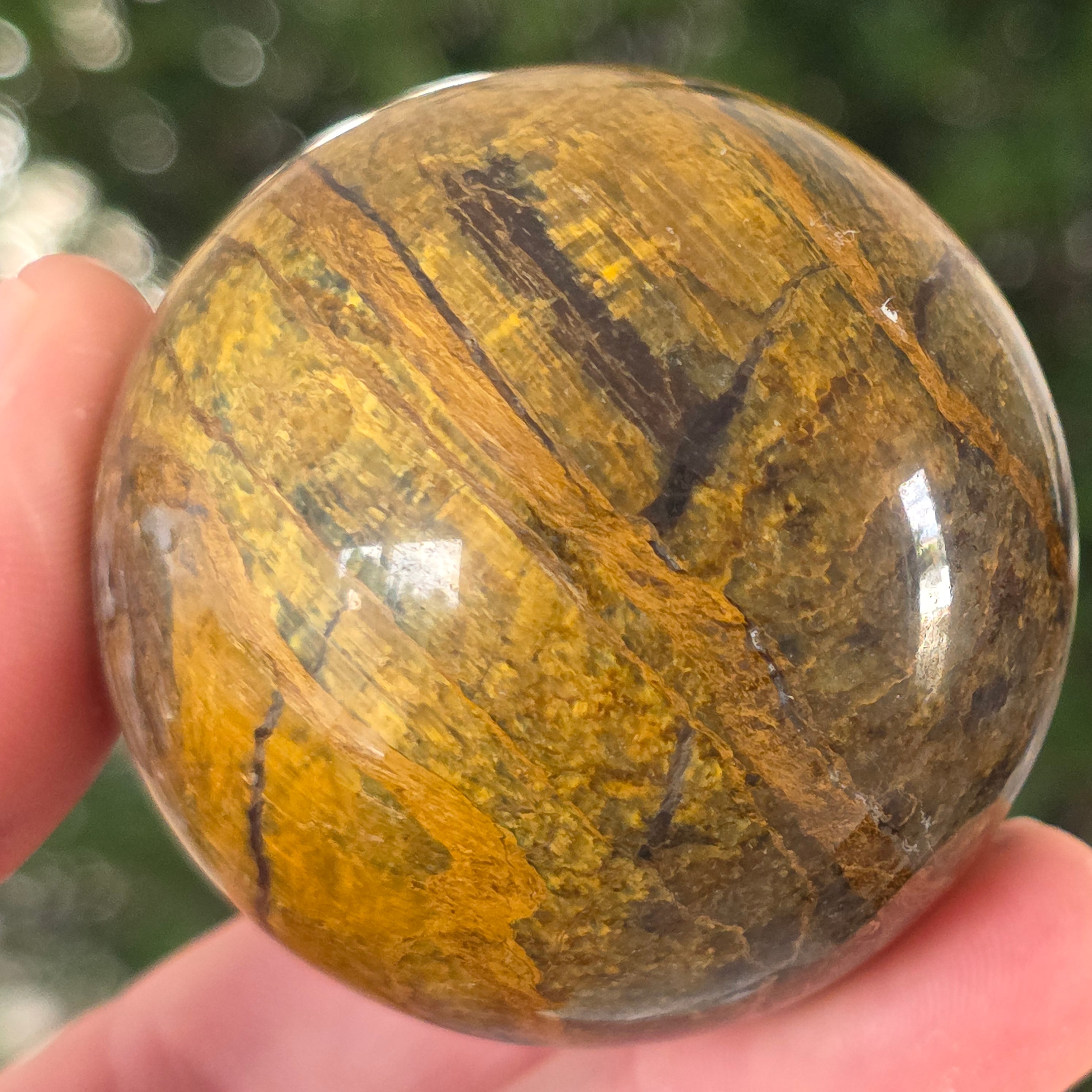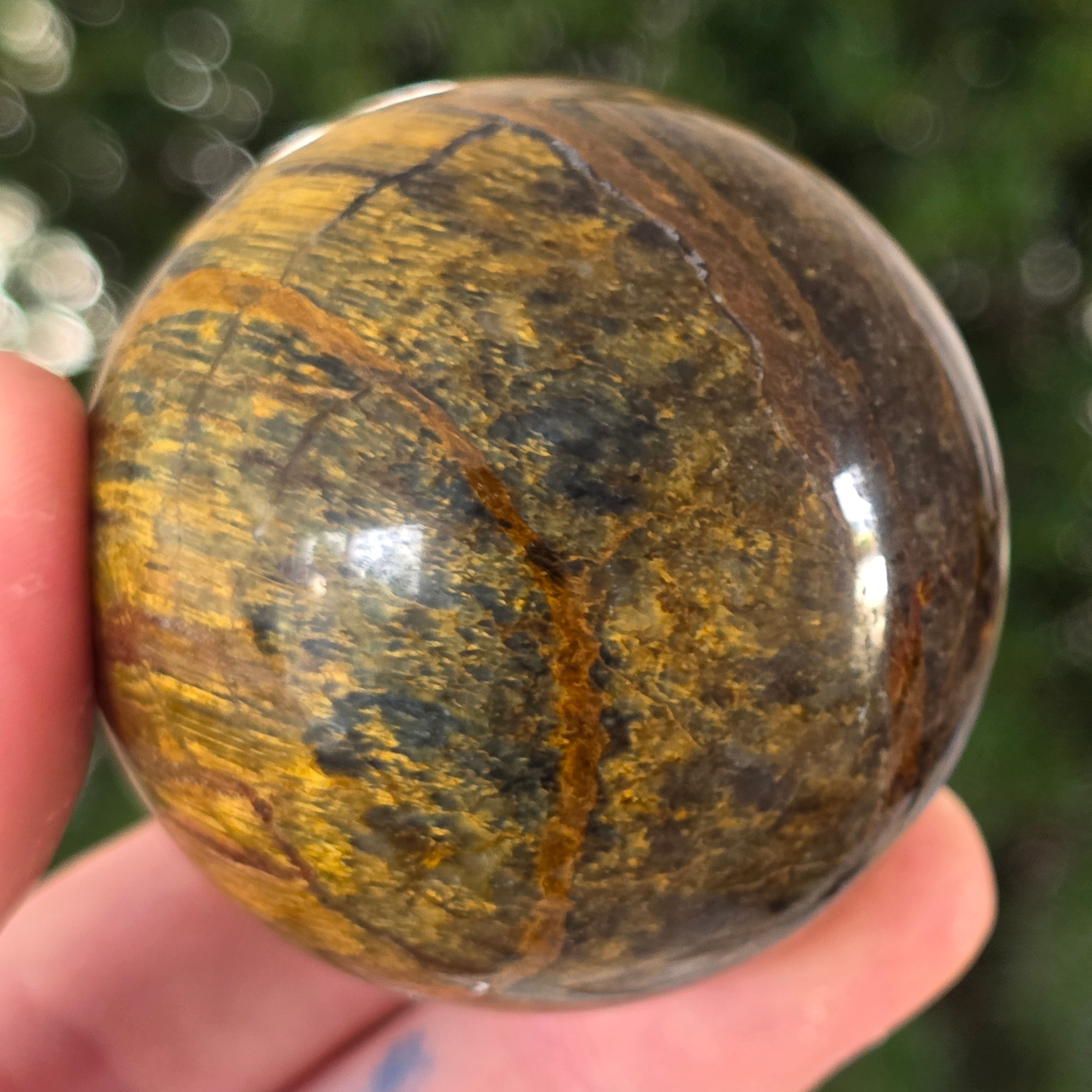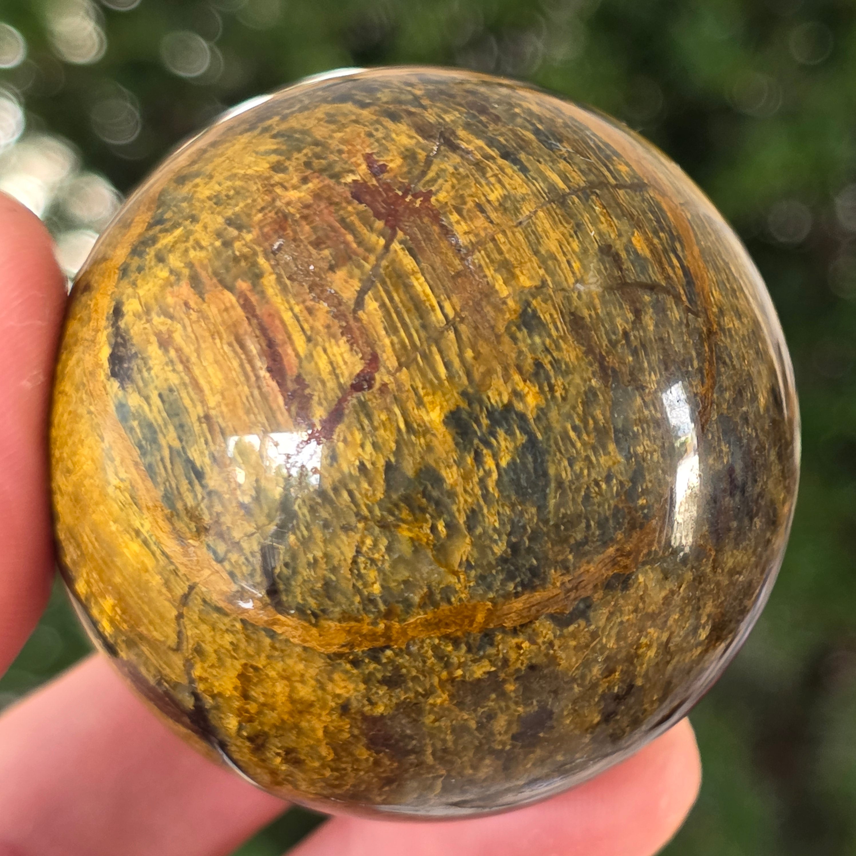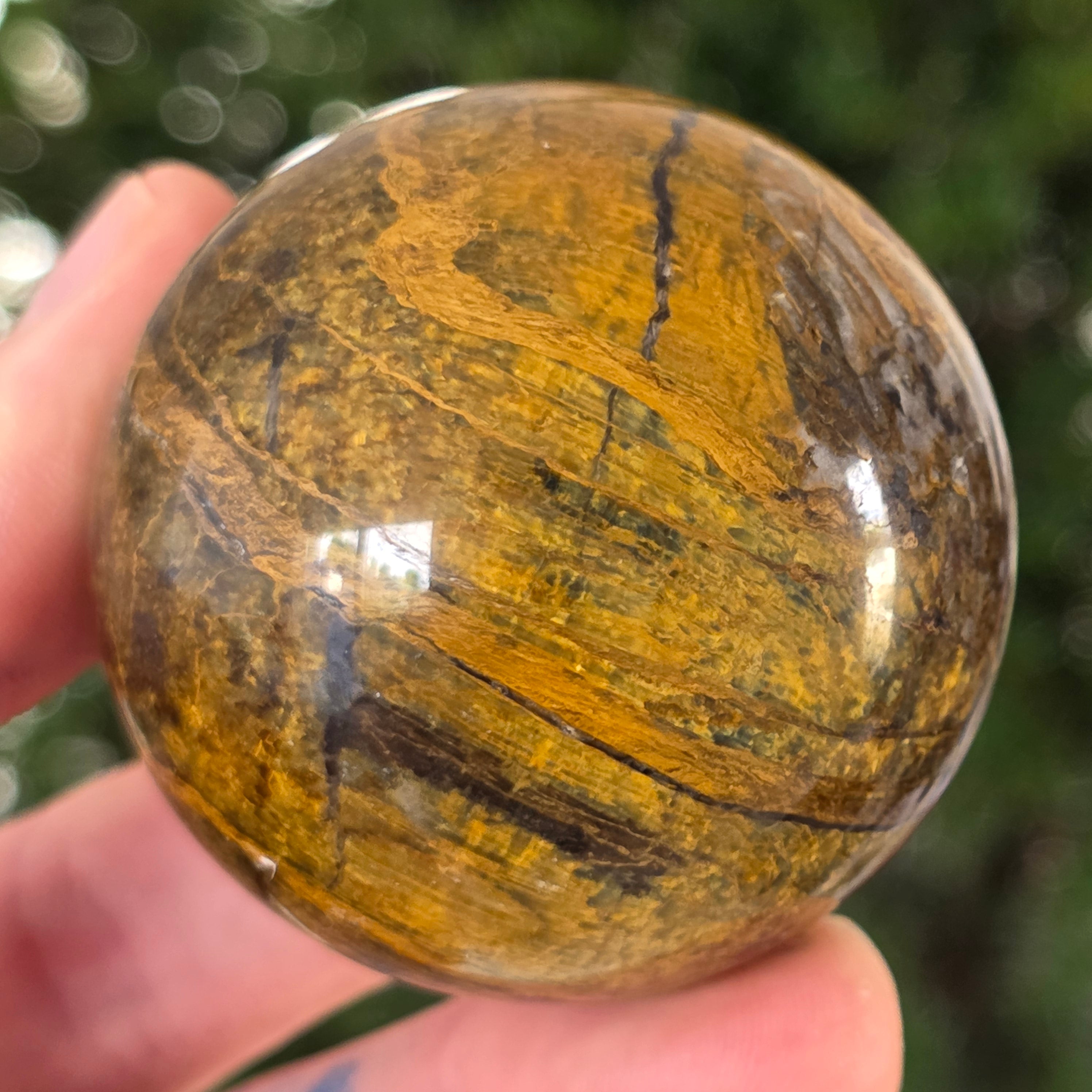 Ez a pietersit gömb olyan, mintha egy kozmikus vihar lenne a kőbe zárva. Kék és arany reflexiói úgy mozognak, mint az időbe dermedt felhők és villámok, állandó mozgás illúzióját keltve.