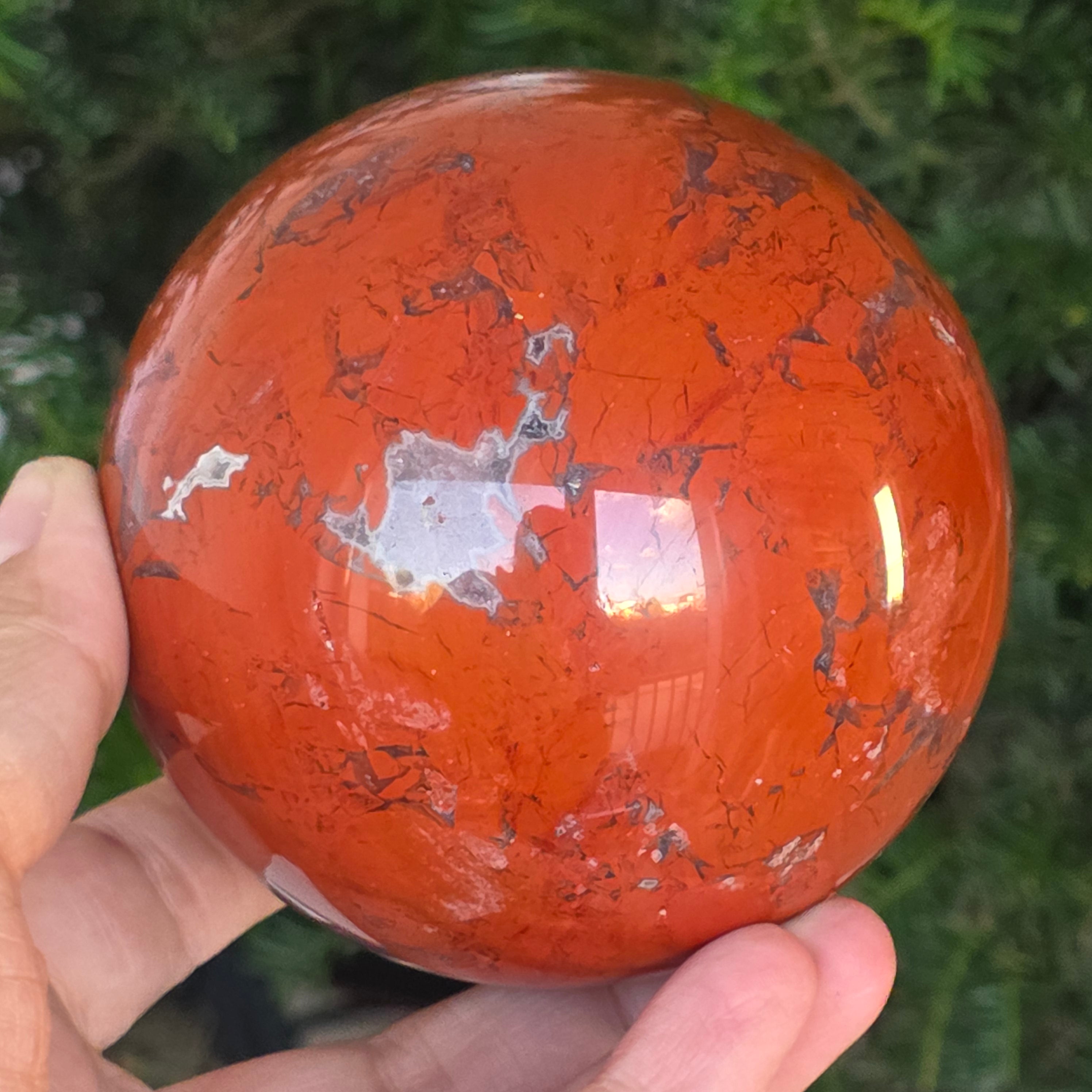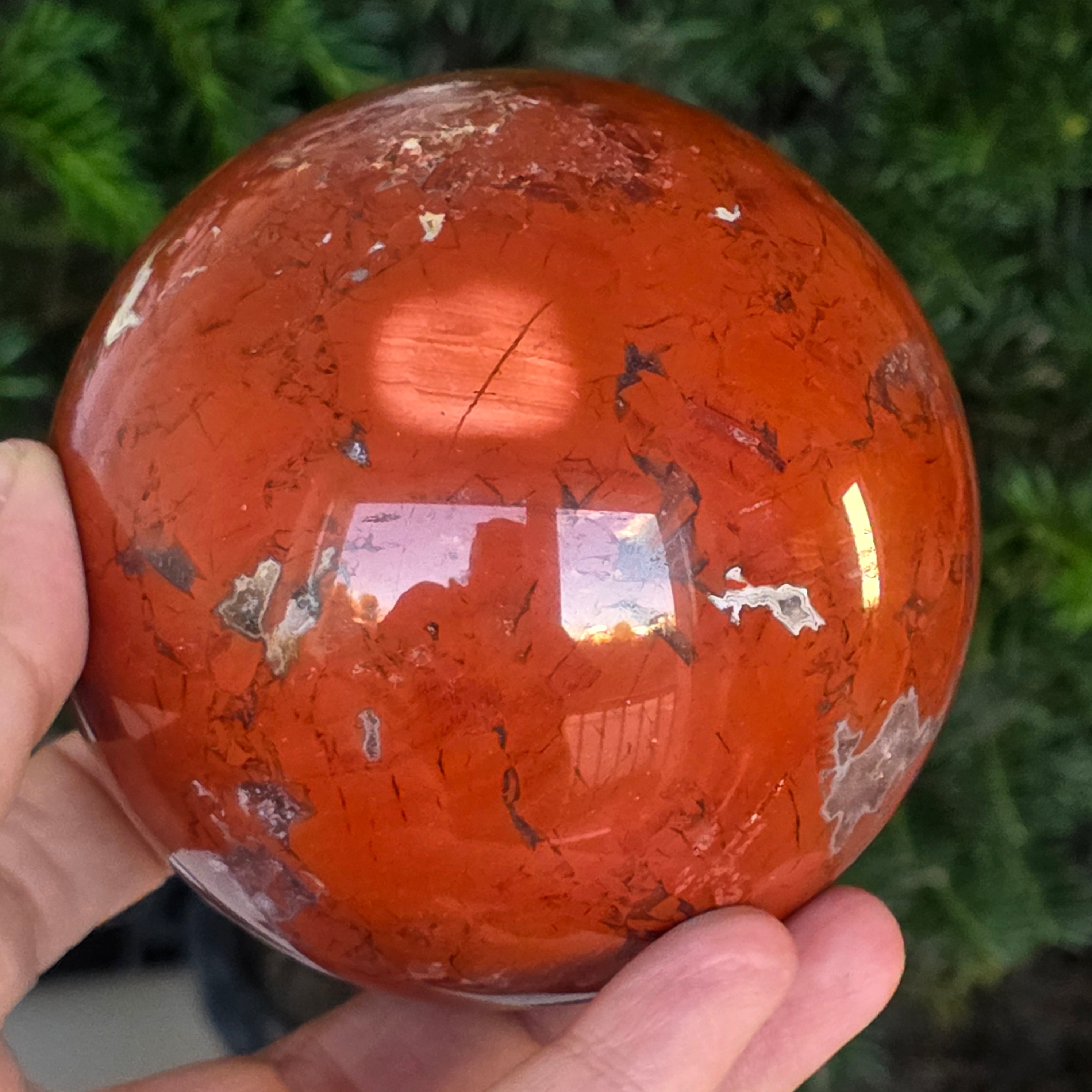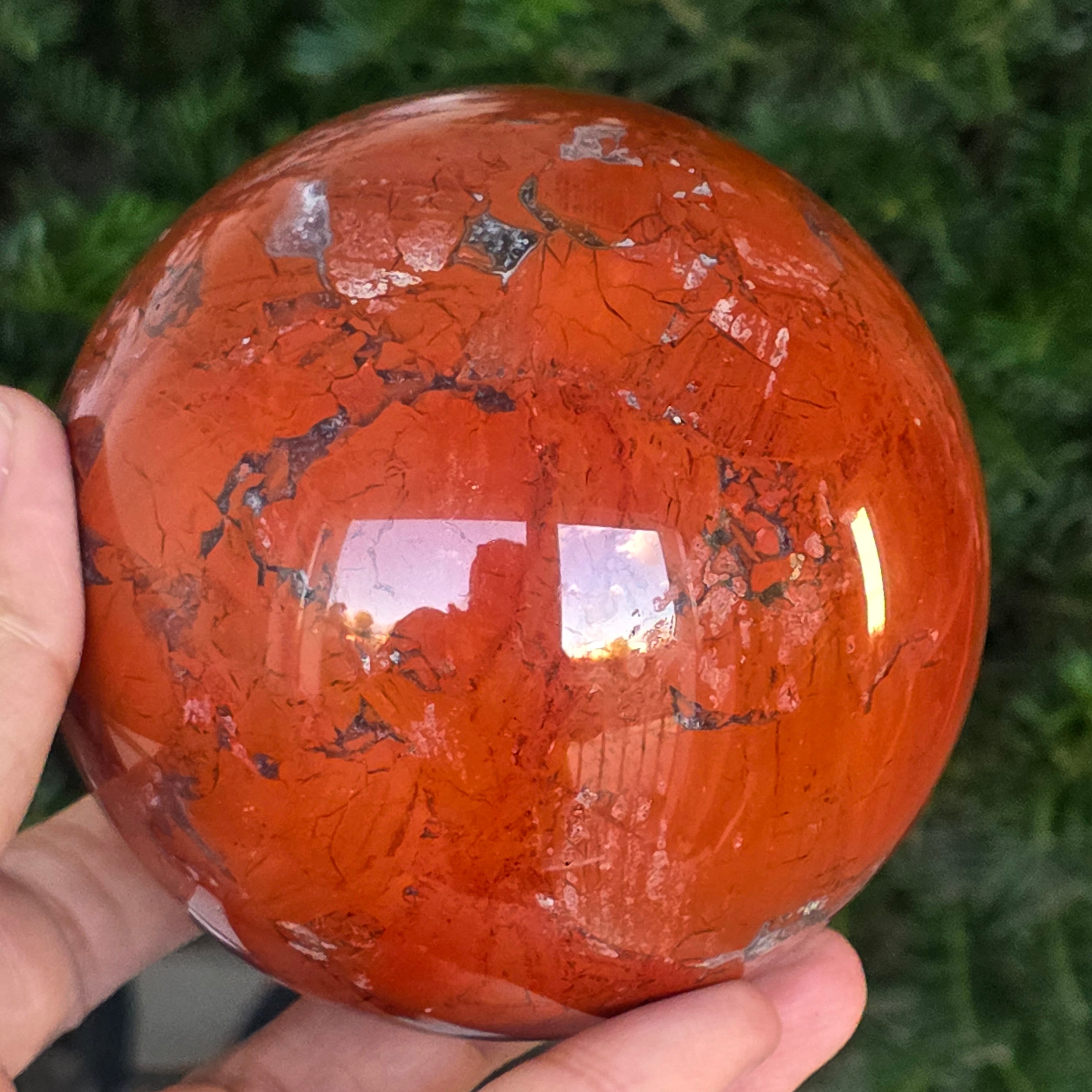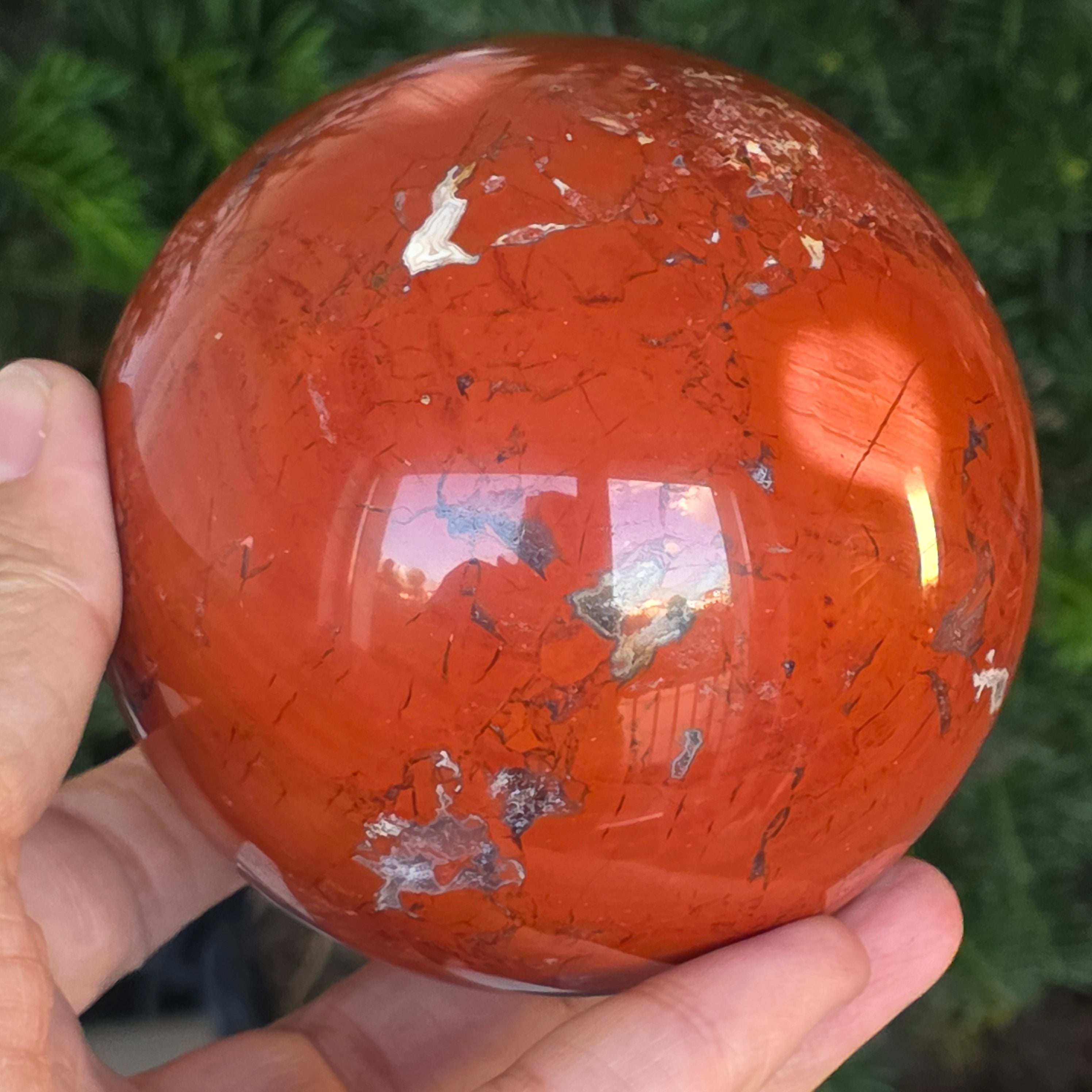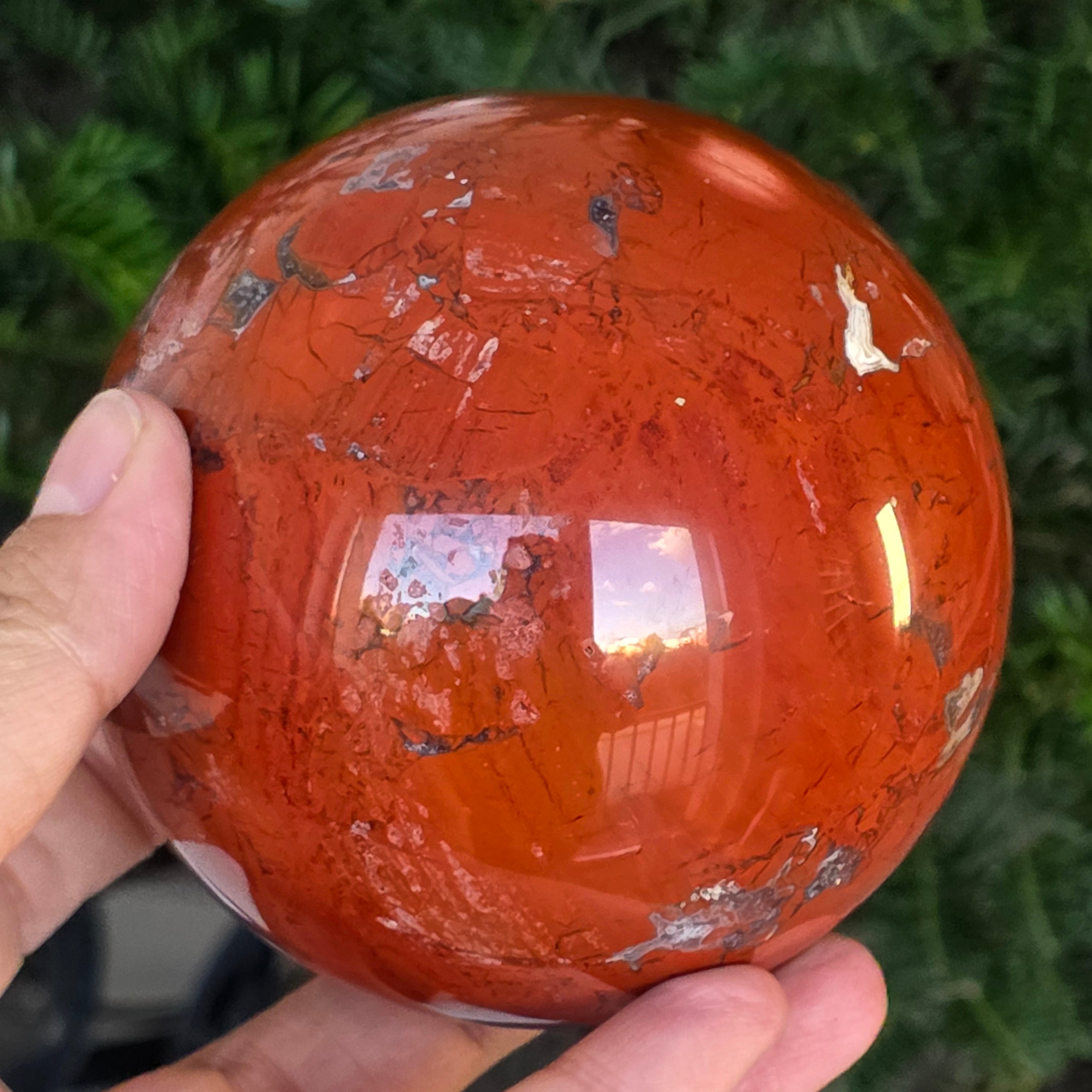 Ez a gömb természetes vörös jáspisból finom, ugyanakkor mély jelenlétet biztosít — állandó emlékeztető a Földhöz való kapcsolatra, a stabilitásra és a saját erő központjában való állás bátorságára.