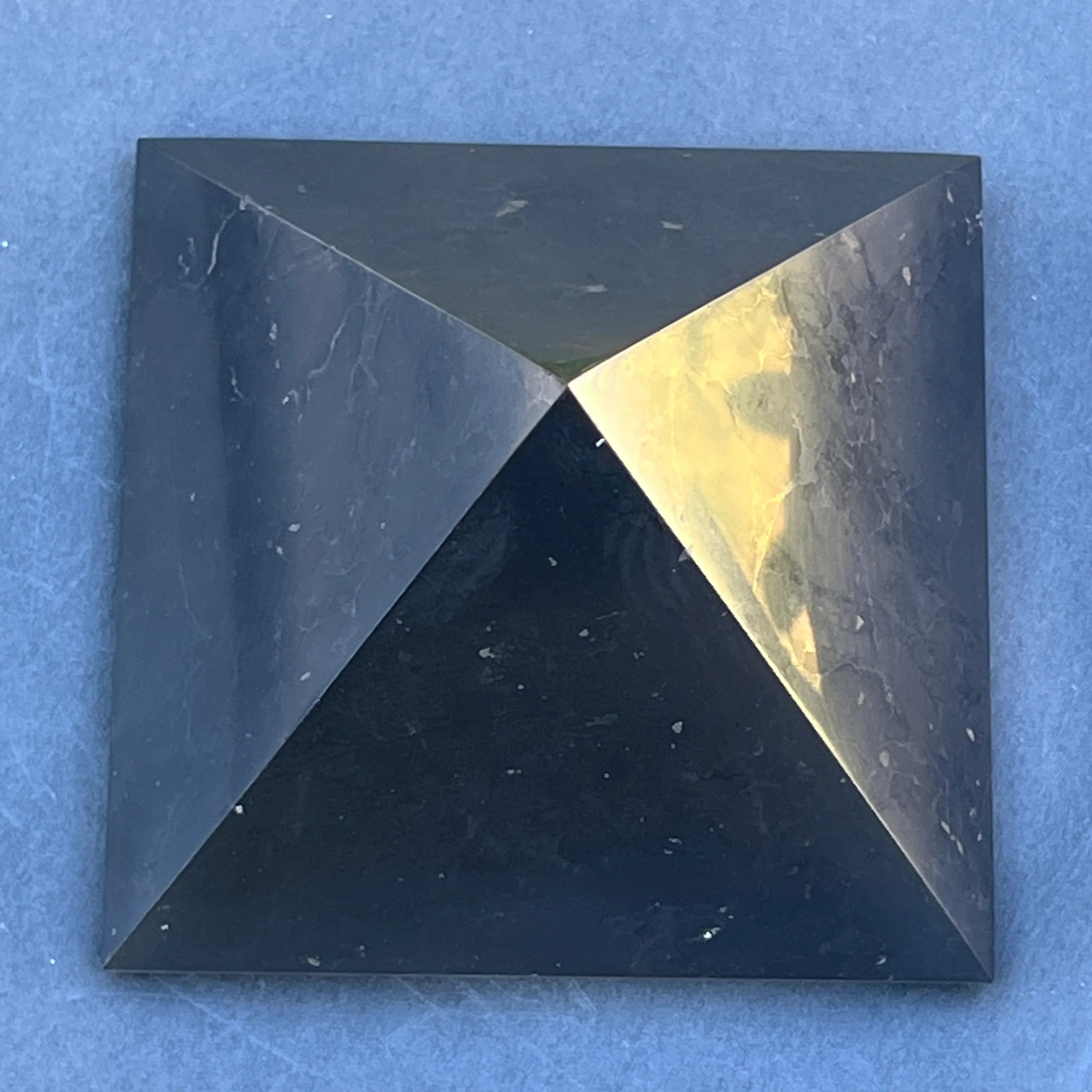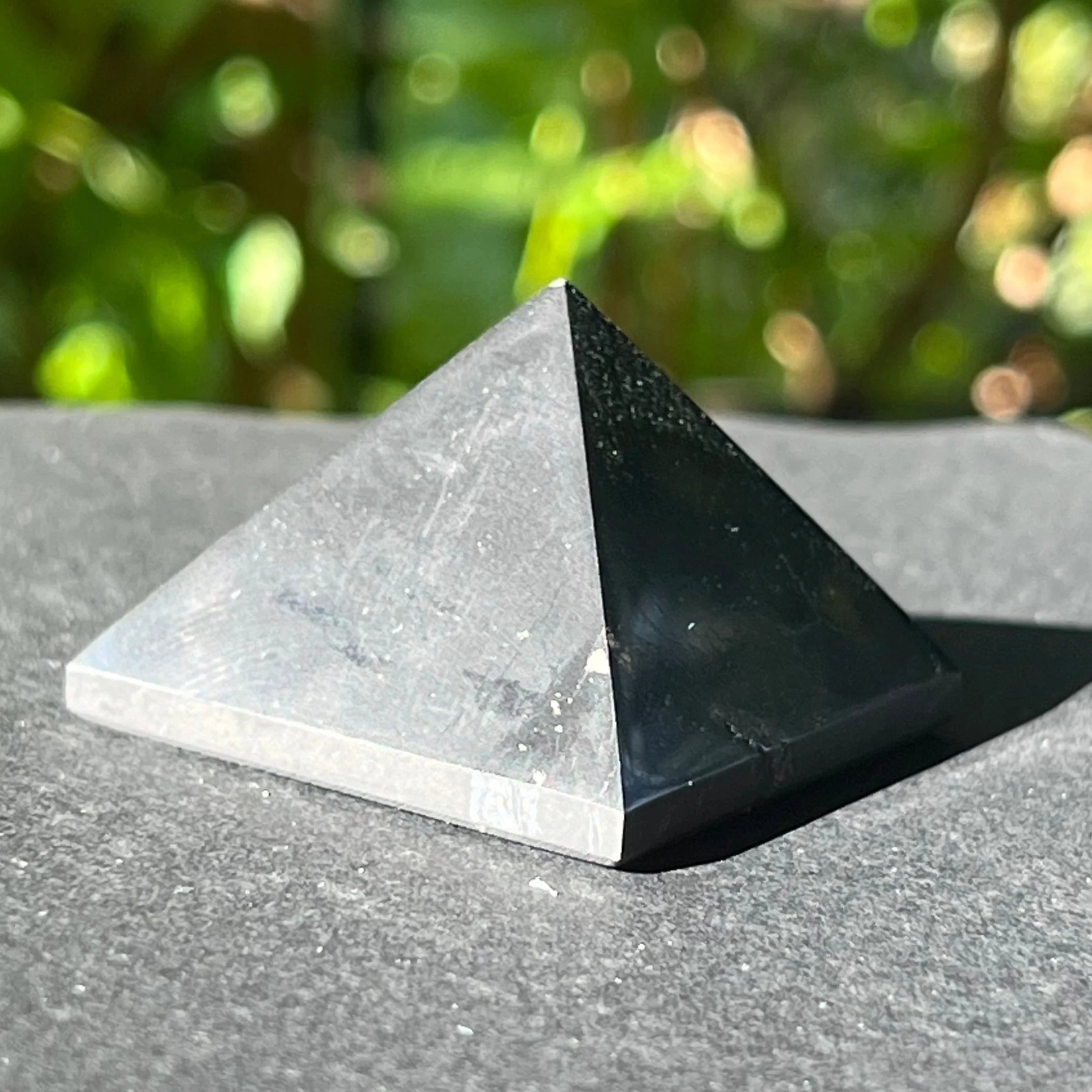 Ez a természetes shungit piramis, 4,3–4,5 cm méretben, egyszerre dekoratív és energetikai célokat szolgáló darab. Geometriai formája, a stabilitás és a föld és az ég közötti kapcsolat szimbóluma, felerősíti a kristály tulajdonságait.