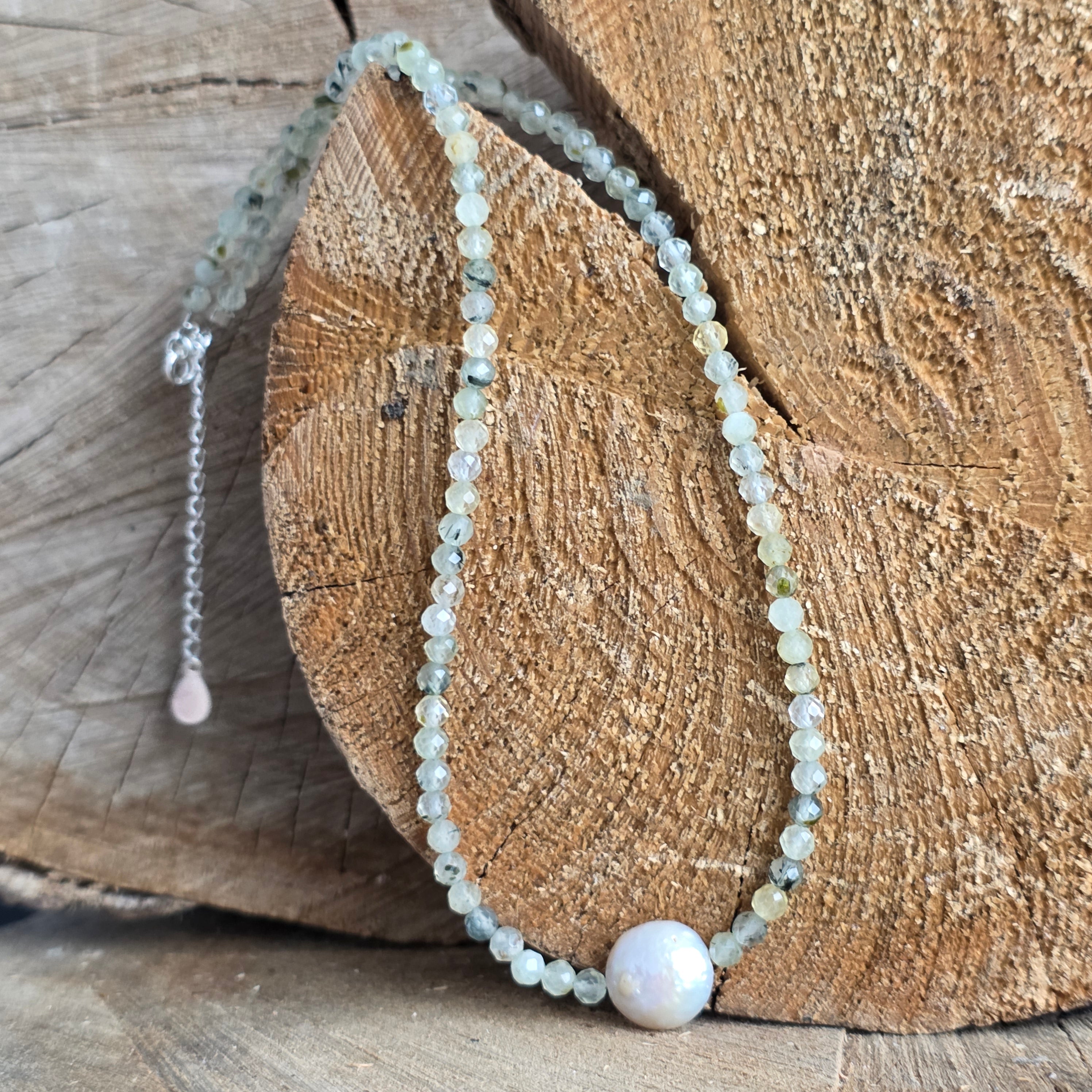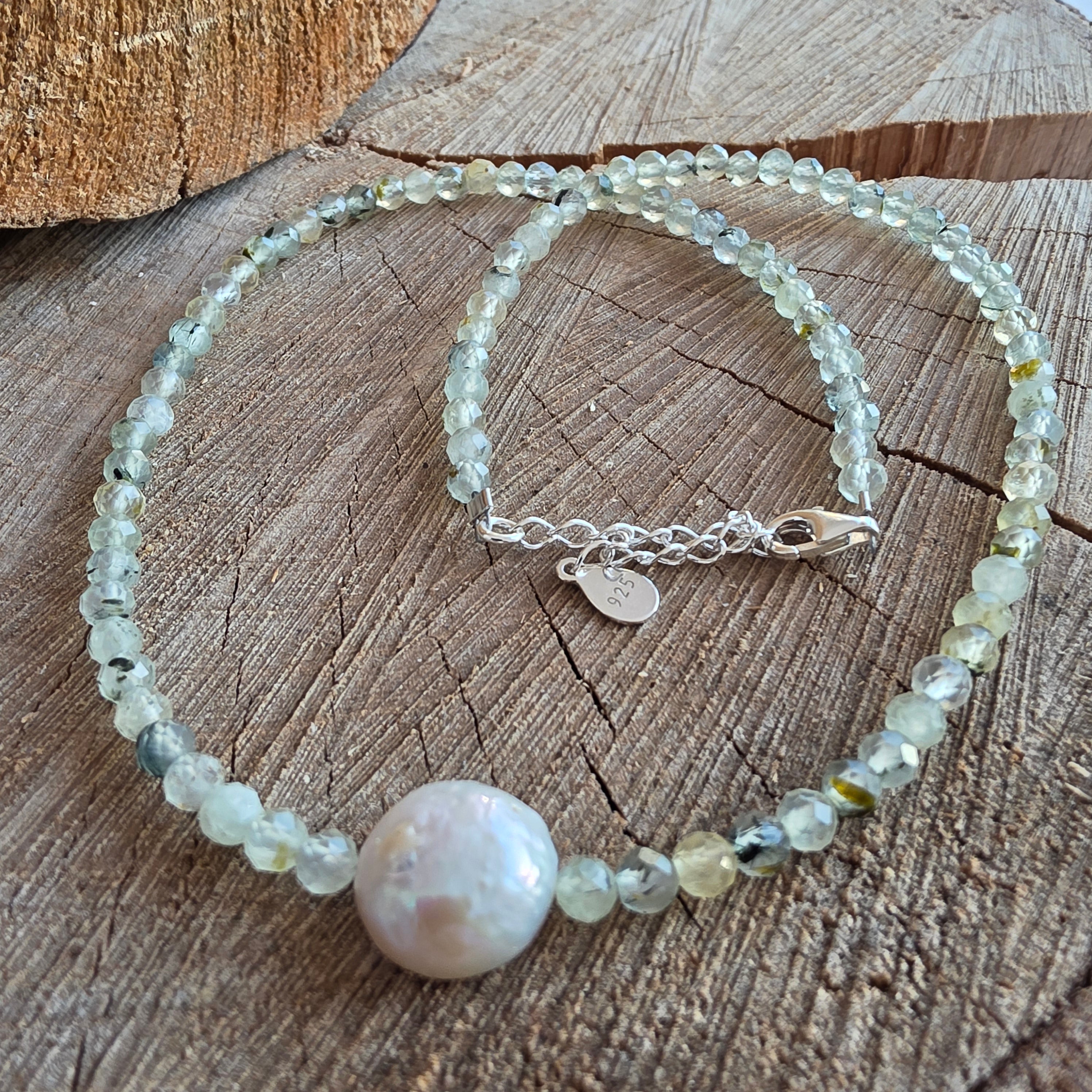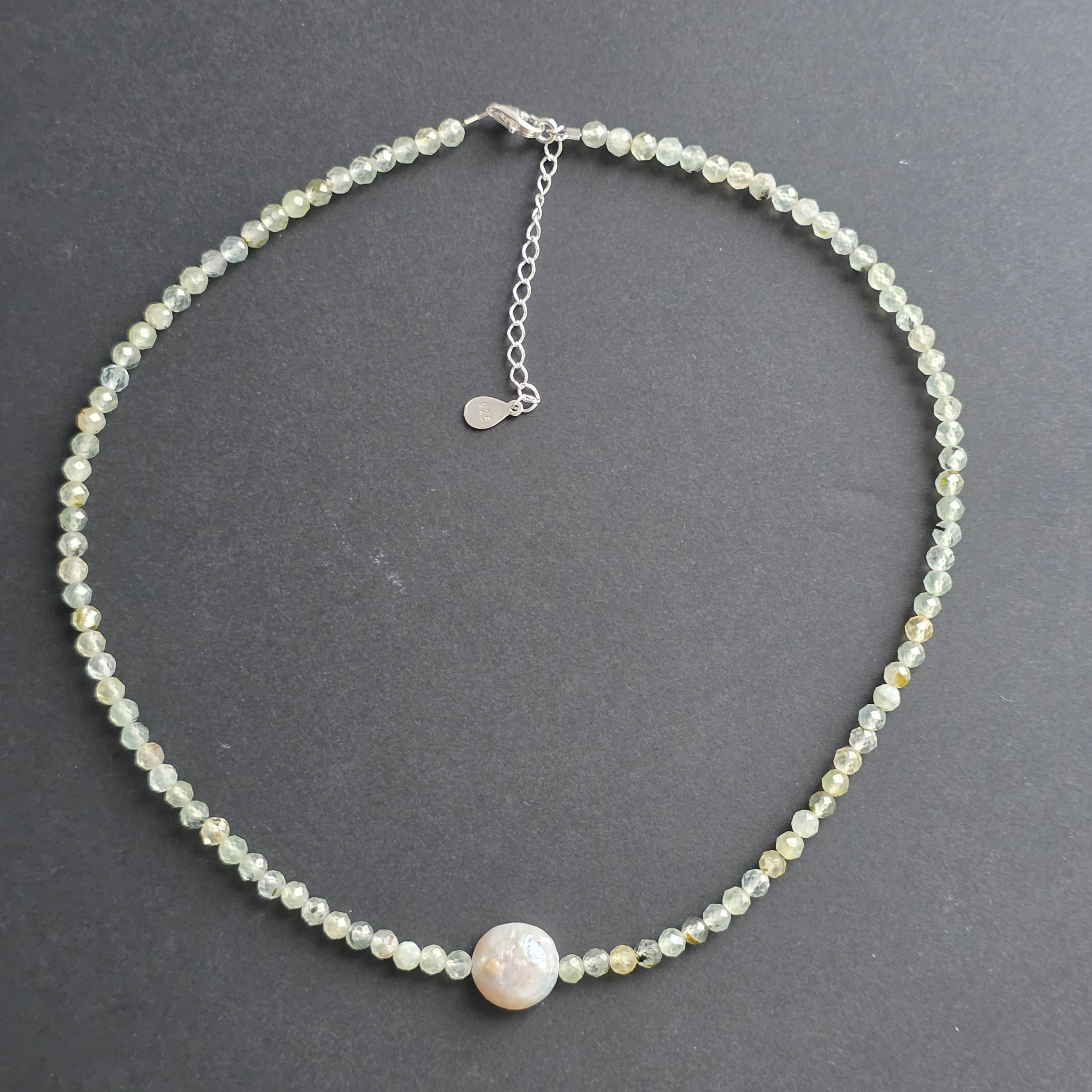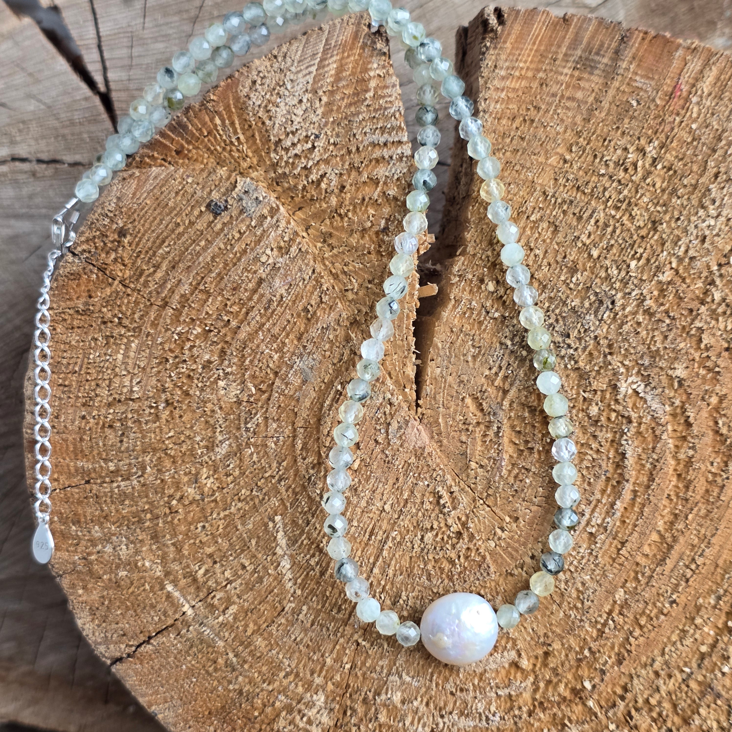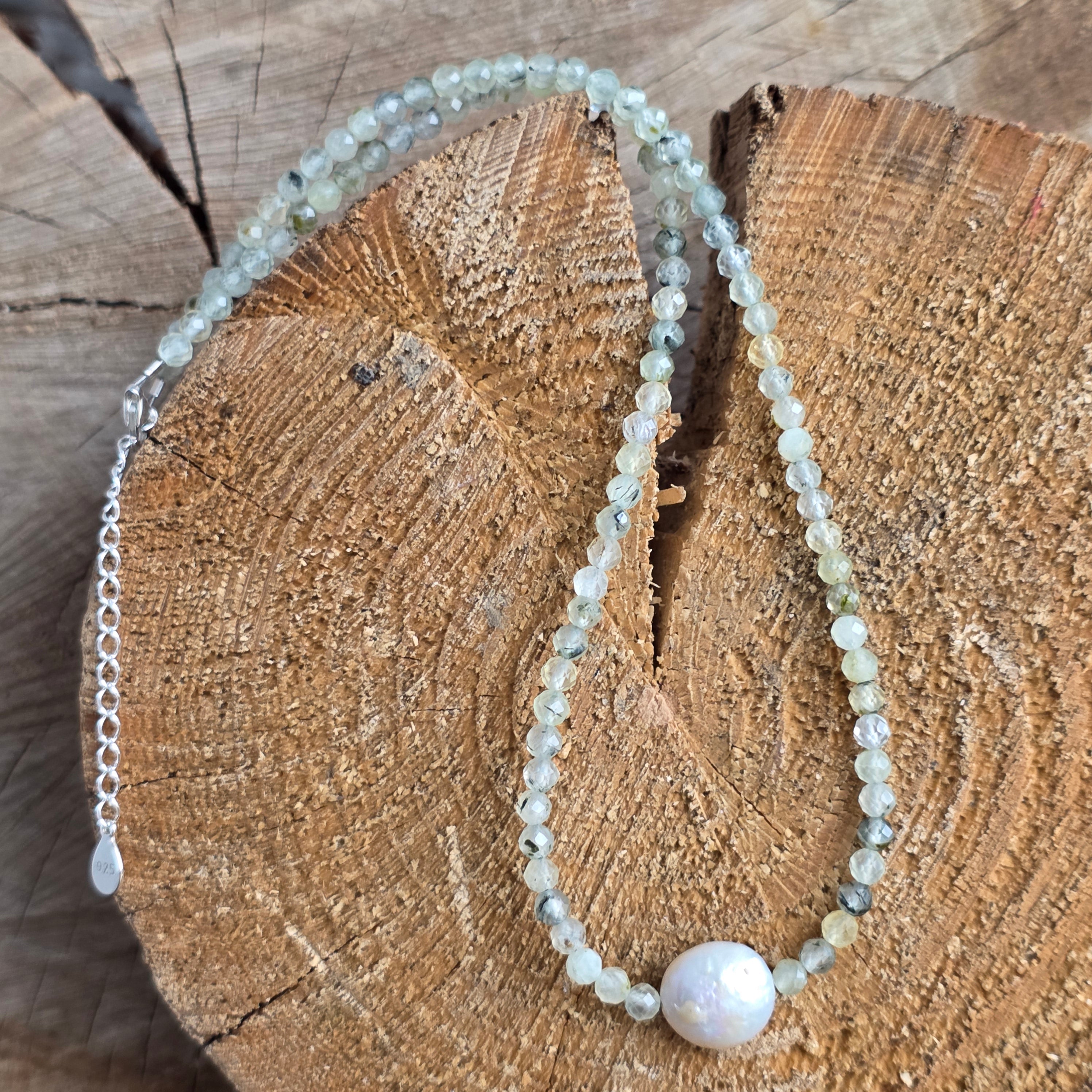 Anyagok: 4 mm-es természetes fazettált prehnit, kb. 1 cm-es hangsúlyos természetes gyöngy, 925-ös ezüst
