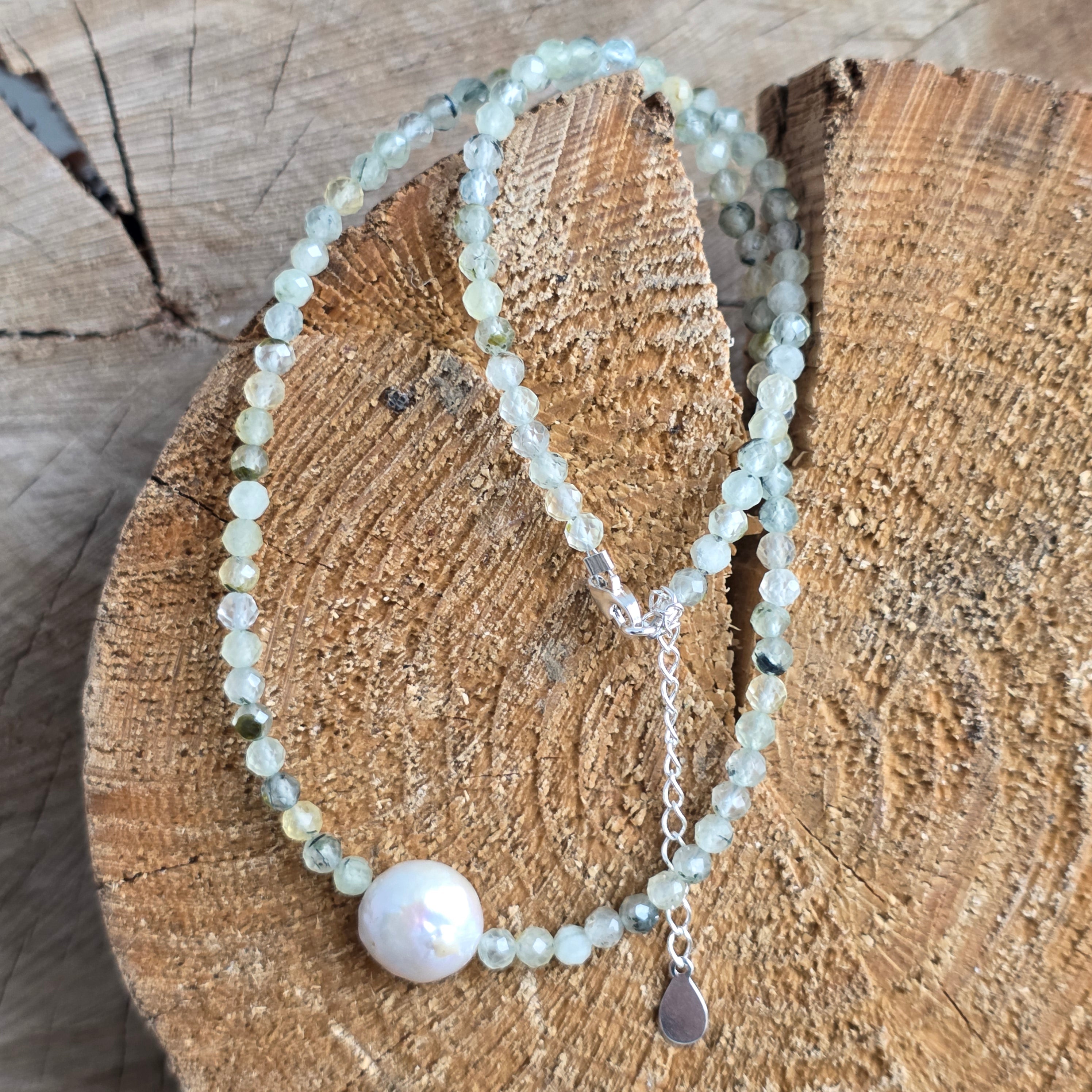A gyöngy kiegészíti ezt az energiát ősi tisztaság-, nőiesség- és tapasztalaton alapuló bölcsesség szimbólumával. Együtt a prehnit és a gyöngy egy olyan finom ékszert hoznak létre, amely az egyensúlyról, a gyengédségről és a természetes eleganciáról mesél.