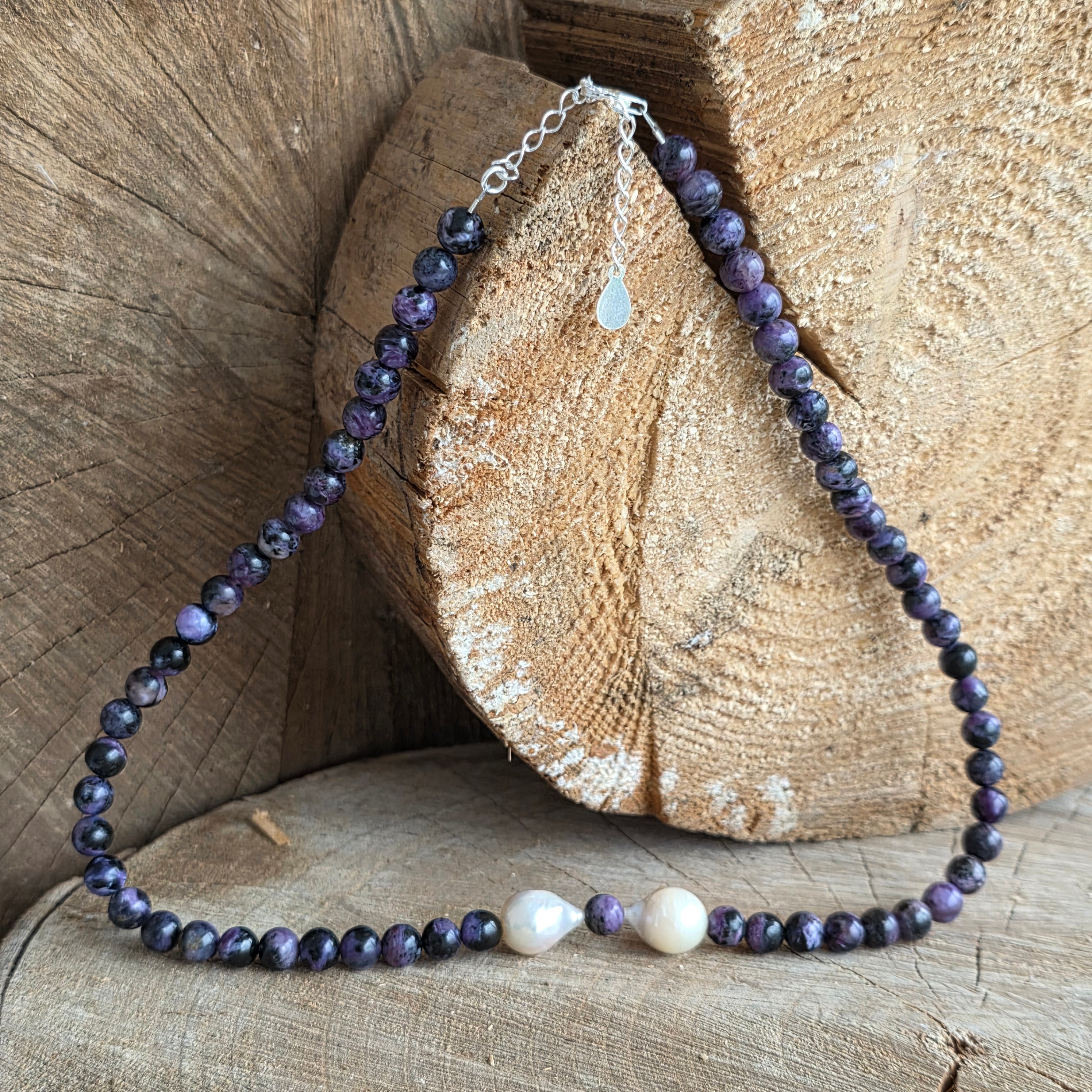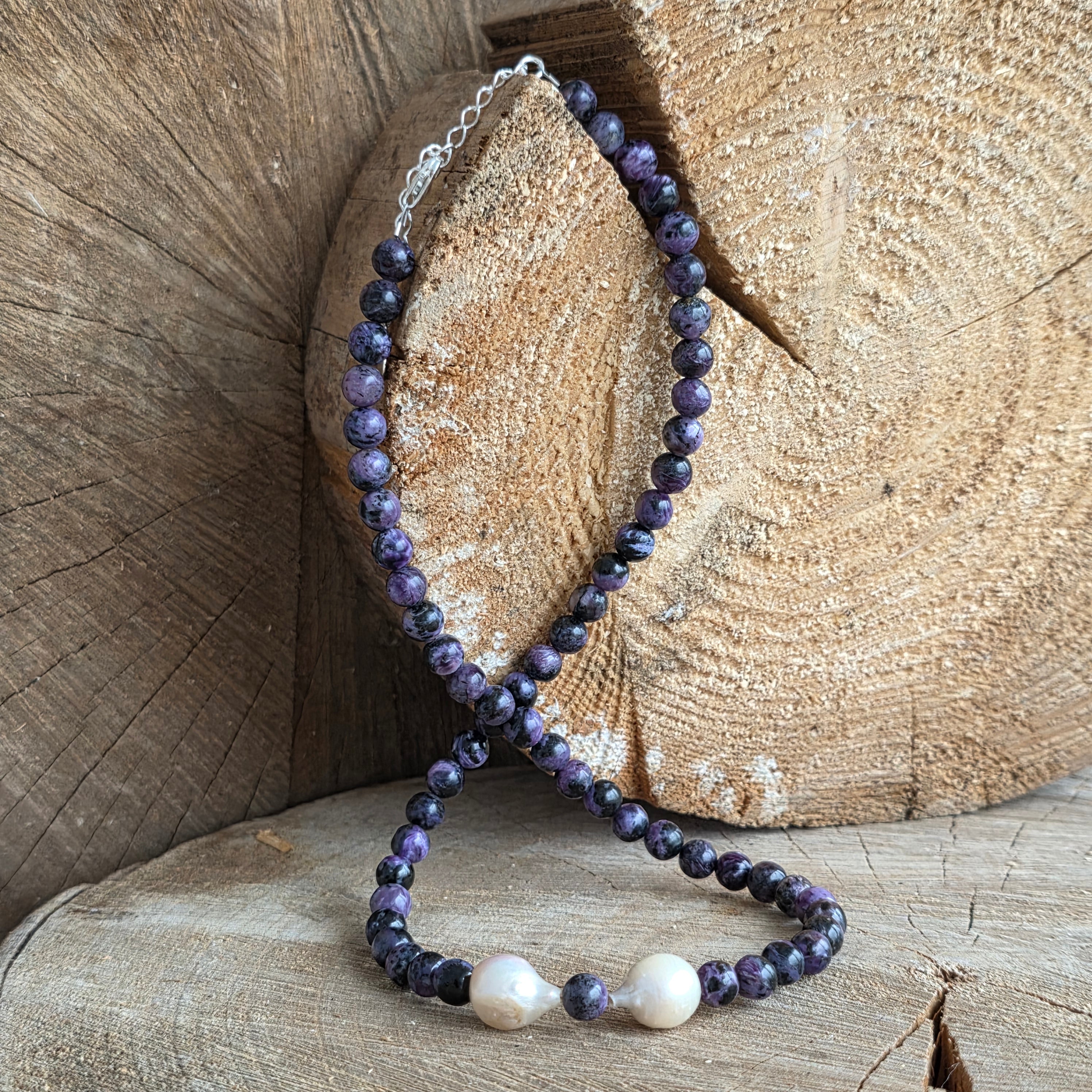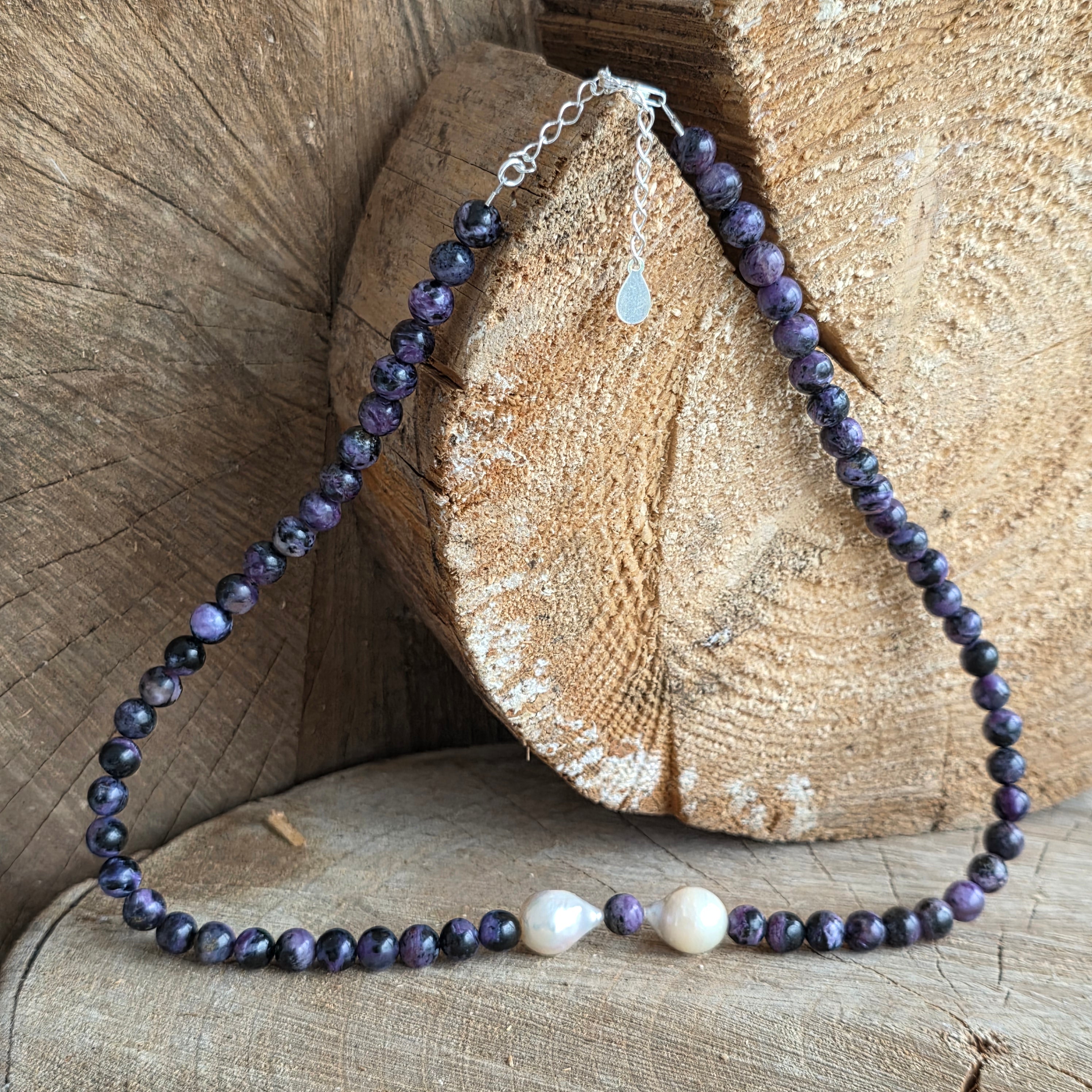 Nyaklánc nyugodt és mély jelenléttel, s6 mm-es charoite vasak, melynek lila, ibolya és tejfehér árnyalatai mintha belső tájként folynának egymásba. Minden kő egyedi dizájnt visel, mint az átalakulás és a mély megértés lenyomata.
