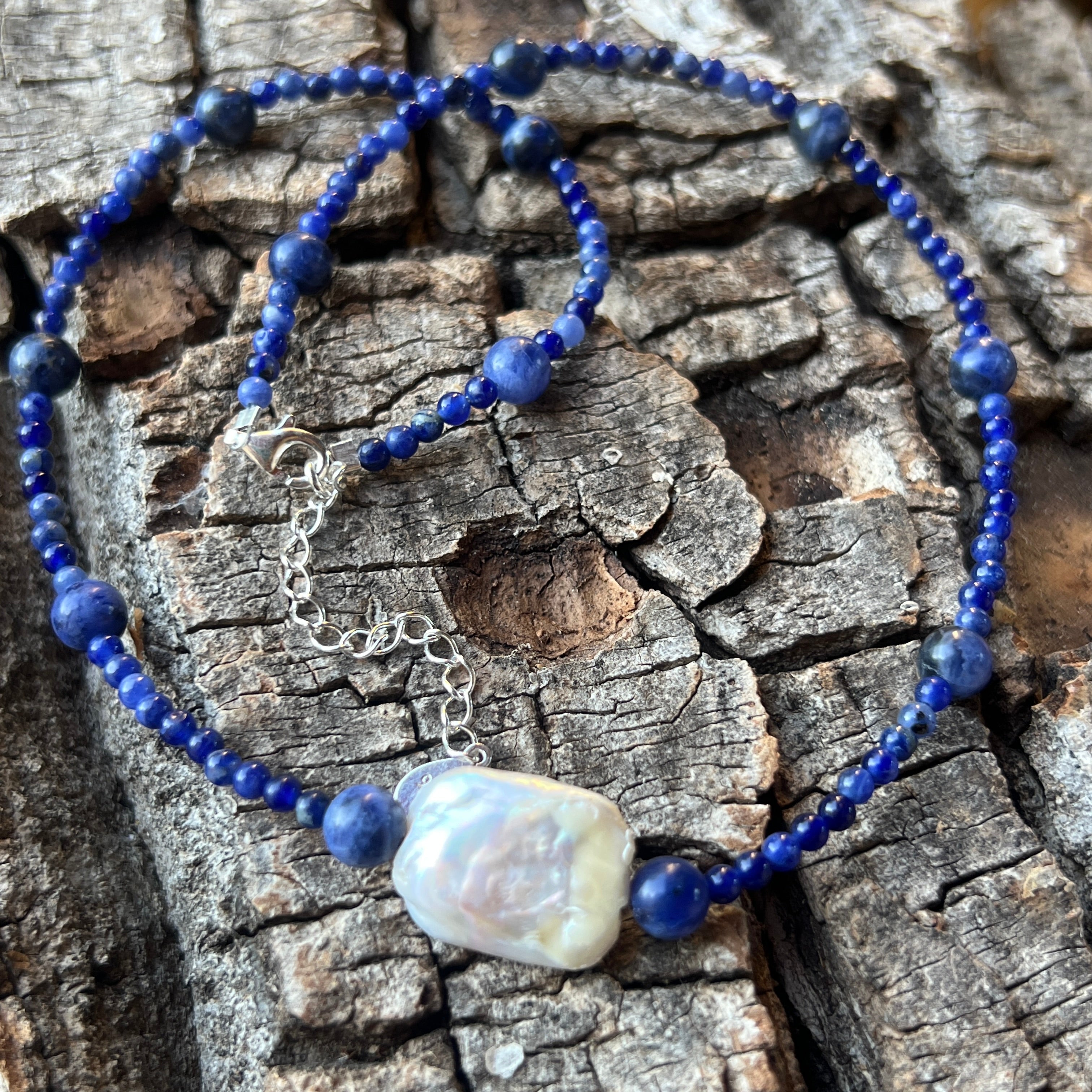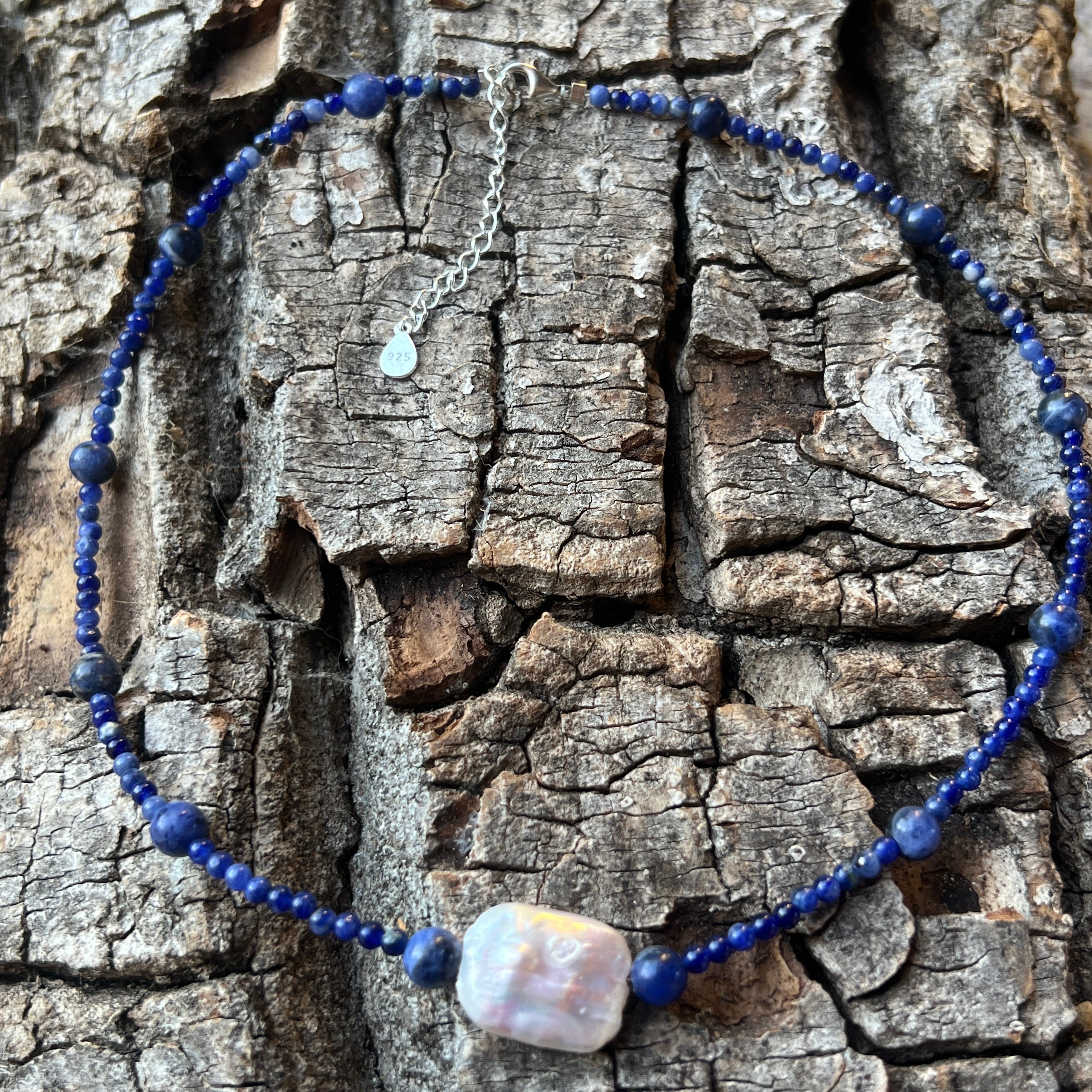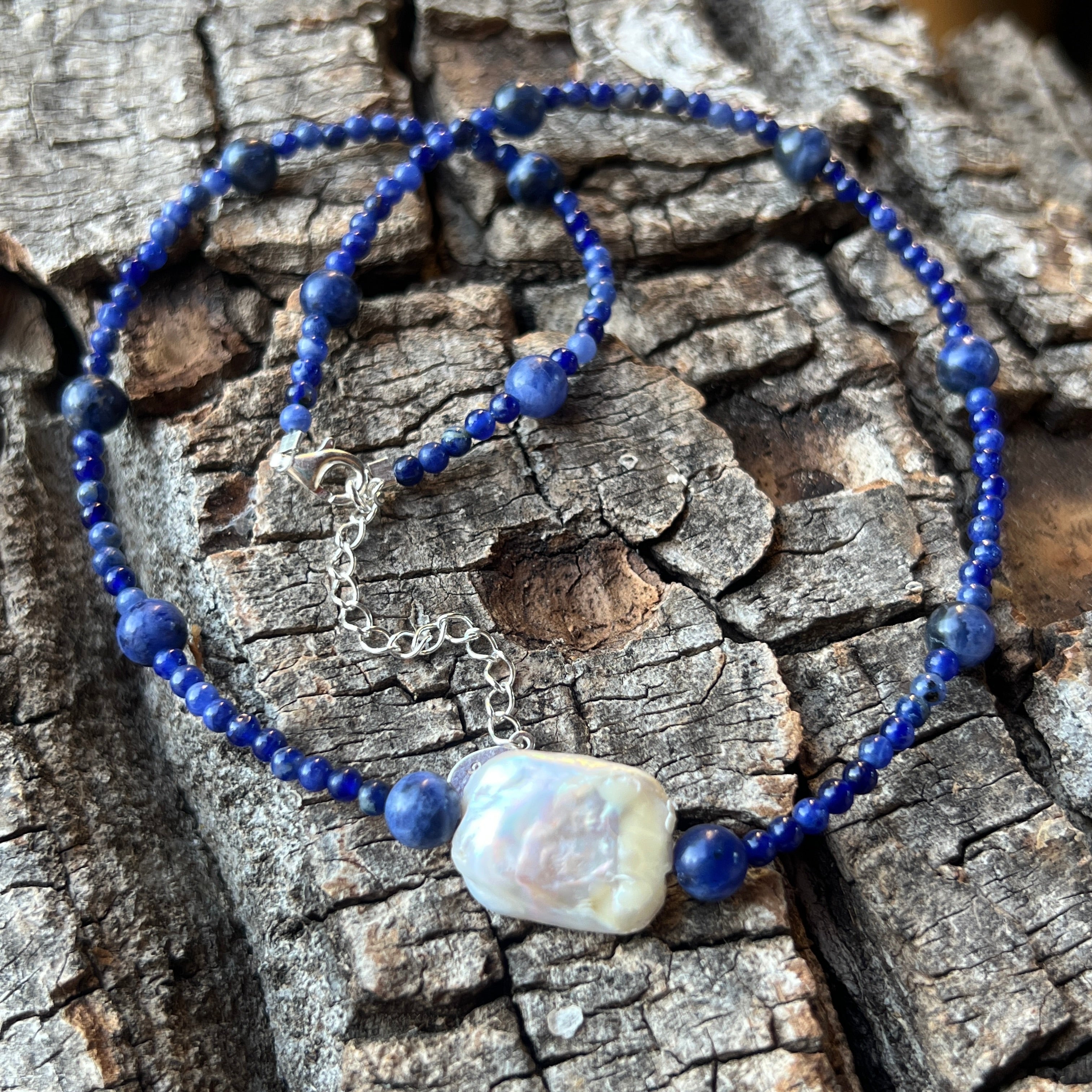 A 3 mm-es finom szodalit gyöngyök egy finom szálra vannak fűzve, intenzív kék árnyalatokban, fehér erezettel, mint darabkái az égnek a felhők között. A nyaklánc mentén szórtan, halk ritmusban 6 mm-es szodalit gyöngyökis találhatók, amelyek mélységet adnak a tiszta gondolatok nyugalmához.