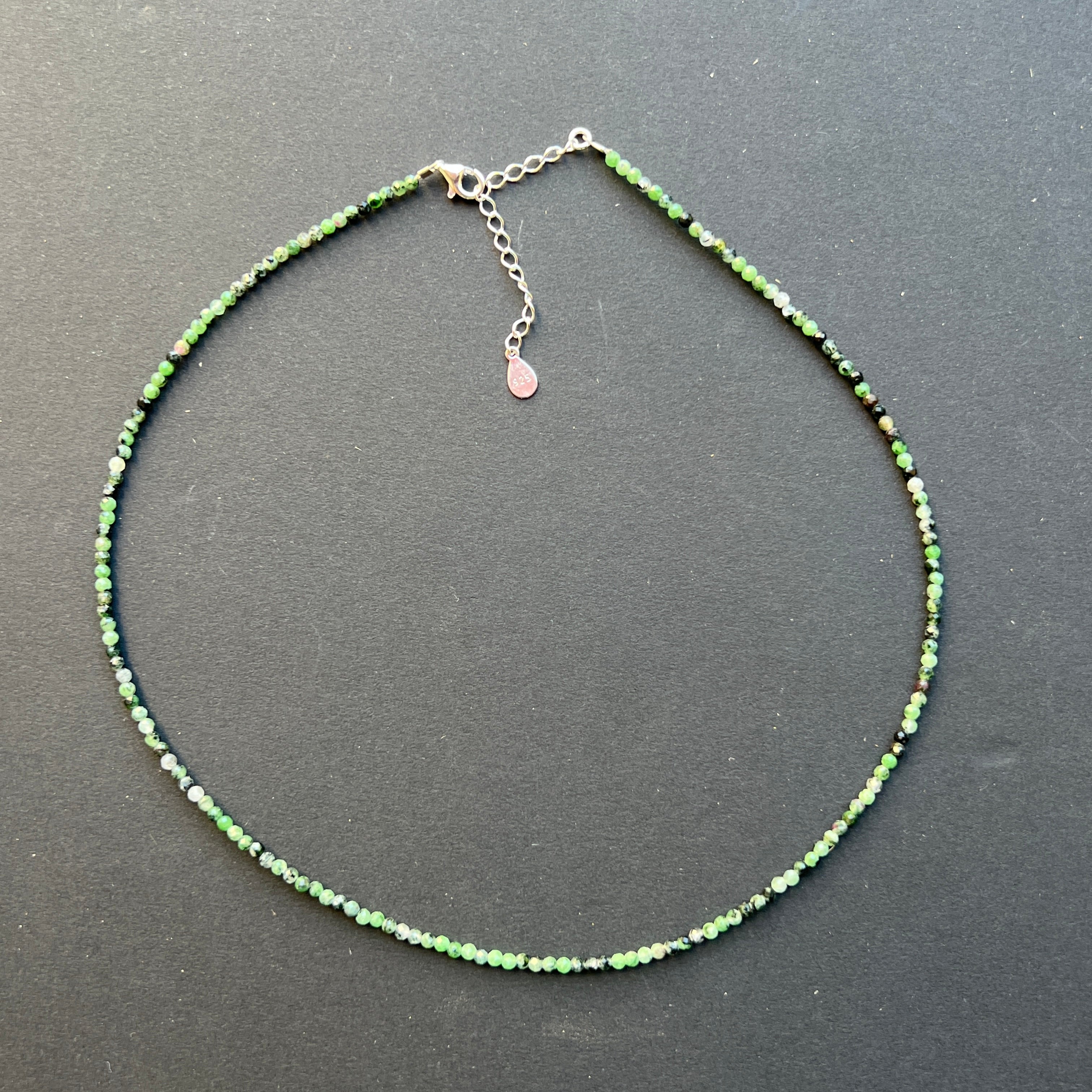Egy ékszer, amely élénk zöld árnyalatokban és sötét tónusokban susog – mint egy titkos kert, amelyet az idő érintetlenül hagyott. Ez a finom, természetes zoizitból készült nyaklánc, 2,5 mm átmérőjű csiszolt gyöngyökből áll, kecsesen a nyak alapjához simul, akár egy titok szála, amely finoman körülölel.