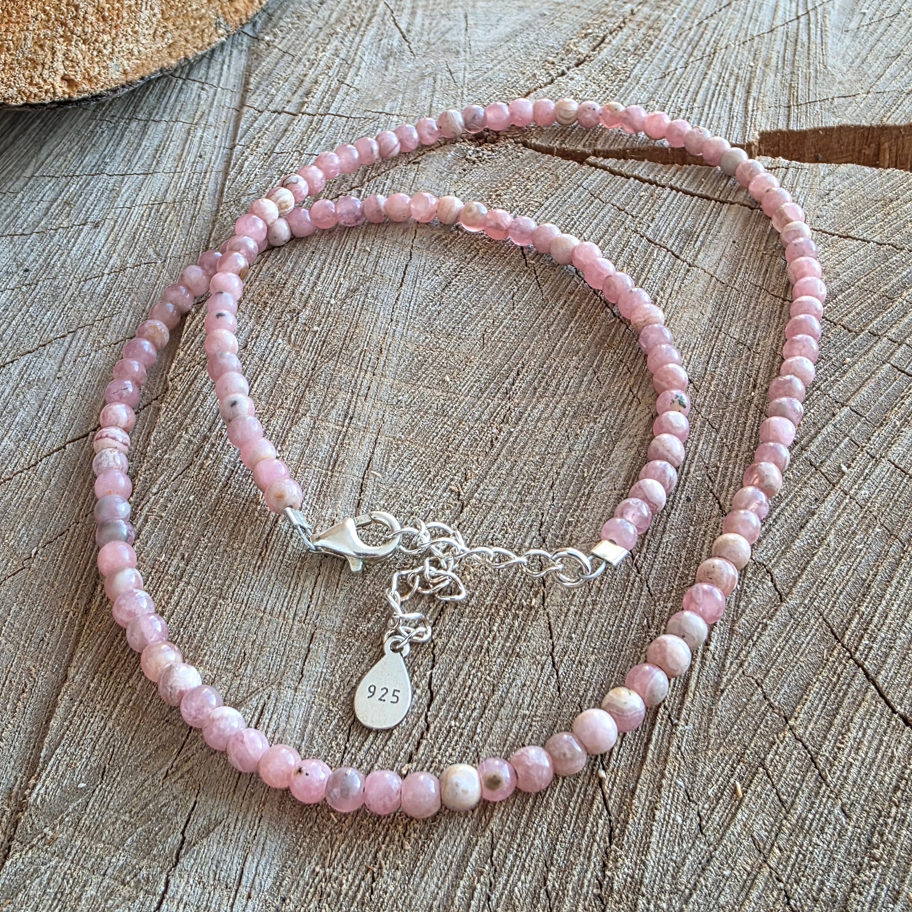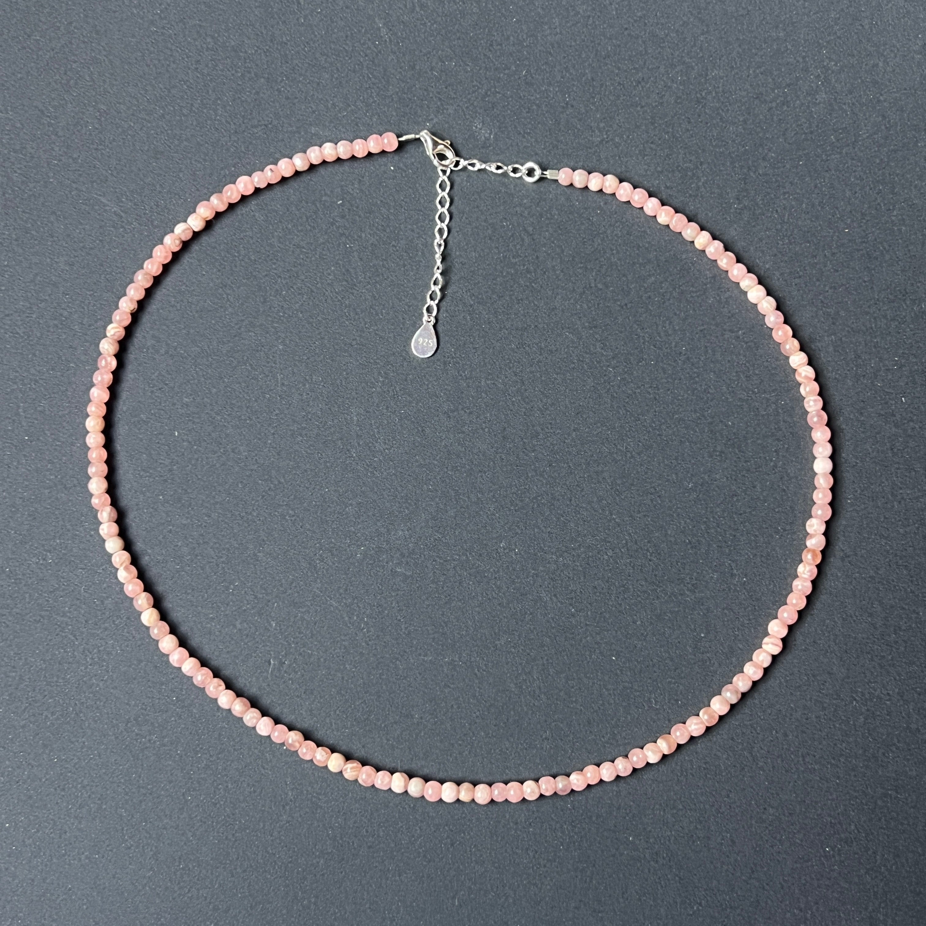 Anyagok: Természetes rodokrozit (4 mm-es golyók), 925-ös ezüst lánc és kapocs