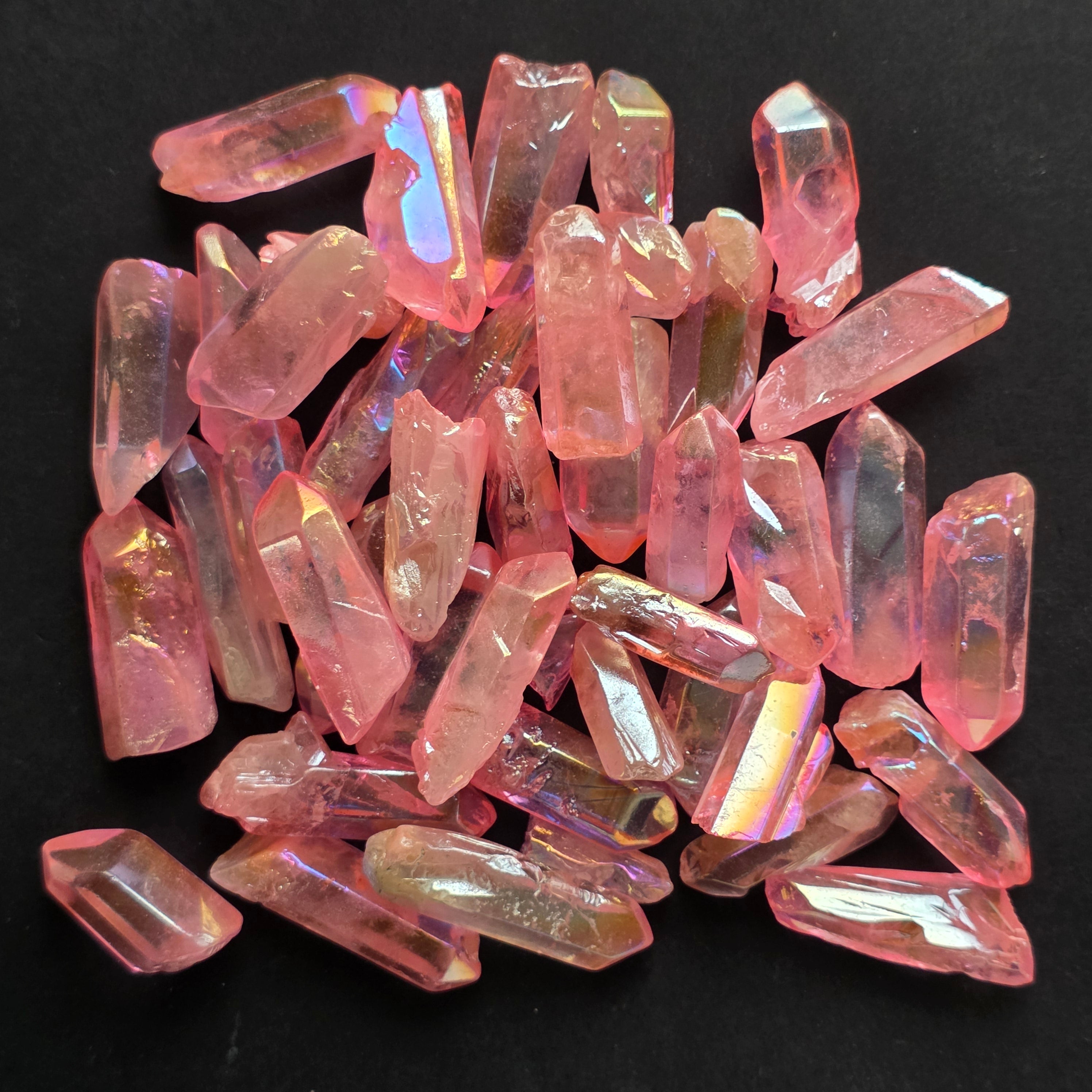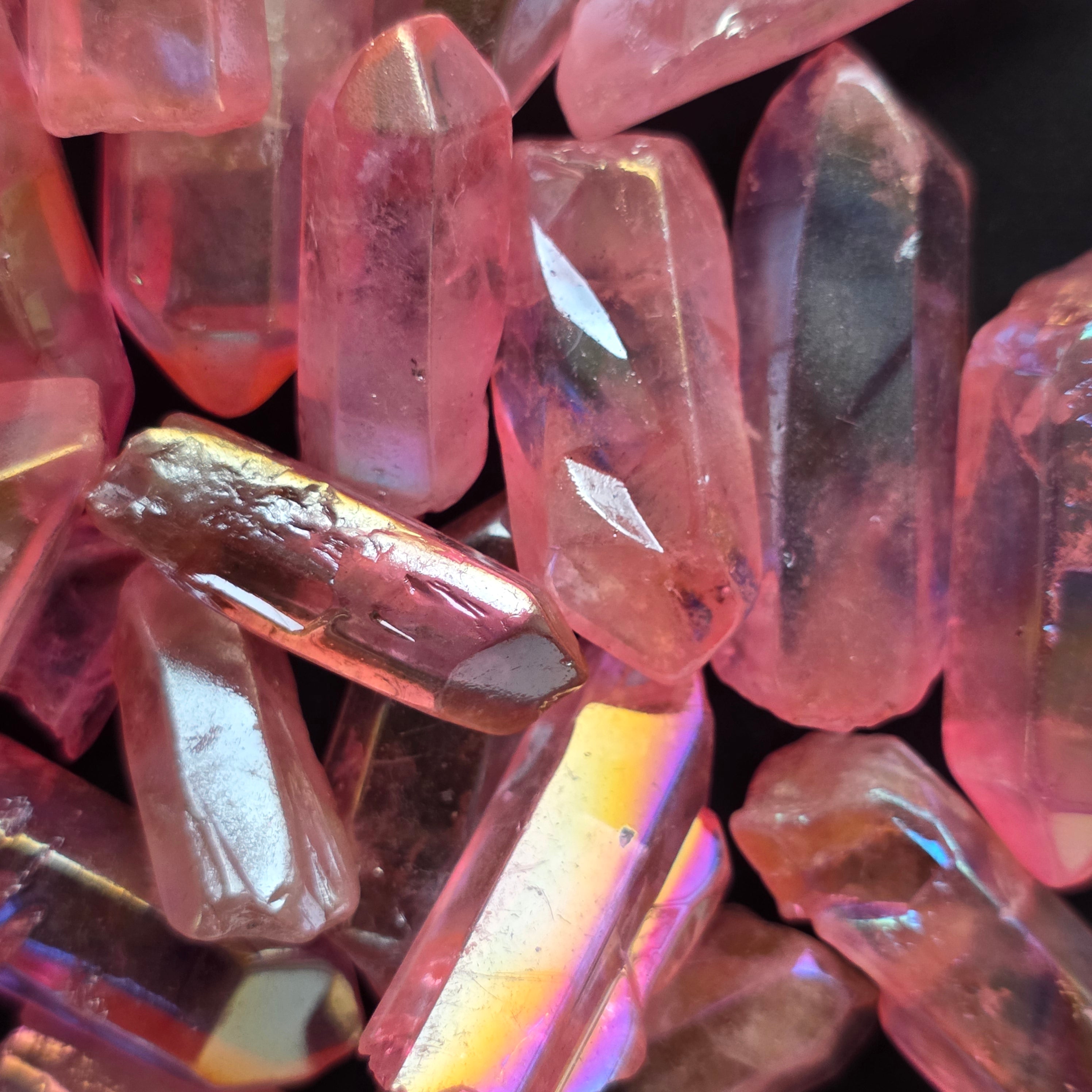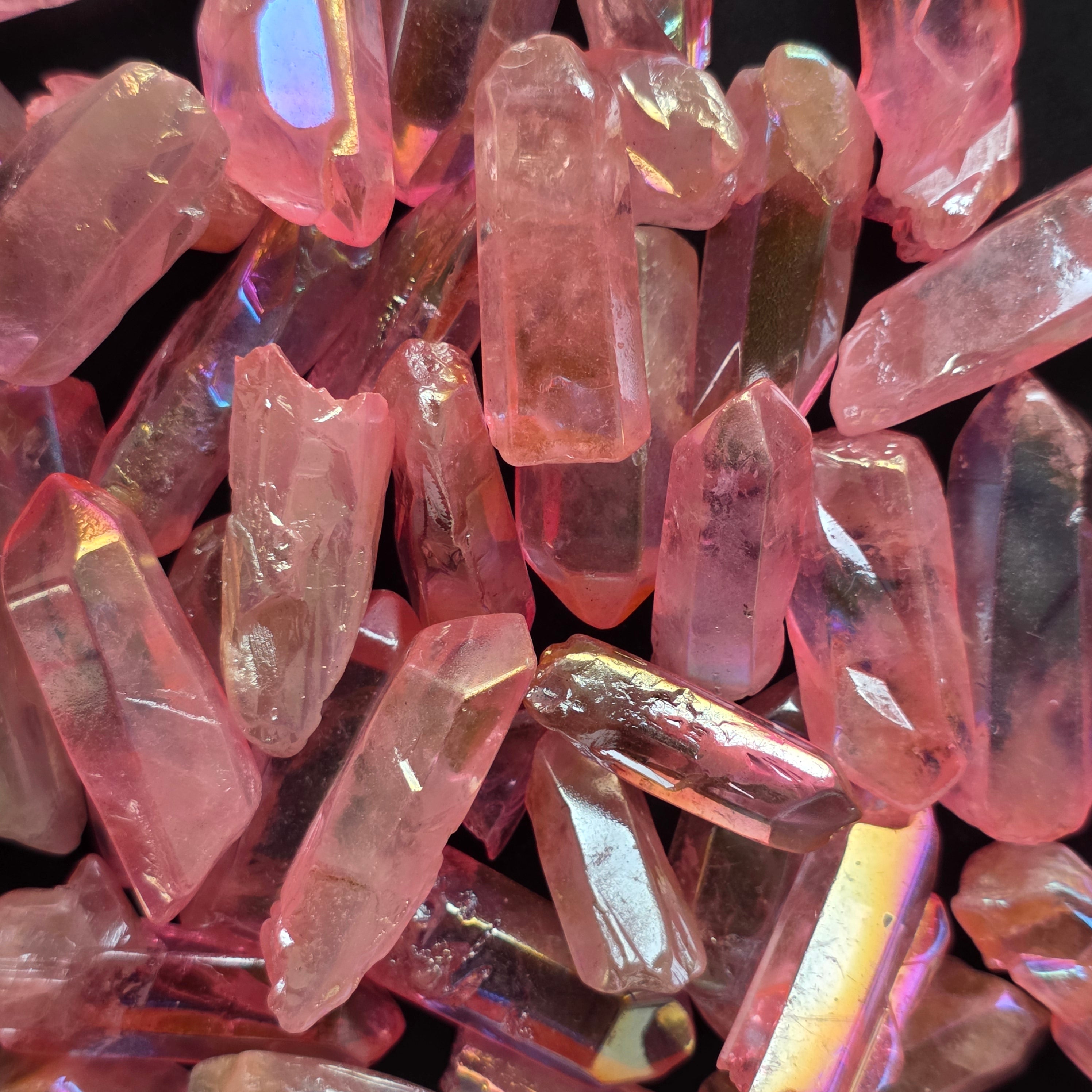 Ez a kvarc színezett, az úgynevezett aura bevonat folyamatával, hogy fokozza az irizáló fényeket és a kristály élénk energiáját.