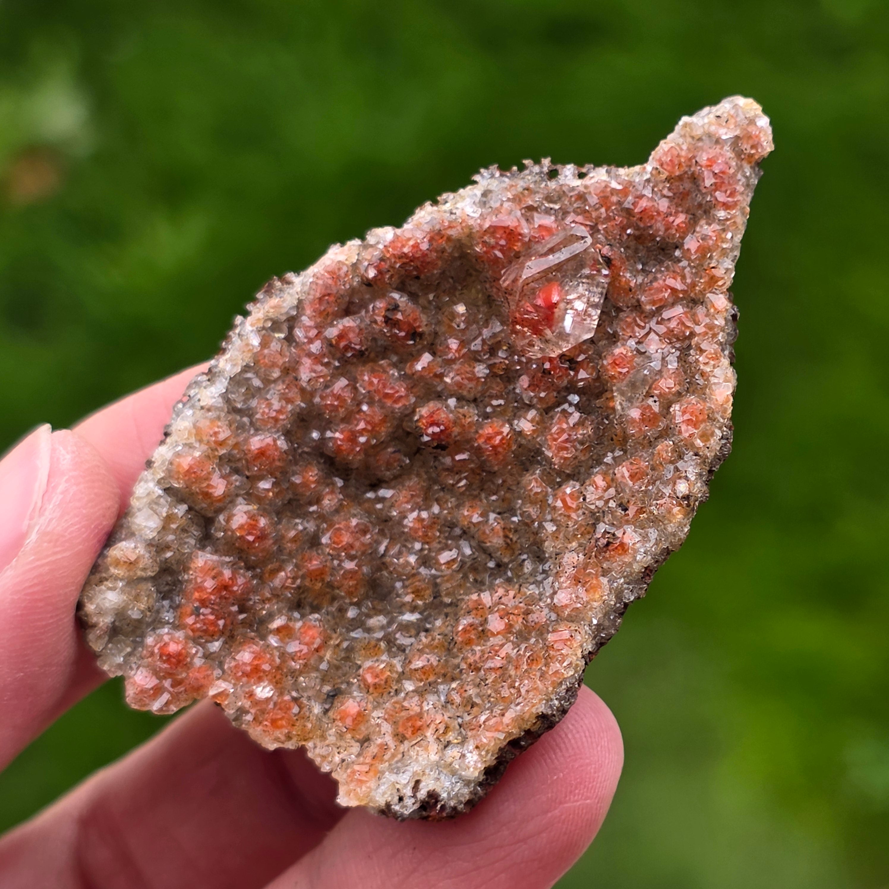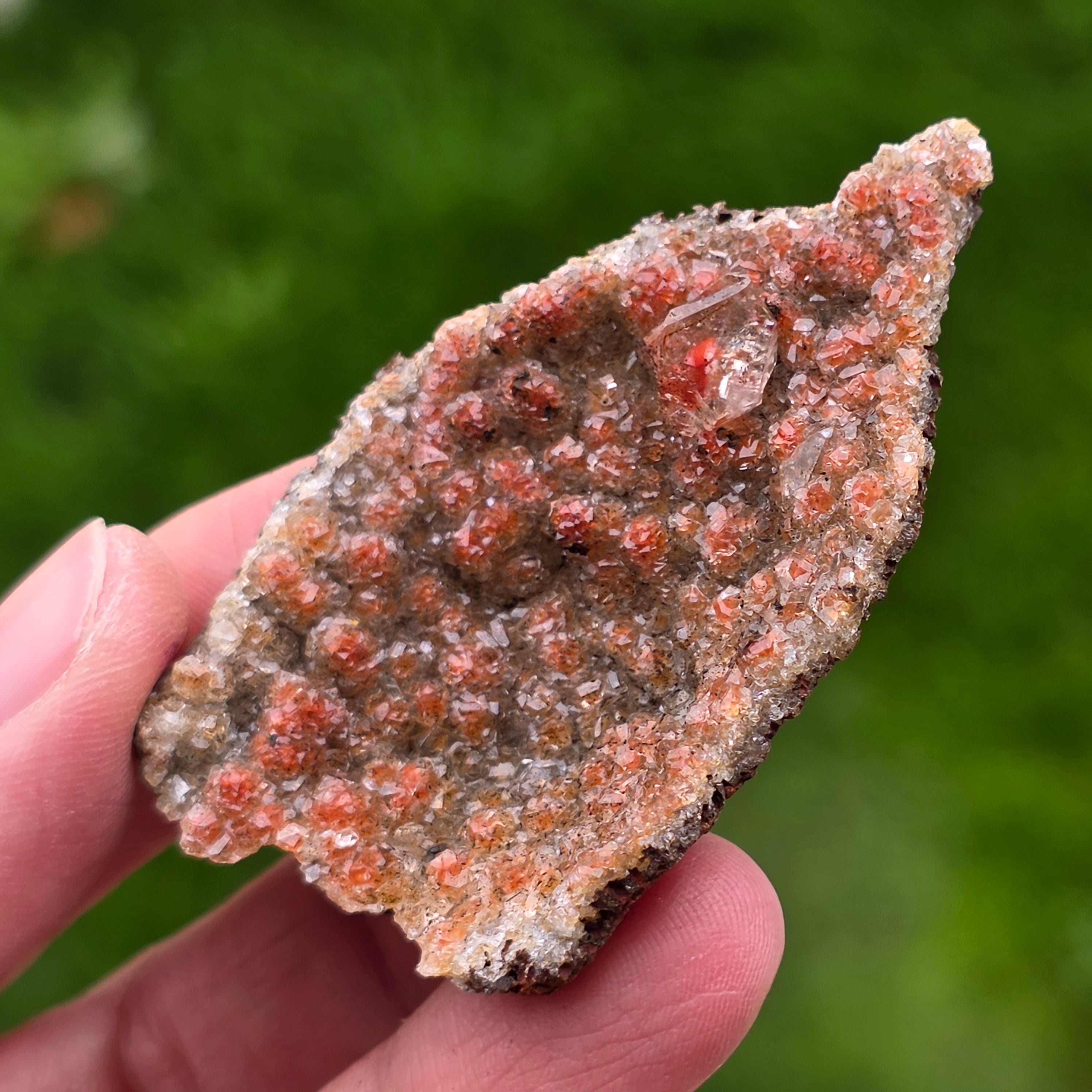 A kalcit kristályai a „gyémánt kalcit” nevű jellegzetes formát mutatják, amelyet a jól definiált élek és fényes síkokjellemeznek, amelyek finoman, de kifejező módon veri a fényt. A kristályok kompakt elrendezése csillogó felületet hoz létre, gazdag textúrával, minden darab különbözik alakban, színerősségben és a kristályok eloszlásában.