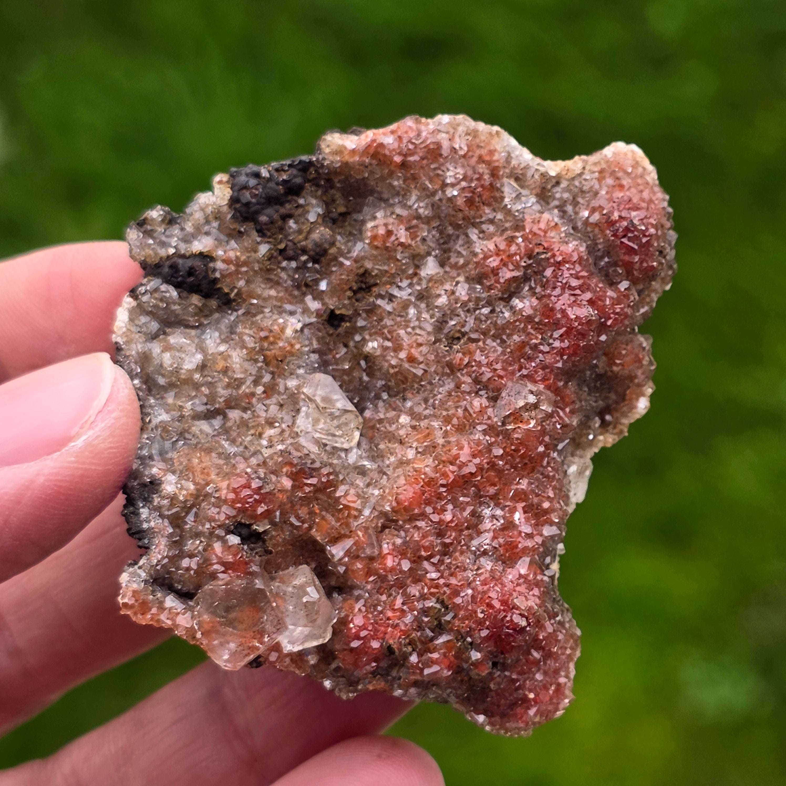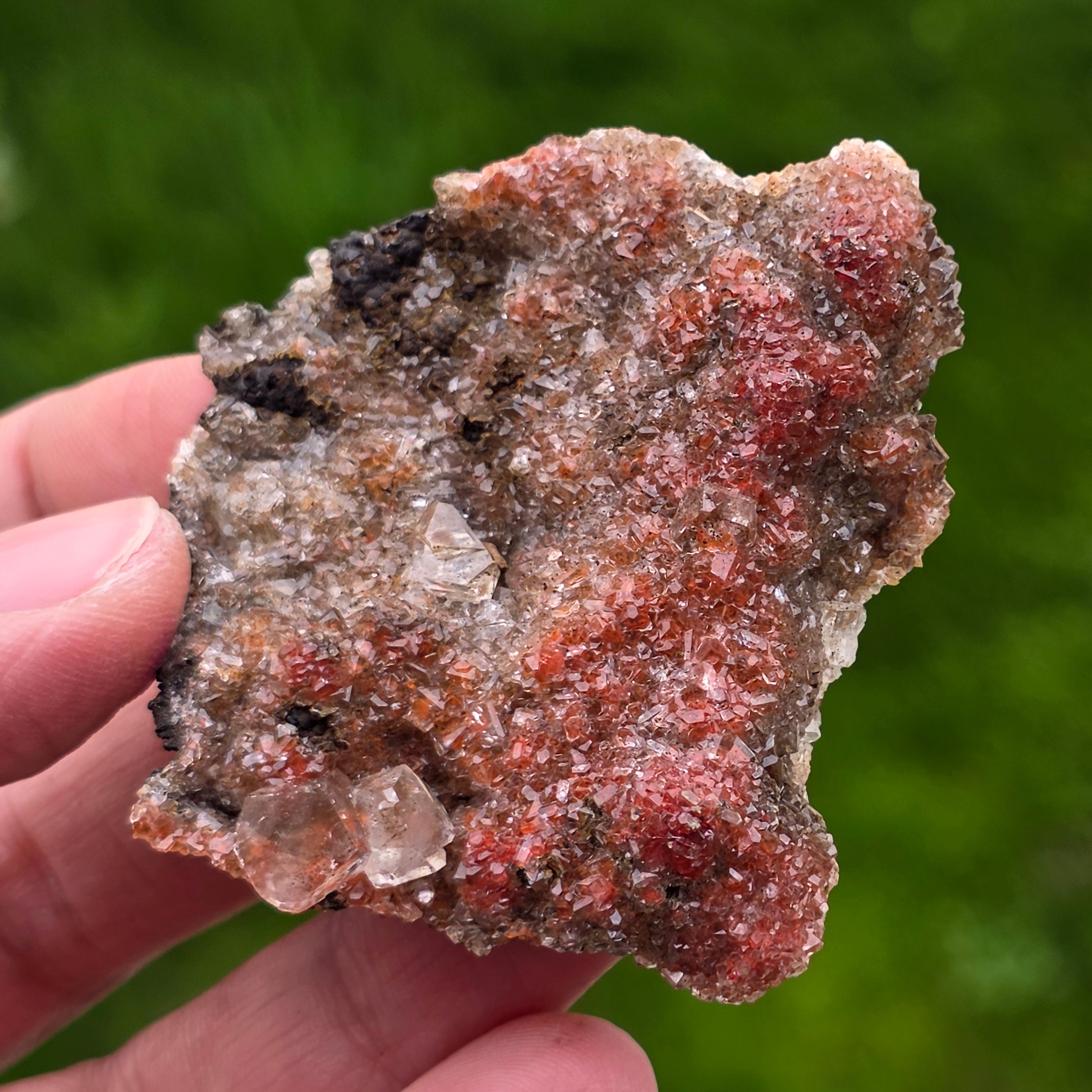 A kalcit kristályok a „gyémánt kalcit” nevű jellegzetes formát mutatják, jól definiált csúcsokkal és csillogó felületekkel, amelyek finoman, de kifejezően tükrözik a fényt. A kristályok tömör elrendezése csillogó, gazdag textúrájú felületet hoz létre, minden darab különböző alakú, különböző színintenzitású és kristályeloszlású.