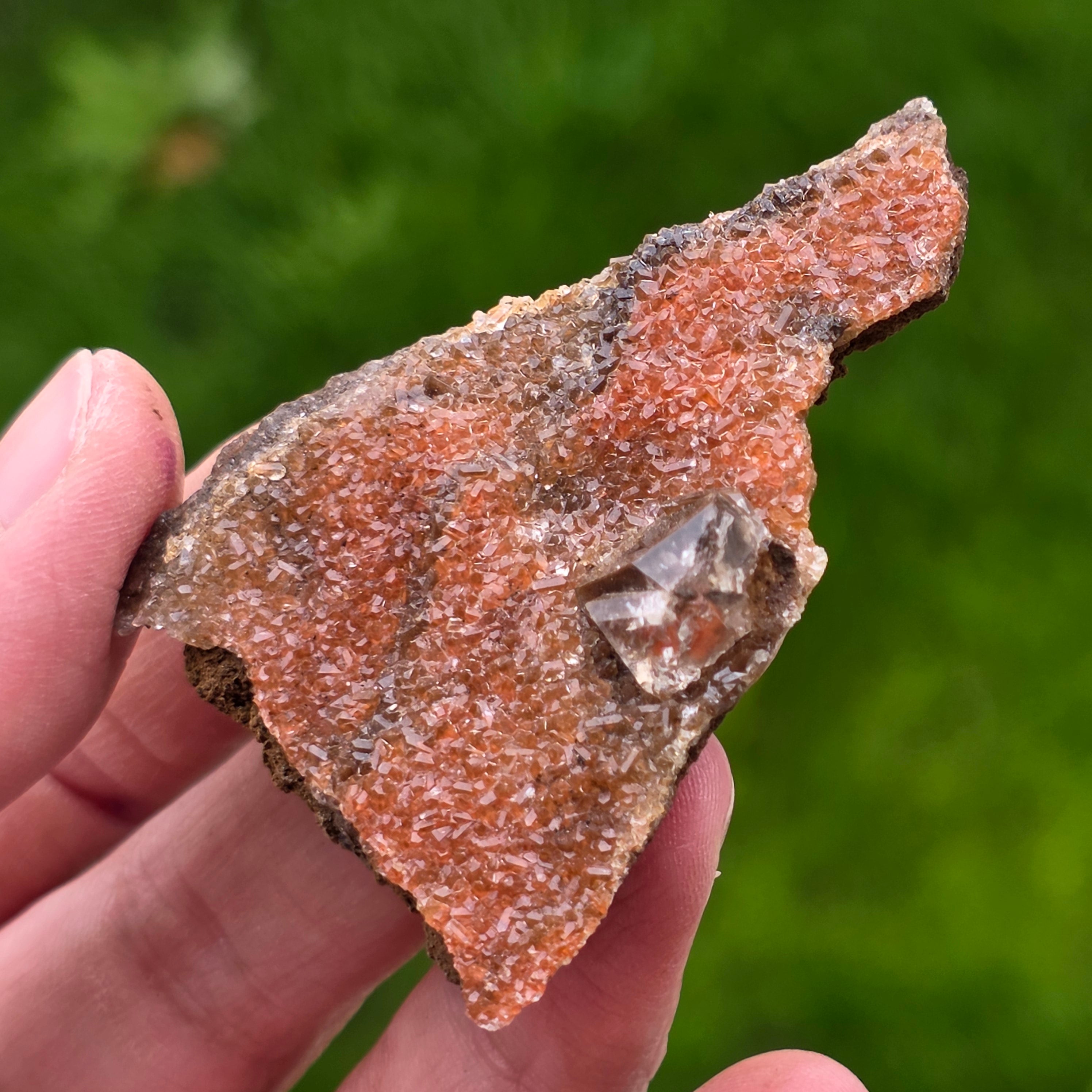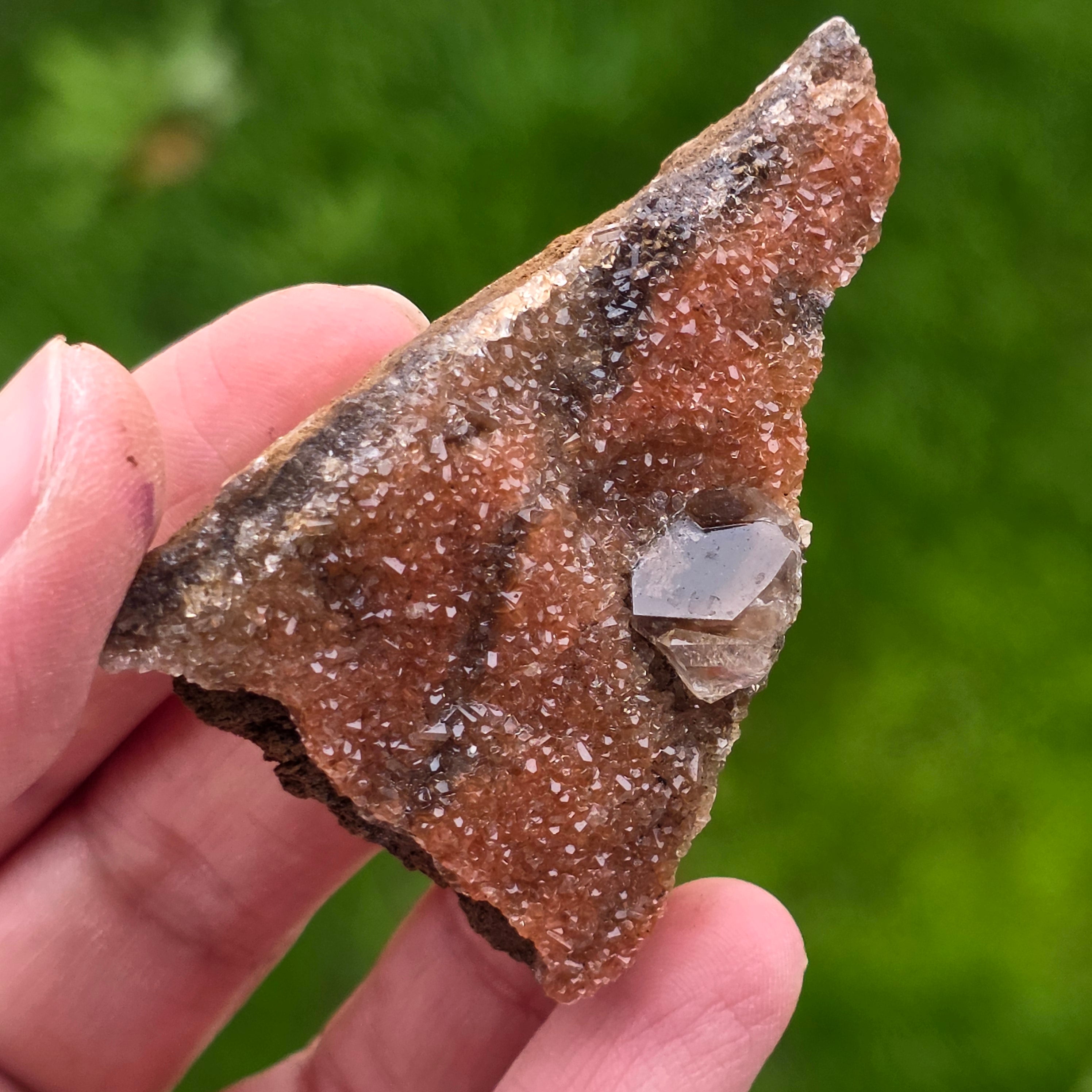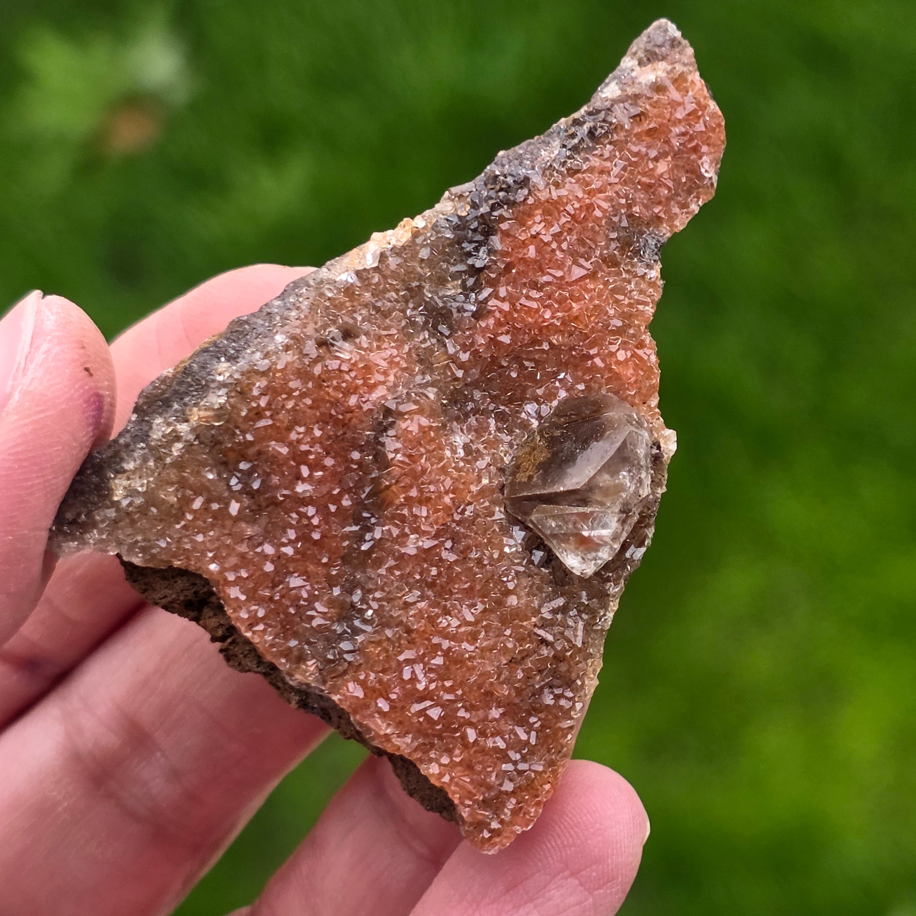 A kalcit kristályok a „gyémánt kalcit” nevű jellegzetes formát mutatják, amelyet jól meghatározott csúcsok és fényes lapokjellemeznek, amelyek finoman, de kifejezően verik vissza a fényt. A kristályok kompakt elrendezése csillogó felületet hoz létre, gazdag textúrával, minden darab formájában, színintenzitásában és kristályeloszlásában eltérő.