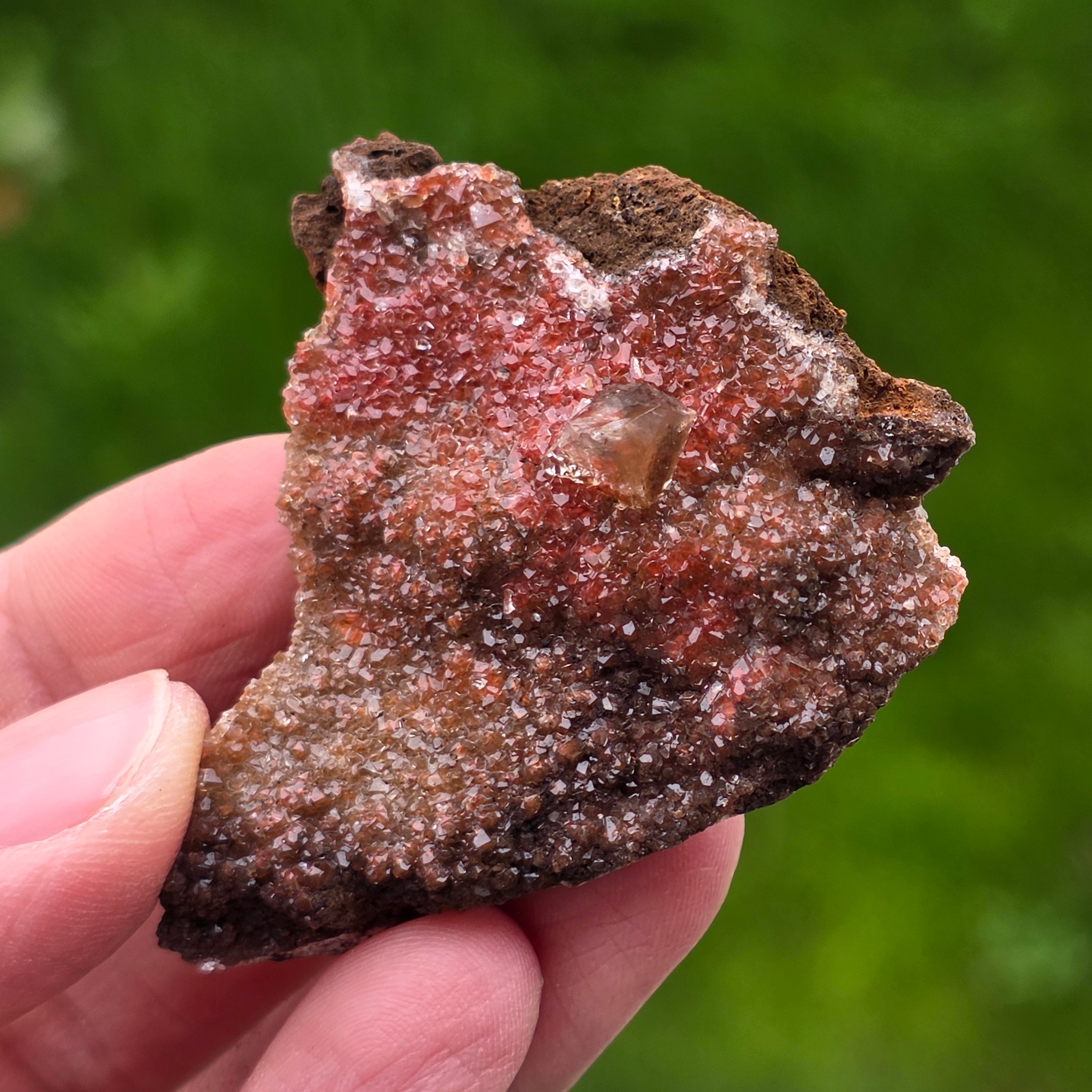 A kalcit kristályok azt a speciális „gyémántkalcit” formát mutatják, amelyet jól definiált végek és fényes felületek jellemeznek, amelyek a fényt finoman, de kifejező módon tükrözik. A kristályok kompakt elrendezése csillogó, gazdag textúrájú felületet hoz létre, minden darab eltér a formájában, színintenzitásában és a kristályok eloszlásában.